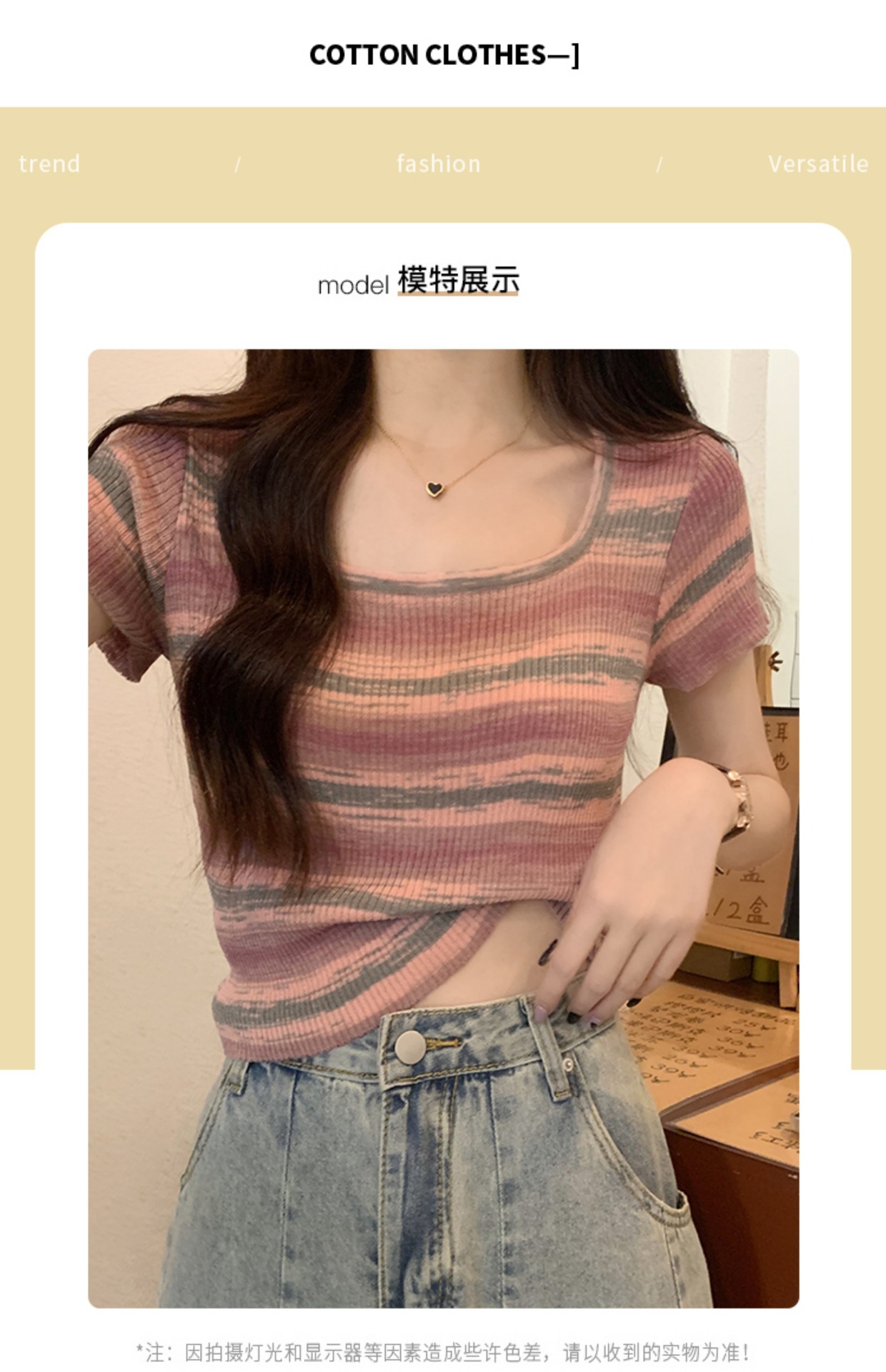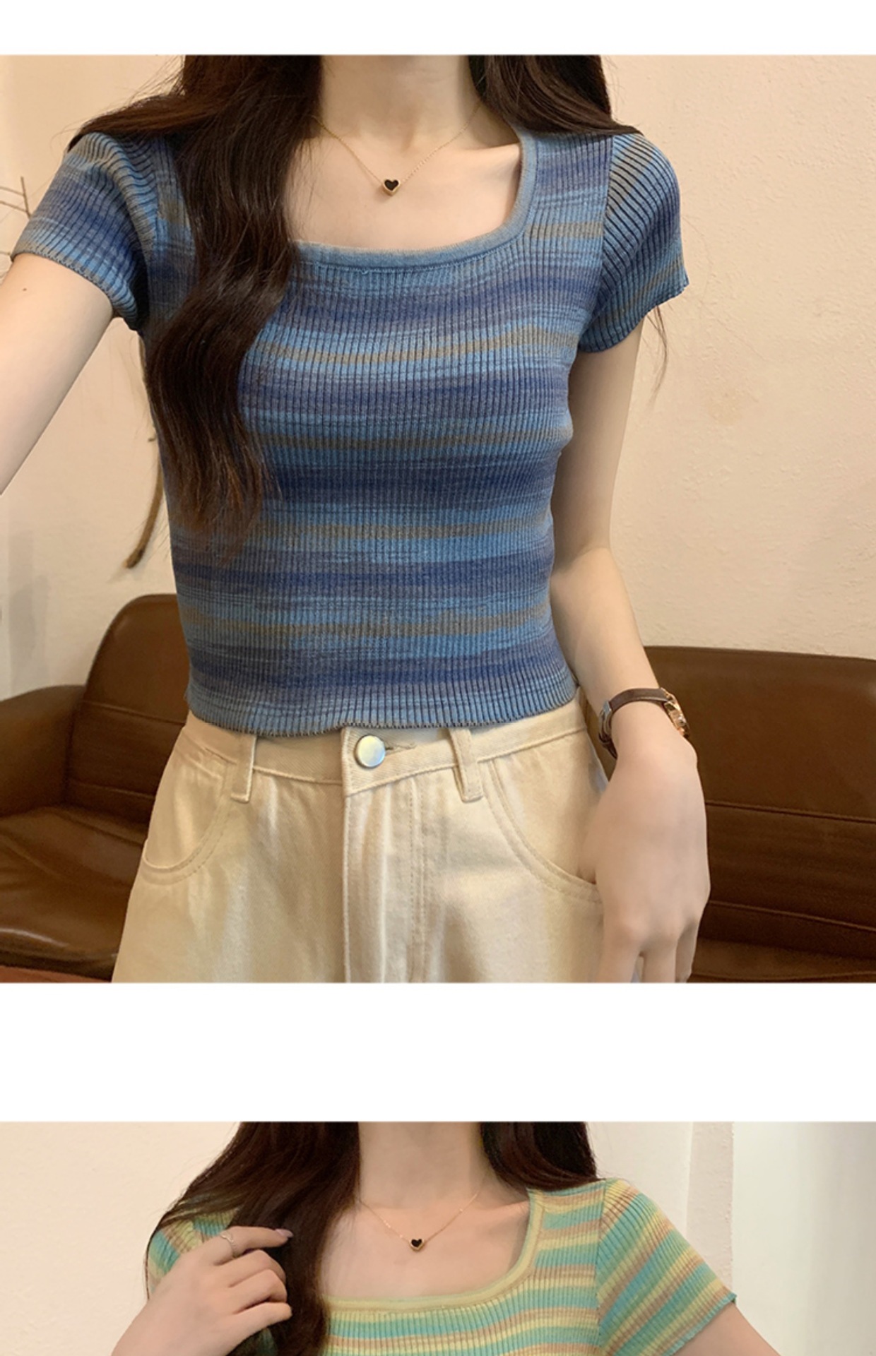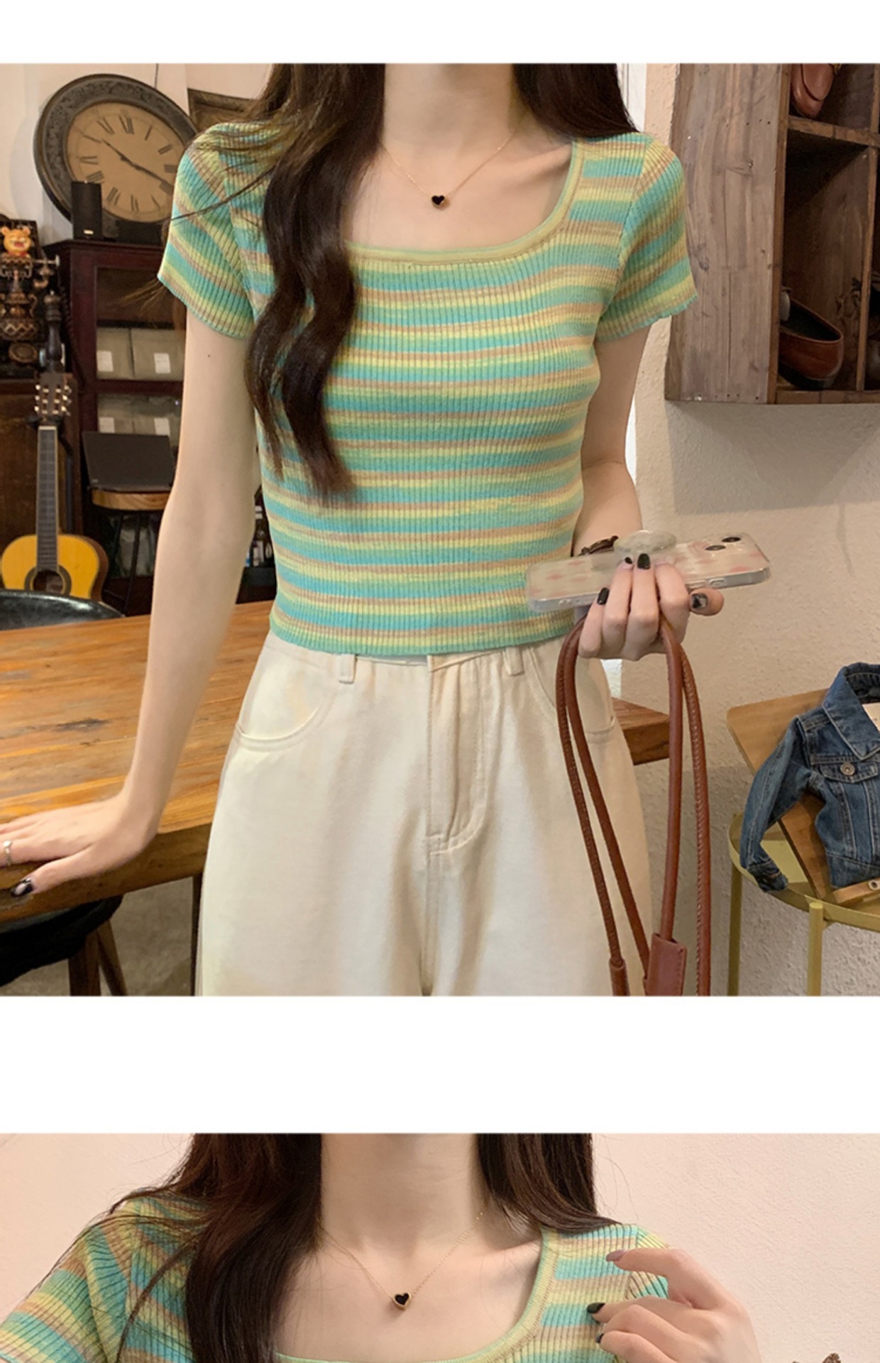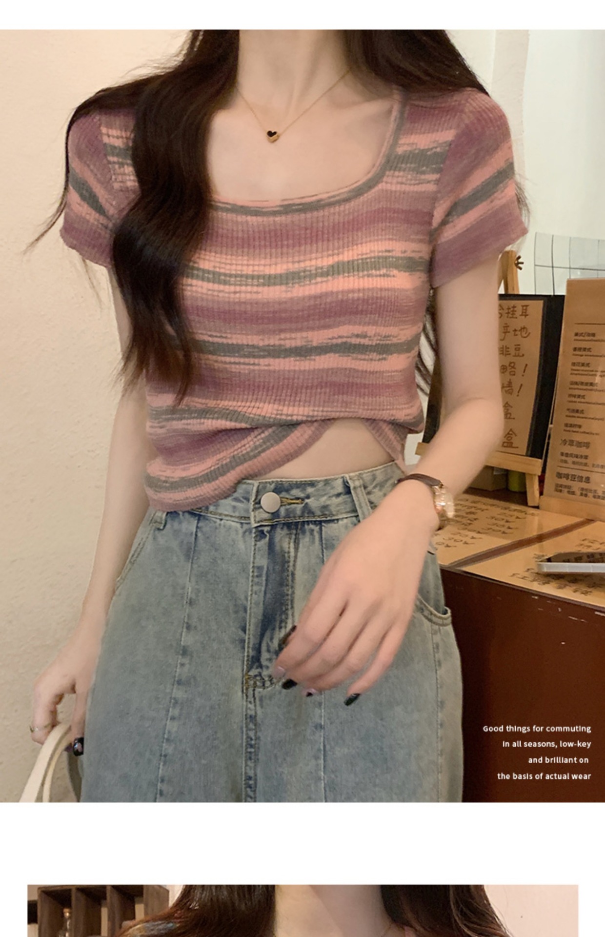 디자인 센스 스퀘어 칼라 스트라이프 반팔 스웨터 여성 티셔츠 얇은 여름 2025 새로운 어깨 슬리밍 쇼트 탑스토어 가기