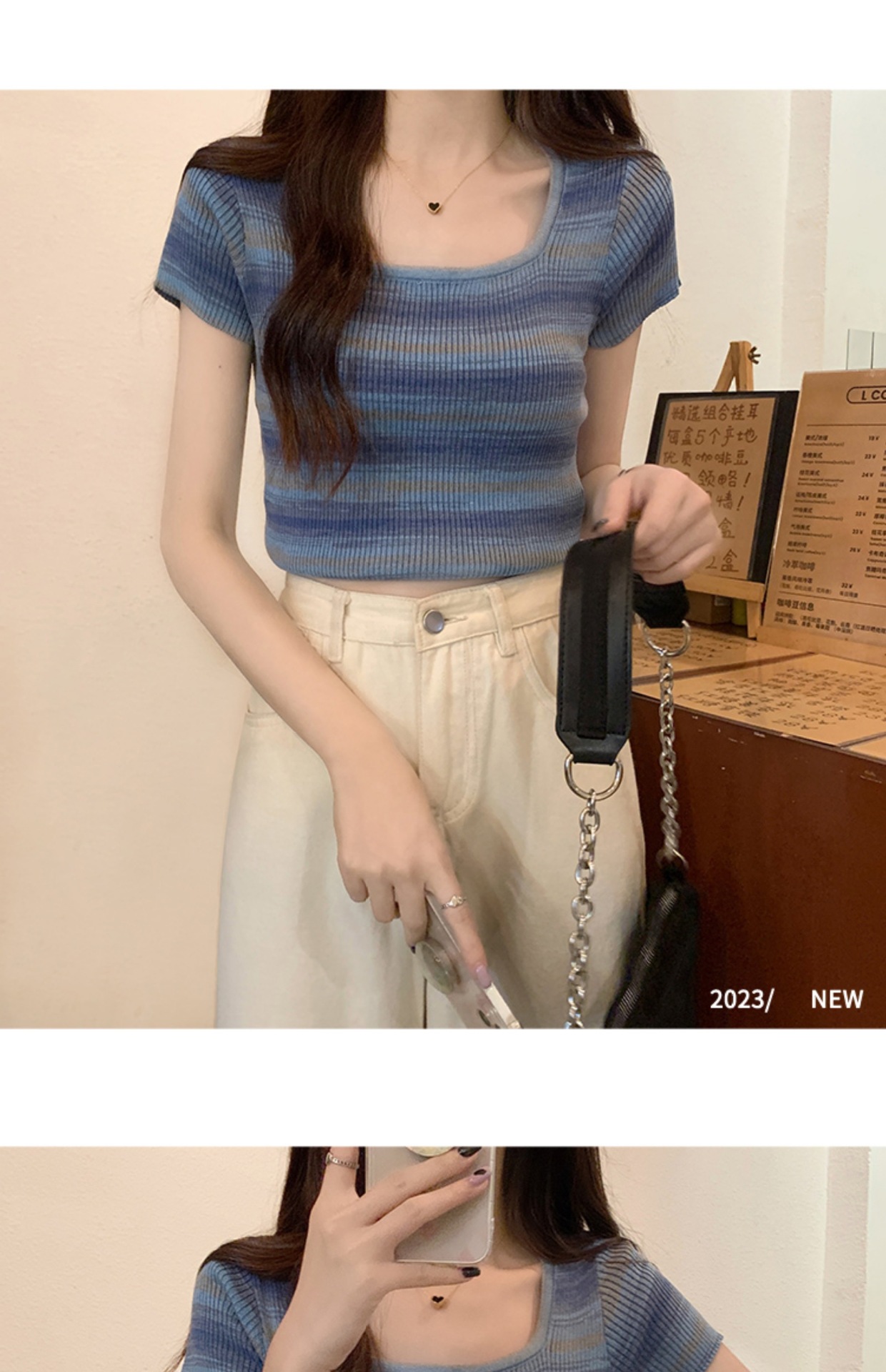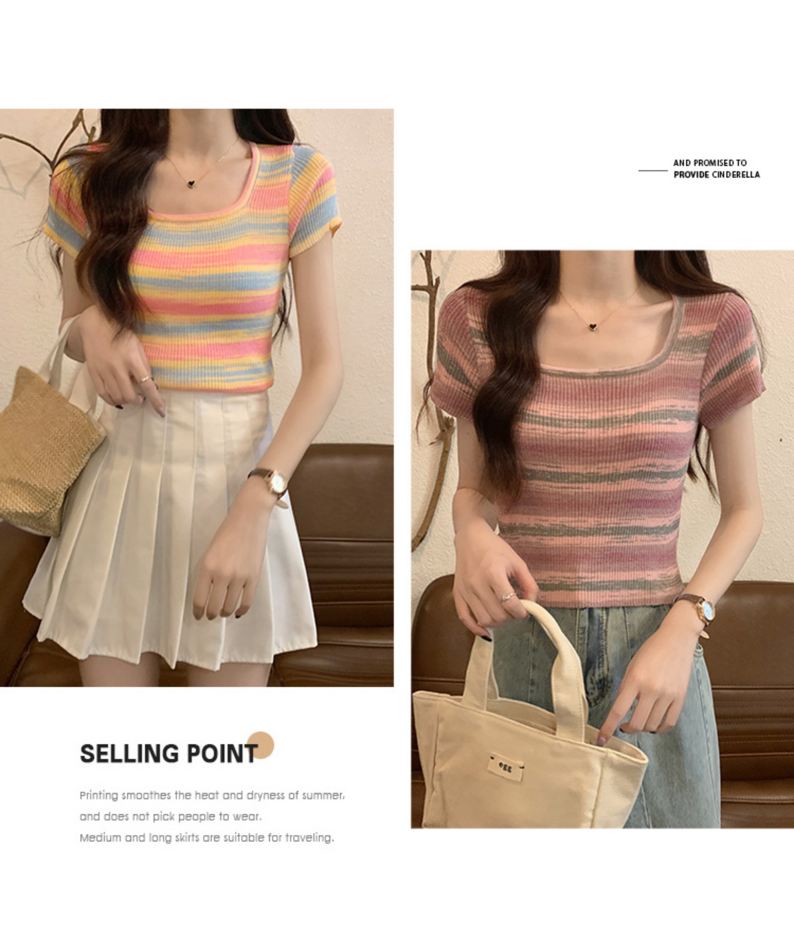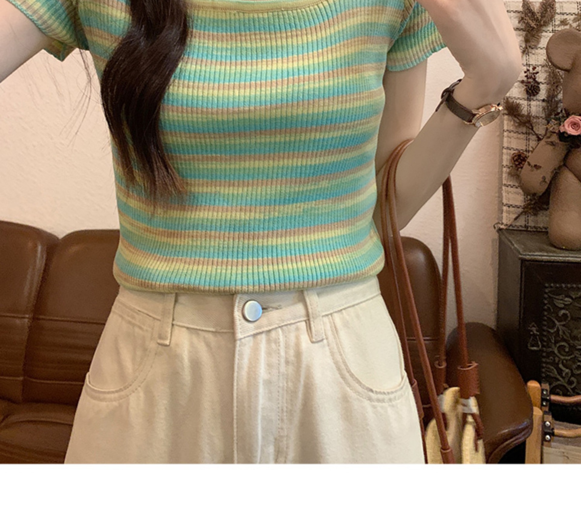 디자인 센스 스퀘어 칼라 스트라이프 반팔 스웨터 여성 티셔츠 얇은 여름 2025 새로운 어깨 슬리밍 쇼트 탑스토어 가기