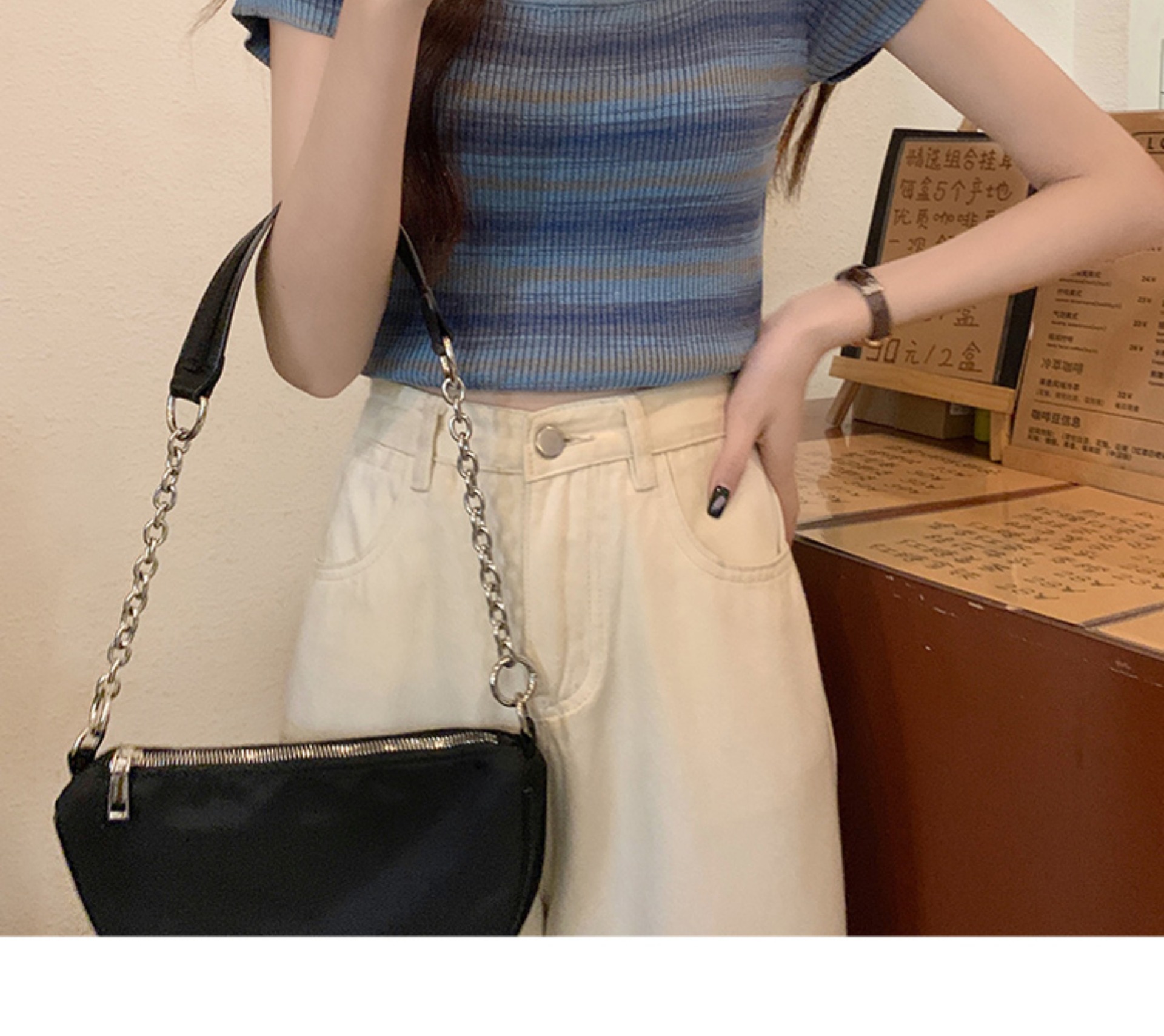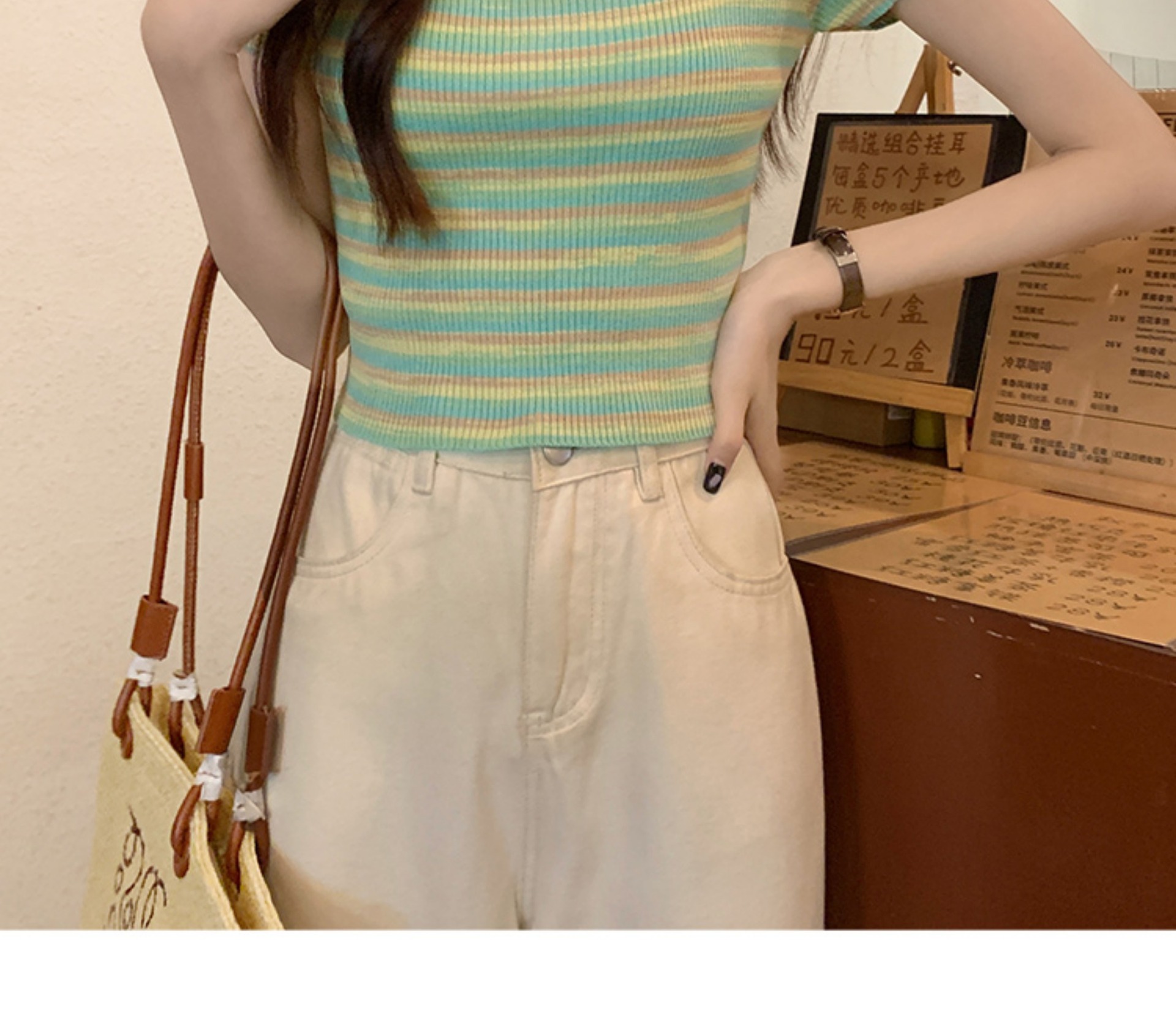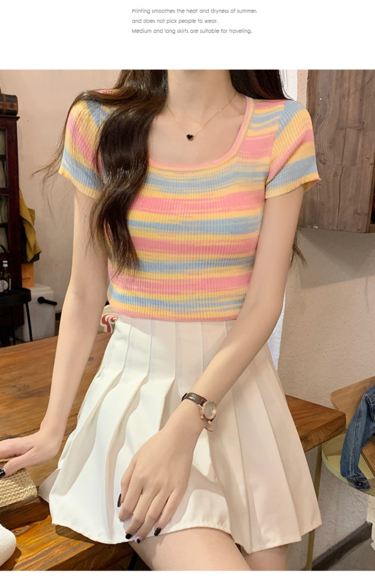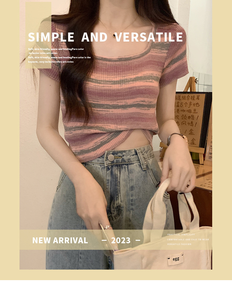 디자인 센스 스퀘어 칼라 스트라이프 반팔 스웨터 여성 티셔츠 얇은 여름 2025 새로운 어깨 슬리밍 쇼트 탑스토어 가기