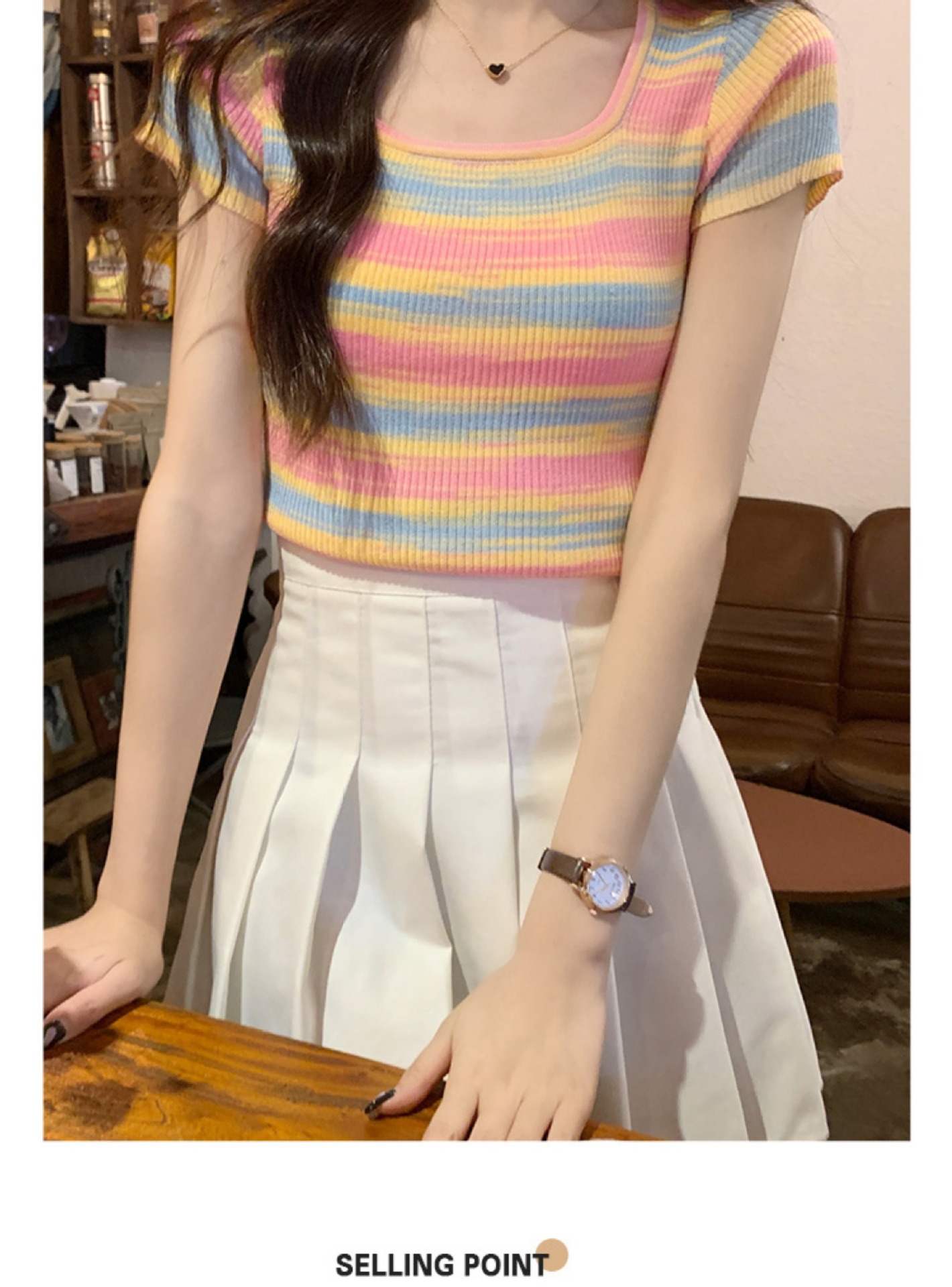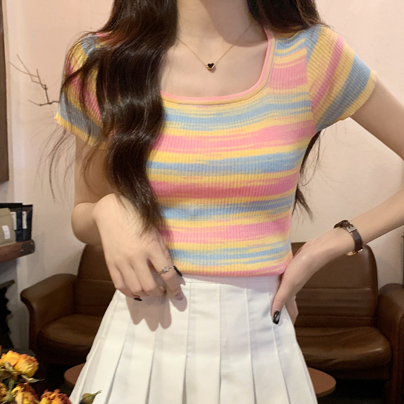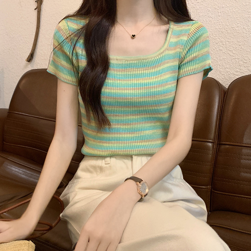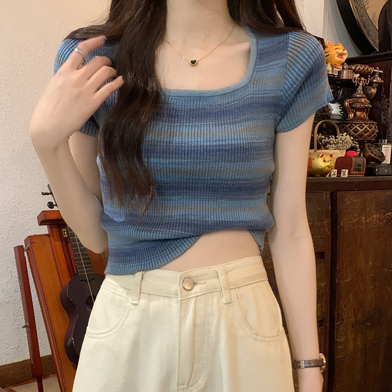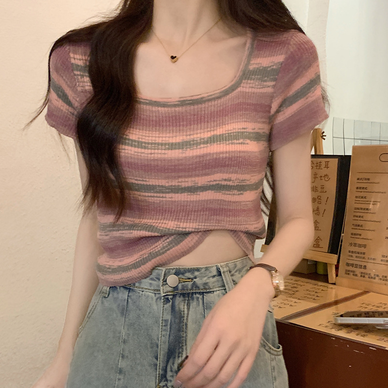 디자인 센스 스퀘어 칼라 스트라이프 반팔 스웨터 여성 티셔츠 얇은 여름 2025 새로운 어깨 슬리밍 쇼트 탑