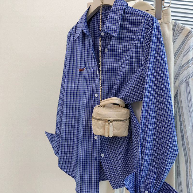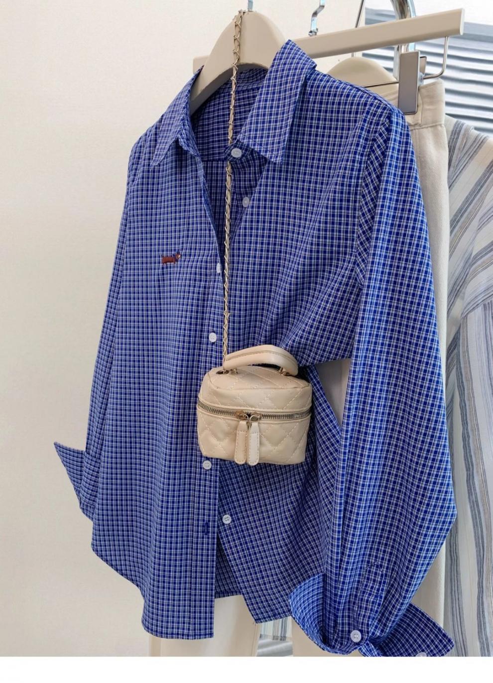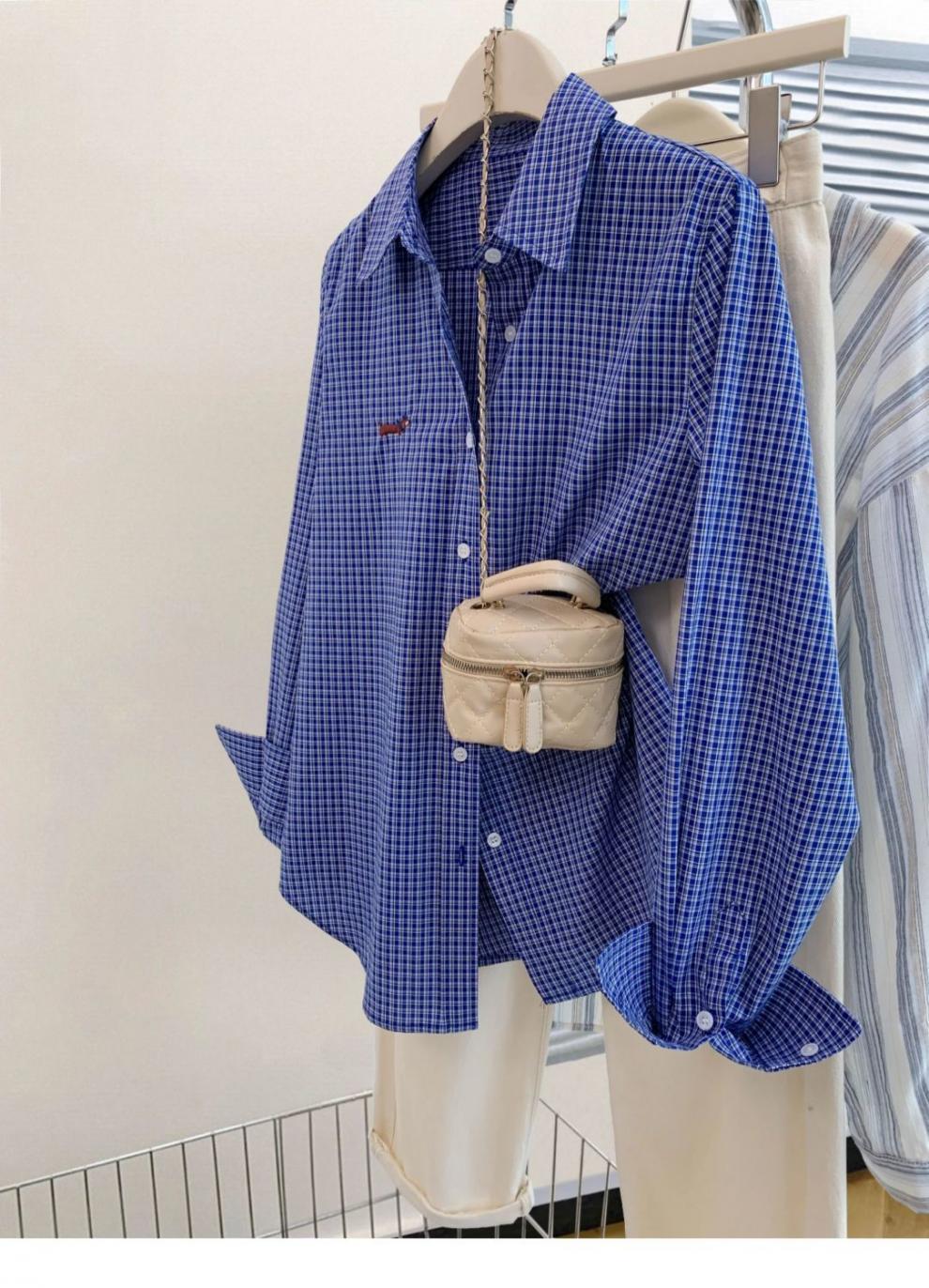 파란 격자 무늬 긴팔 셔츠 코트 여성의 가을 이른 가을 느슨한 작은 어깨 셔츠 2024 새로운 탑스토어 가기
