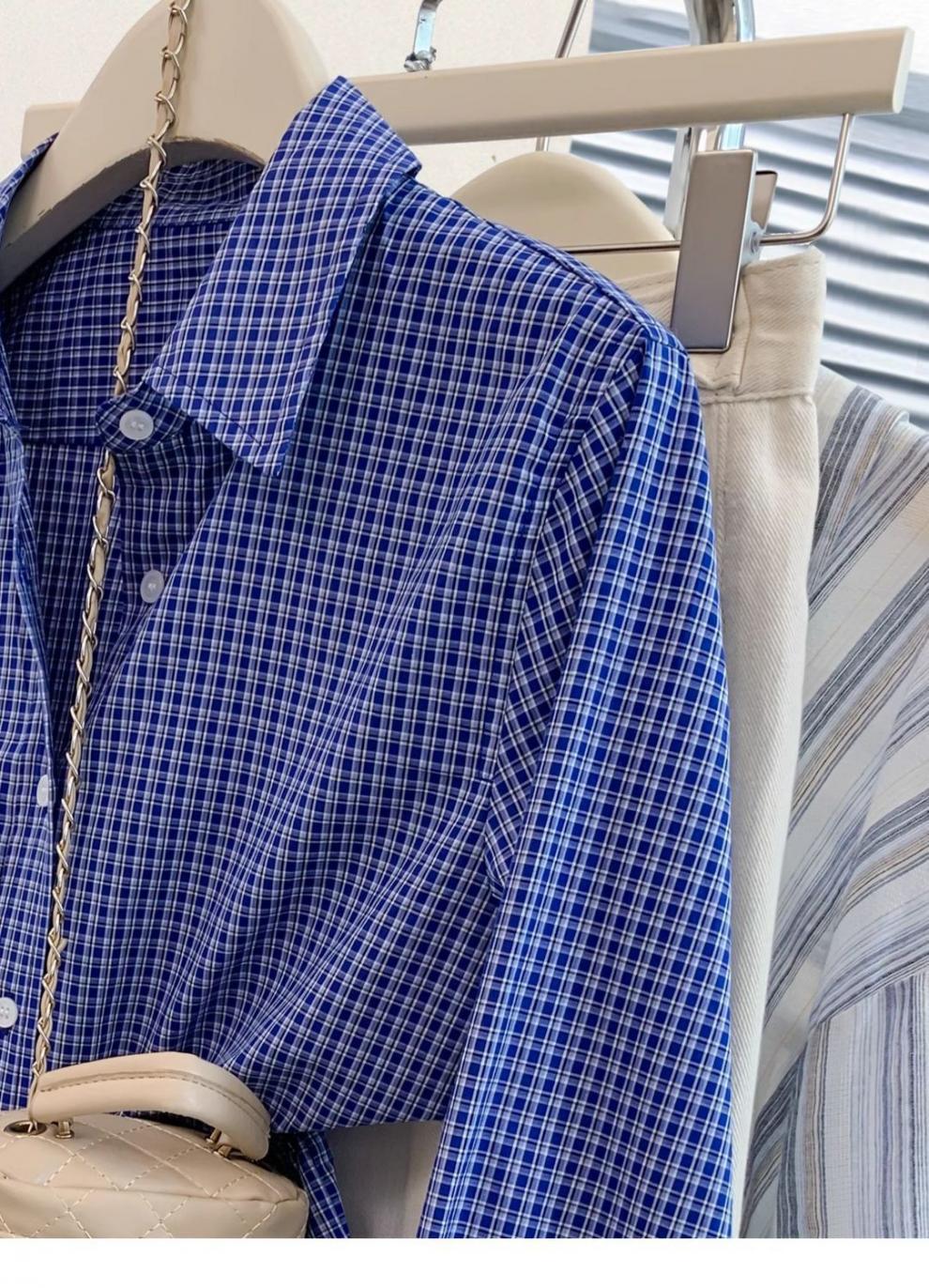 파란 격자 무늬 긴팔 셔츠 코트 여성의 가을 이른 가을 느슨한 작은 어깨 셔츠 2024 새로운 탑