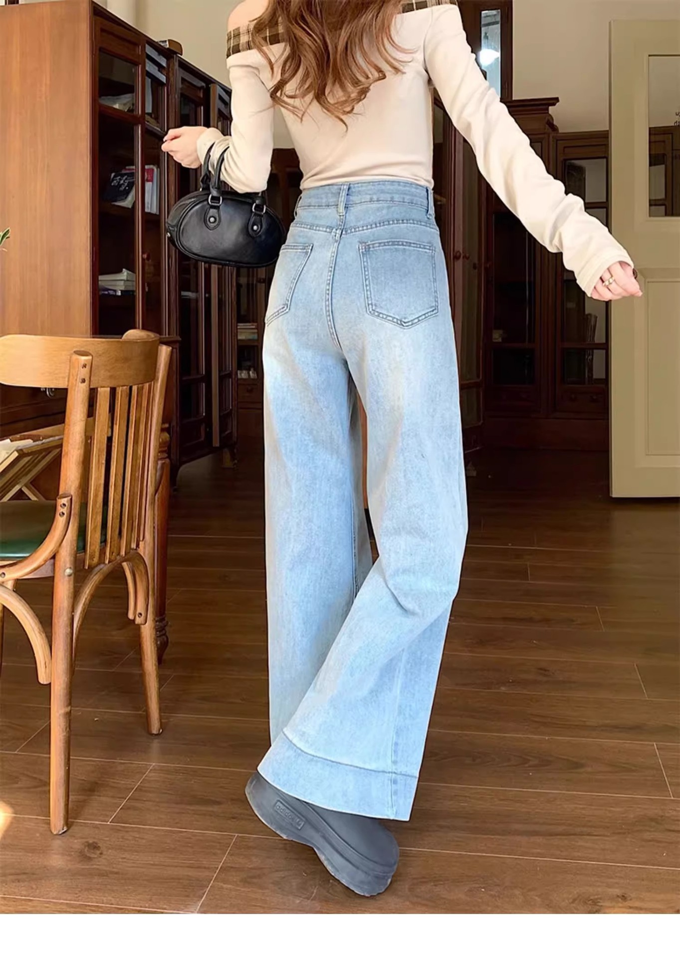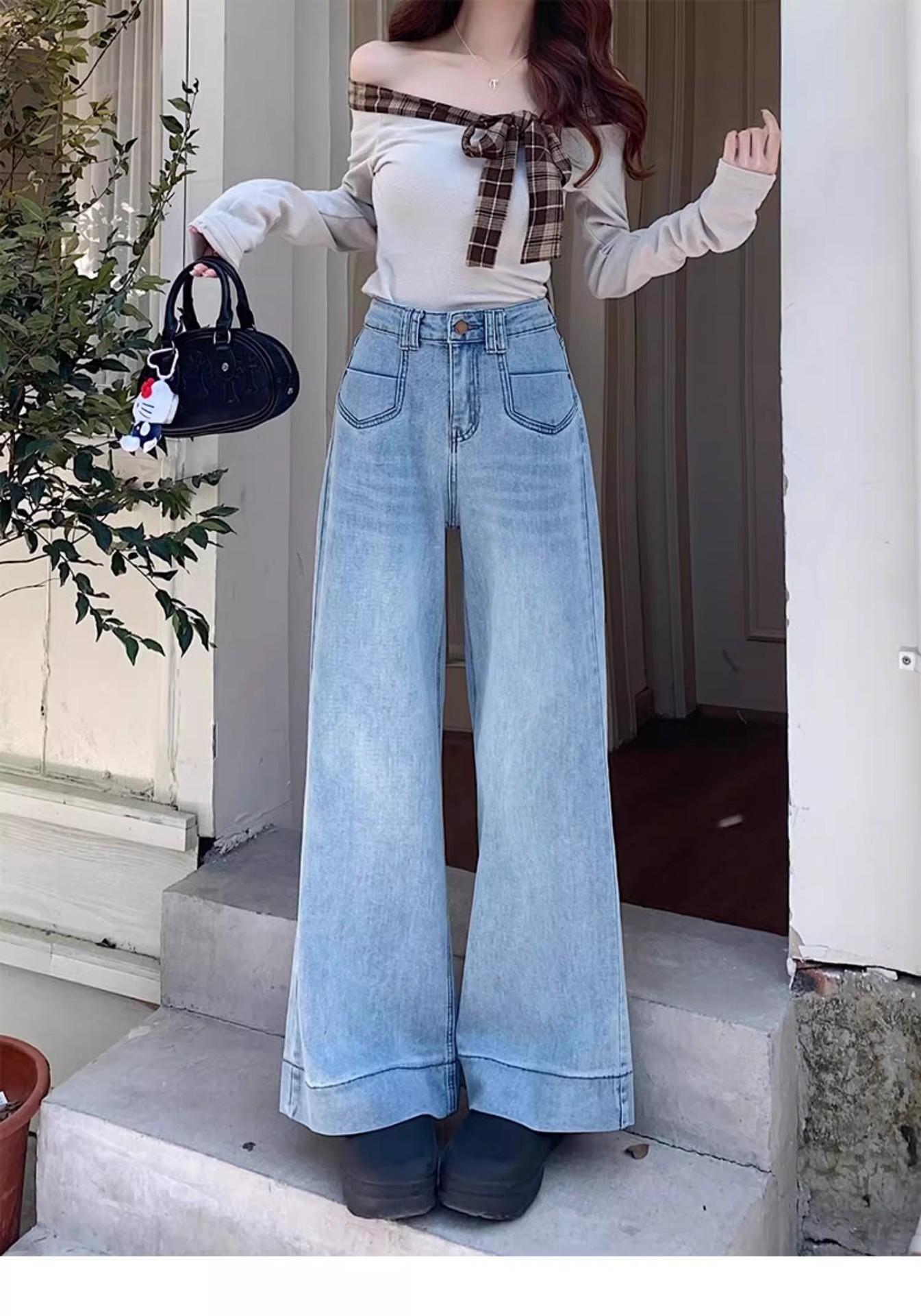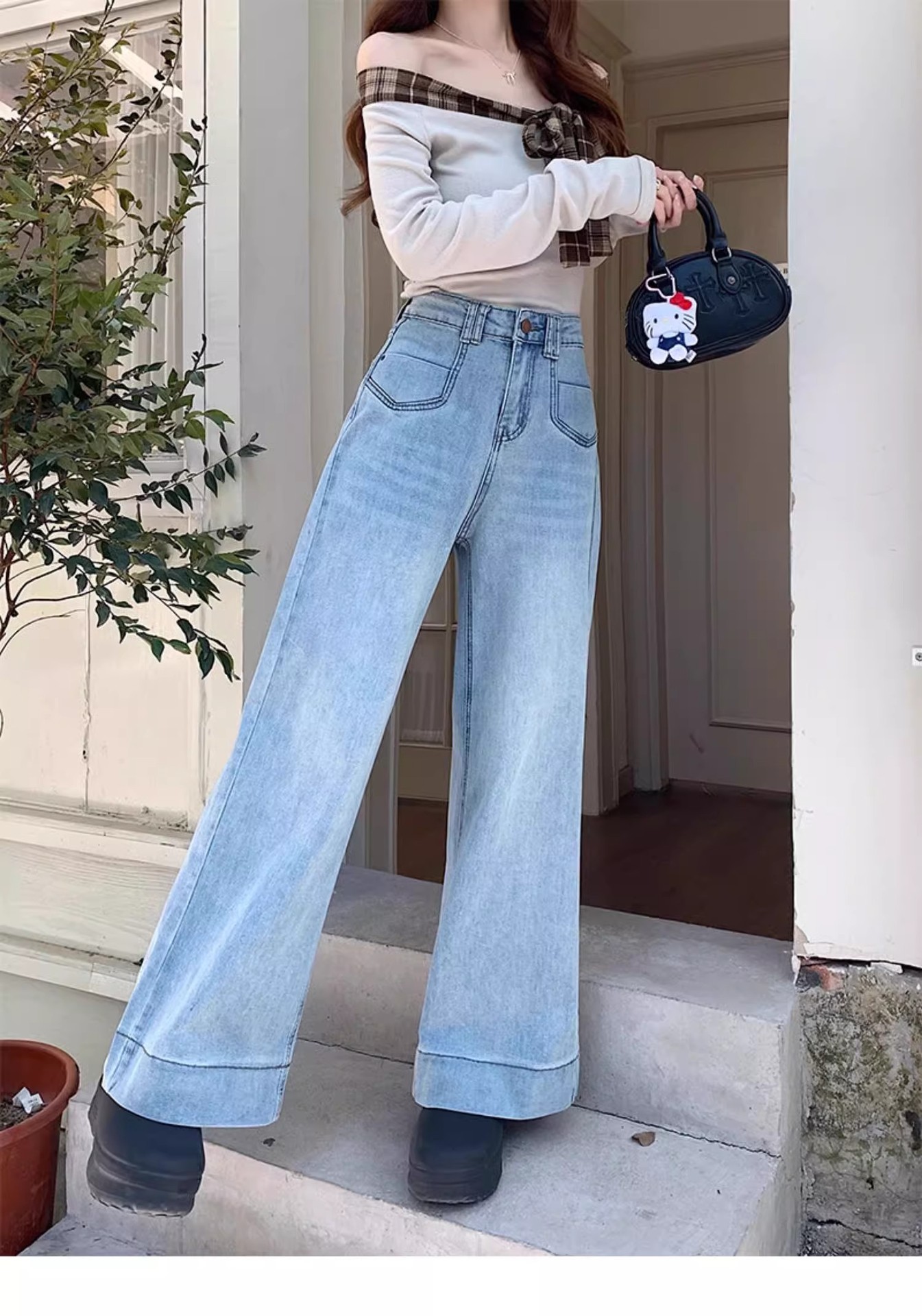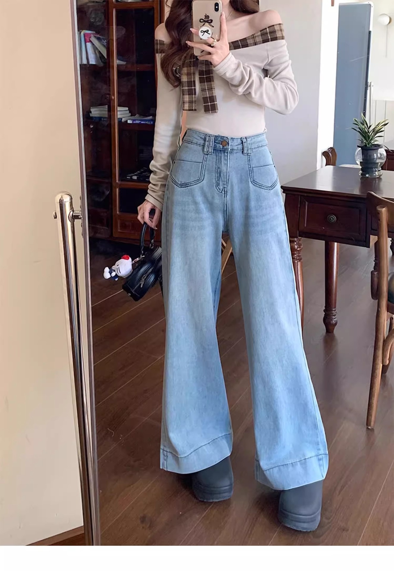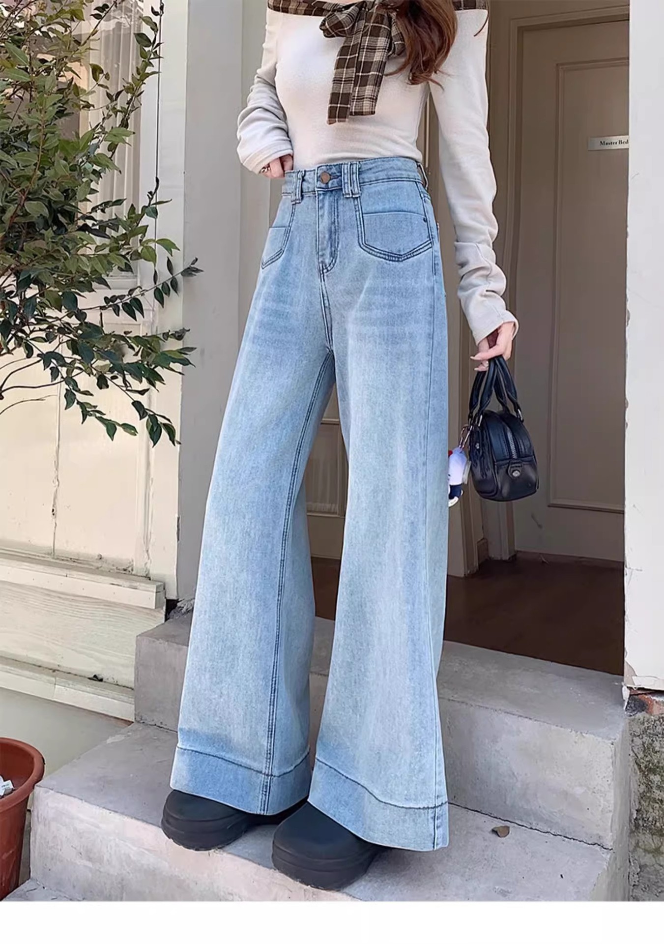 플러스 사이즈 높은 허리 마이크로 플레어 청바지 여성의 봄과 여름 통통녀 배 모양의 몸 느슨한 슬림 스트레이트 레그 와이드 레그 바지스토어 가기