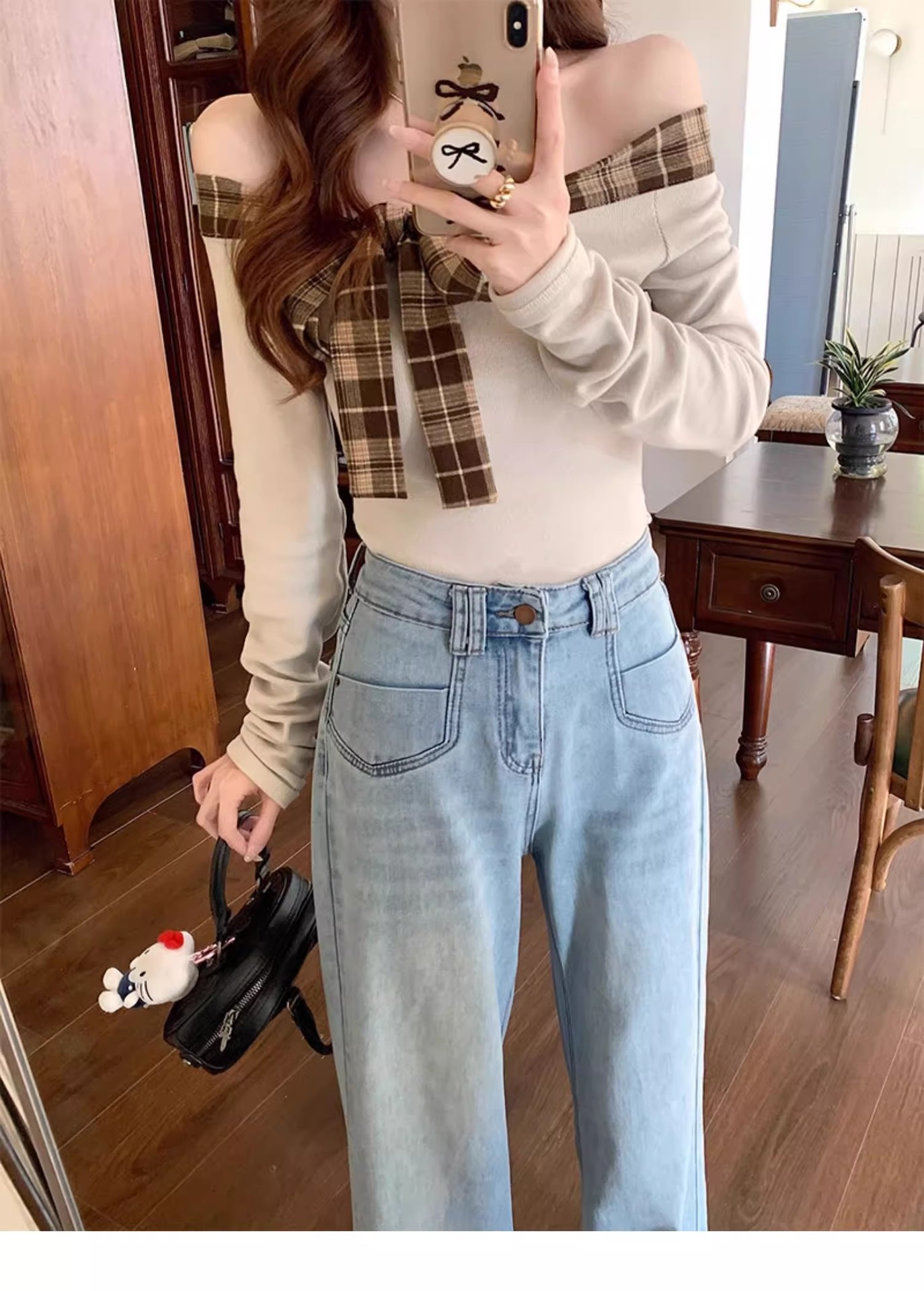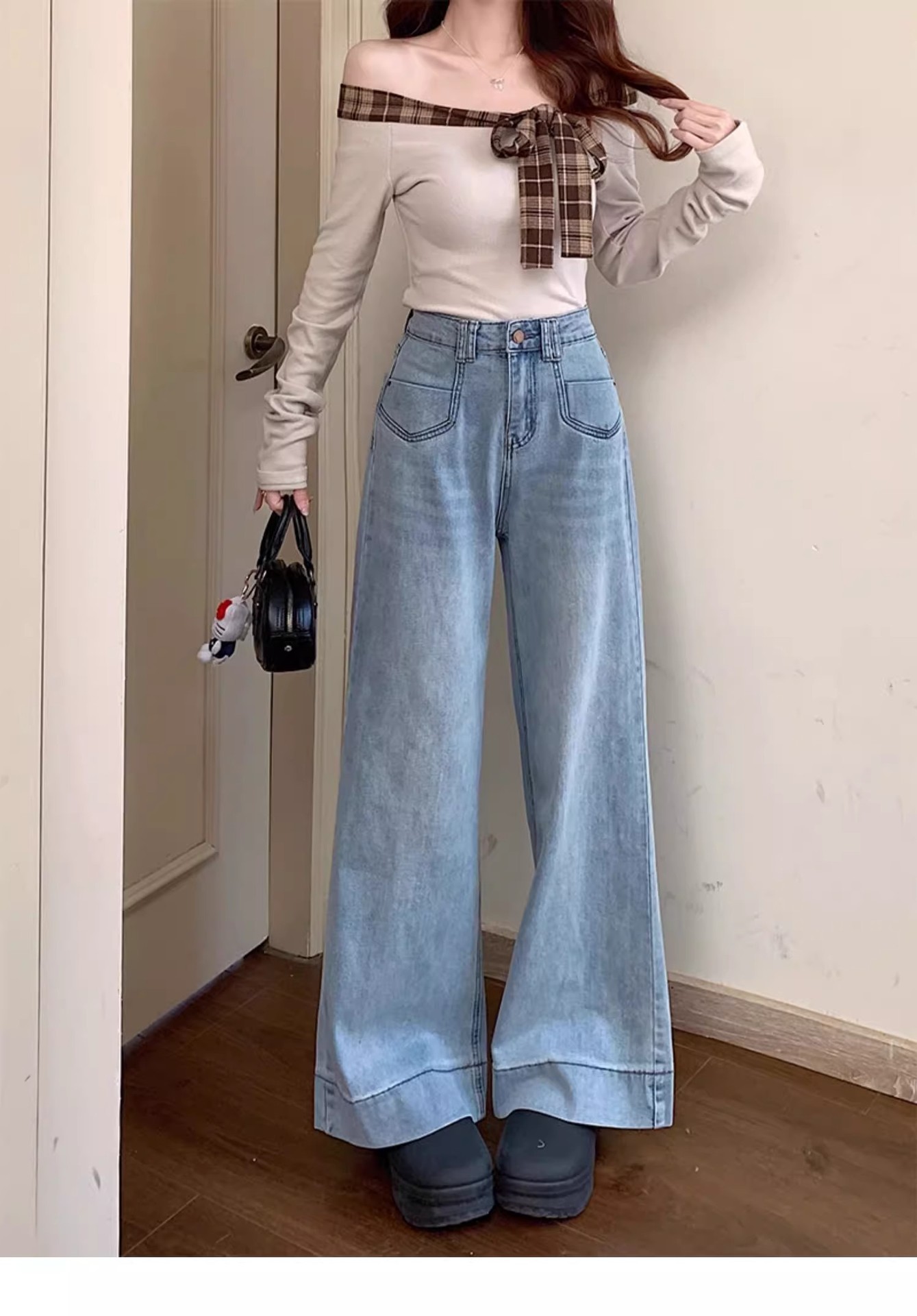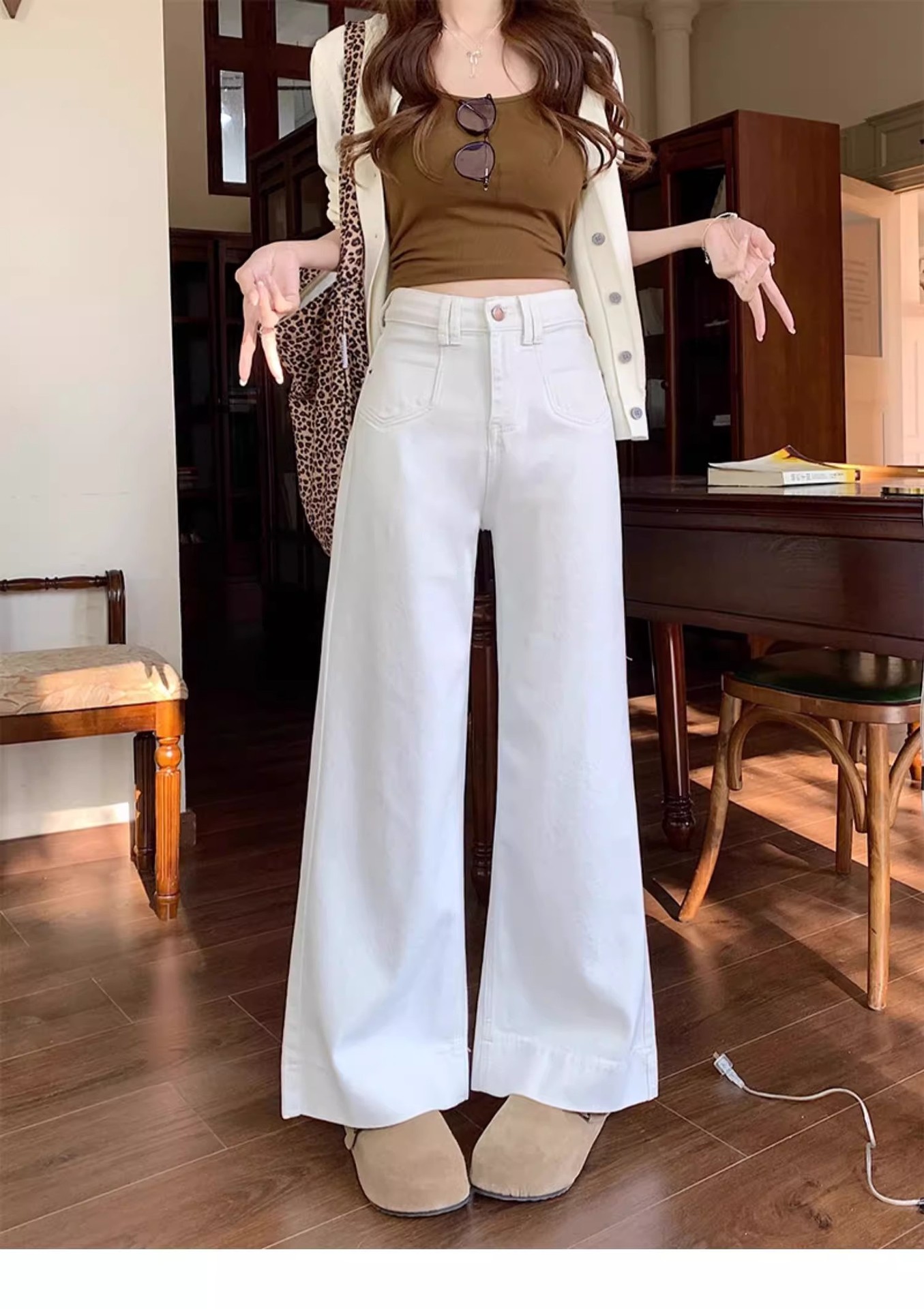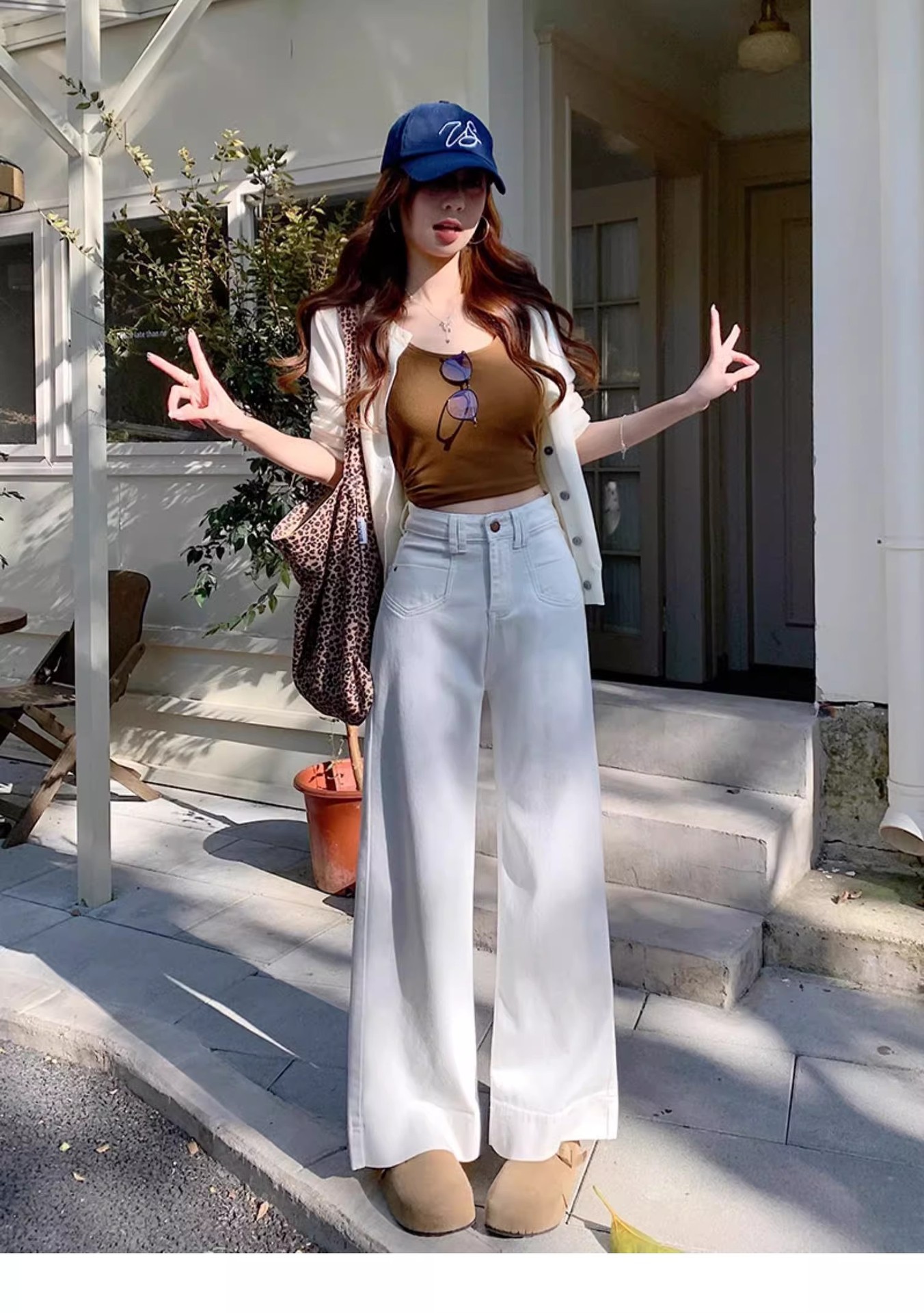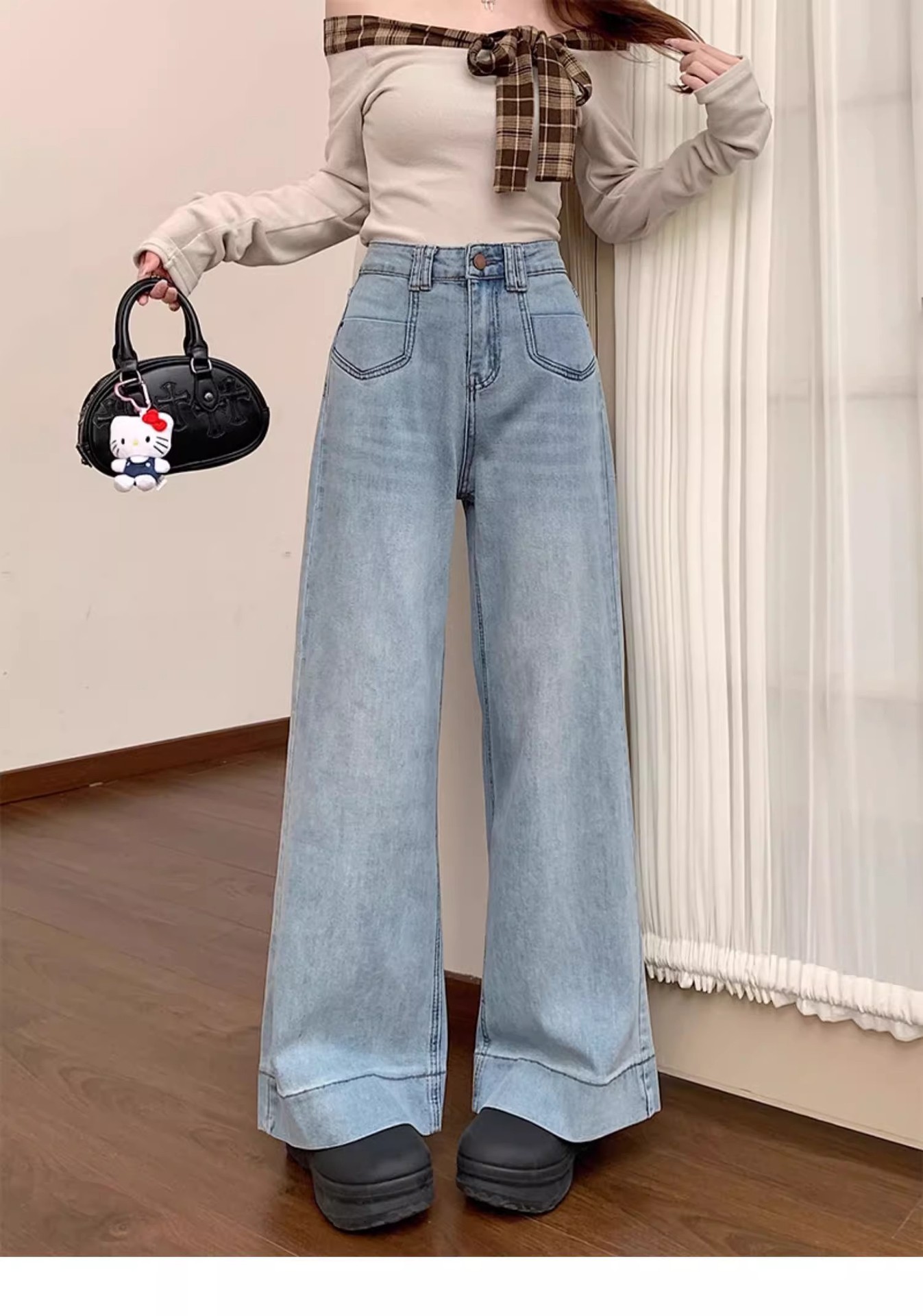 플러스 사이즈 높은 허리 마이크로 플레어 청바지 여성의 봄과 여름 통통녀 배 모양의 몸 느슨한 슬림 스트레이트 레그 와이드 레그 바지스토어 가기