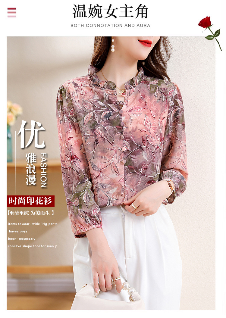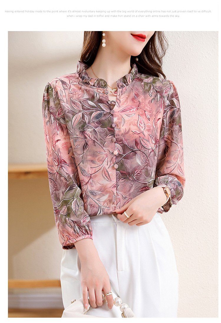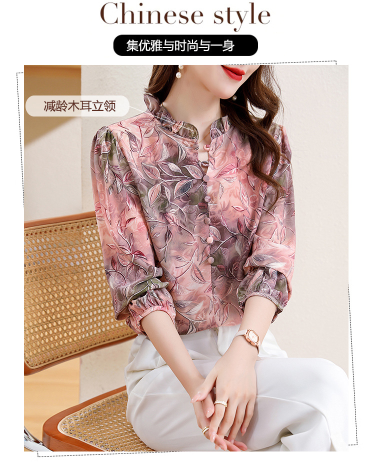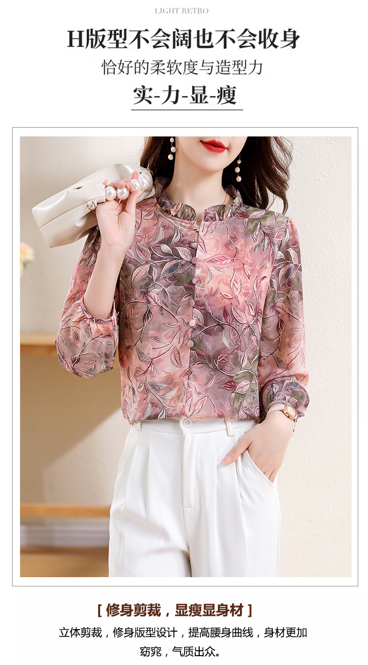 2025 봄 긴 소매 새로운 중국 스타일 국가 스타일 디자인 센스 기질 인쇄 목재 귀 칼라 셔츠 유행 최고 여성 도매스토어 가기