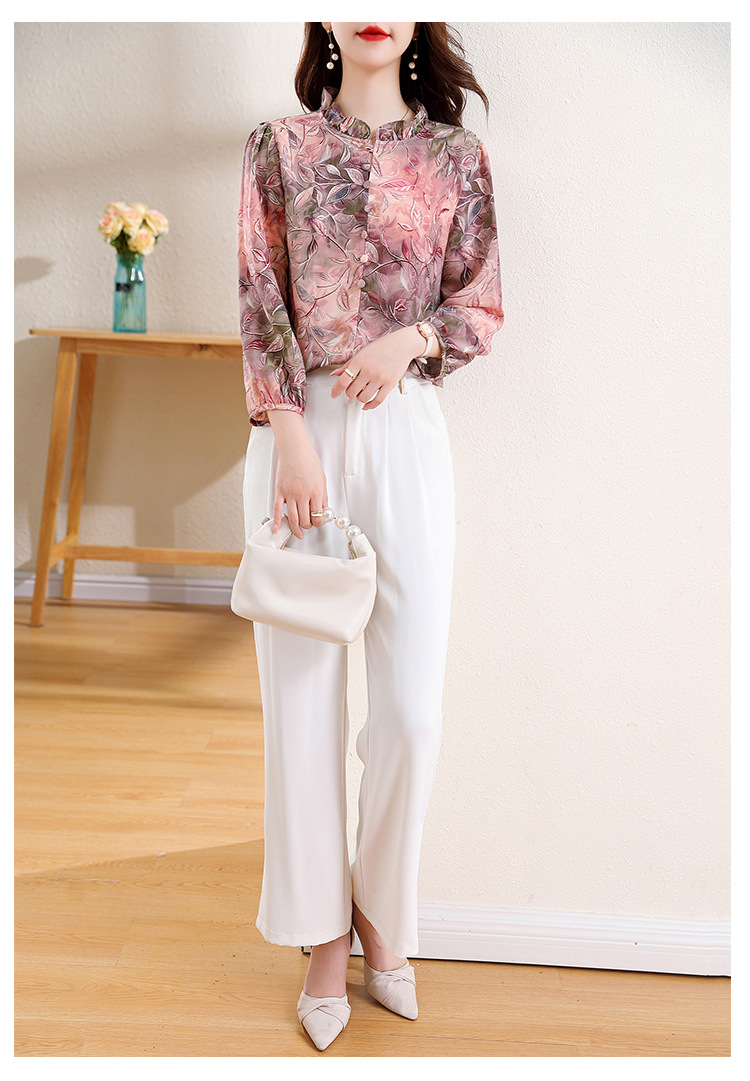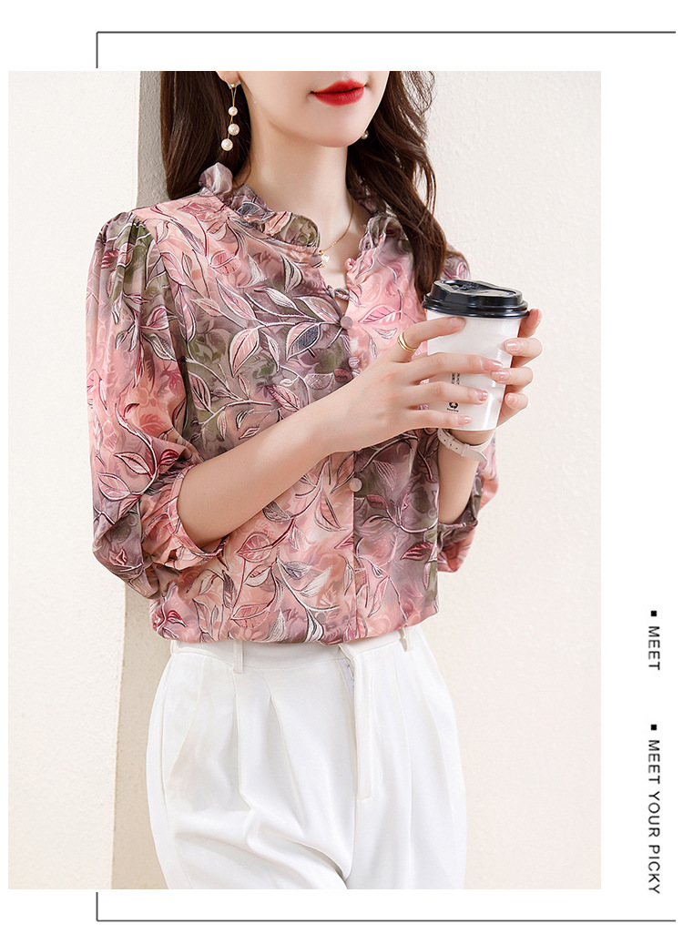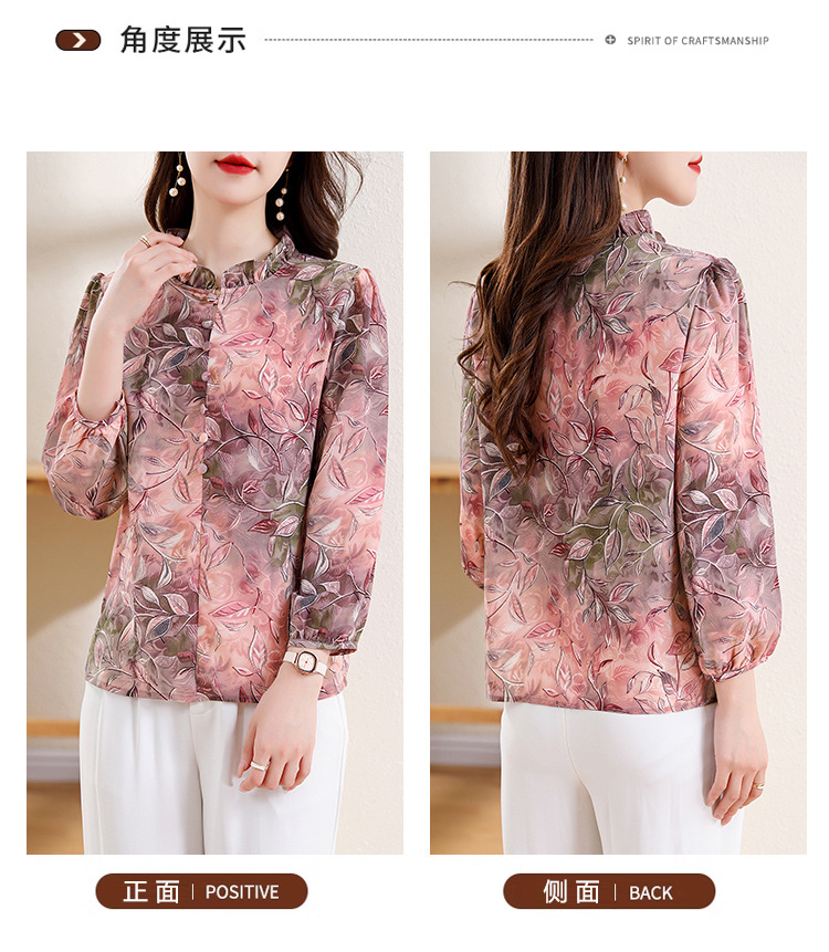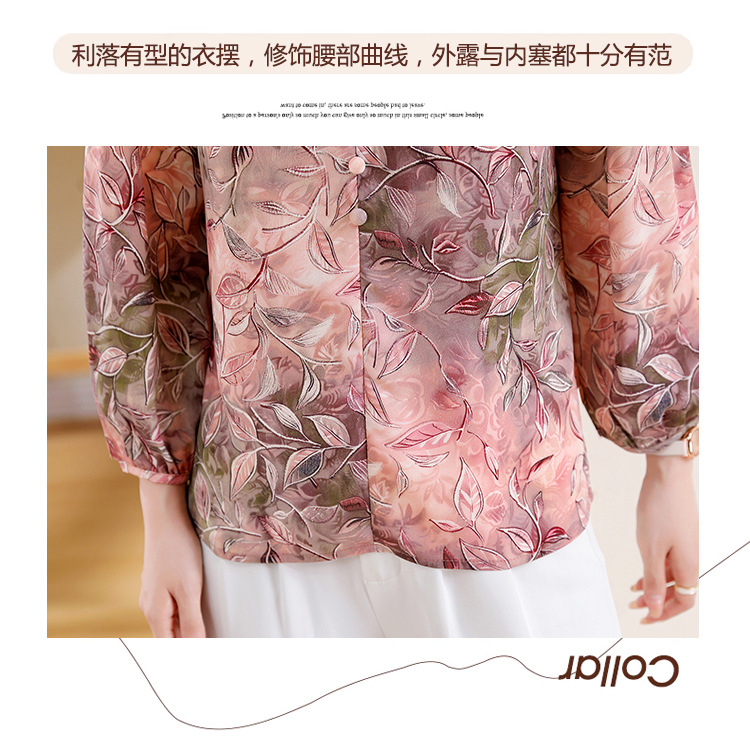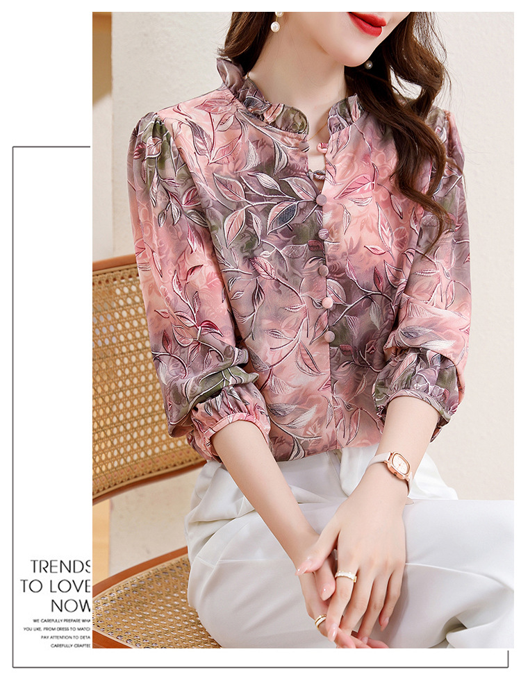 2025 봄 긴 소매 새로운 중국 스타일 국가 스타일 디자인 센스 기질 인쇄 목재 귀 칼라 셔츠 유행 최고 여성 도매스토어 가기