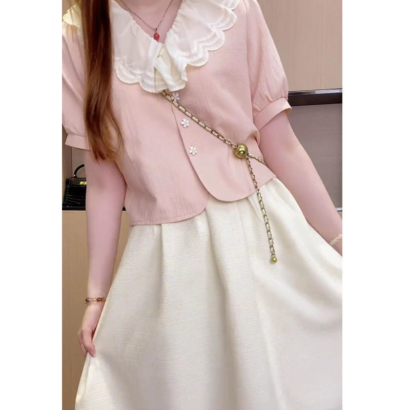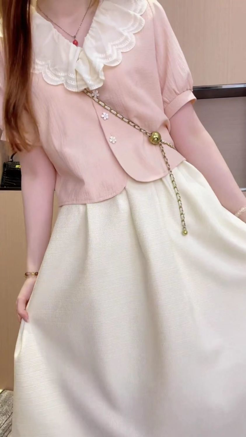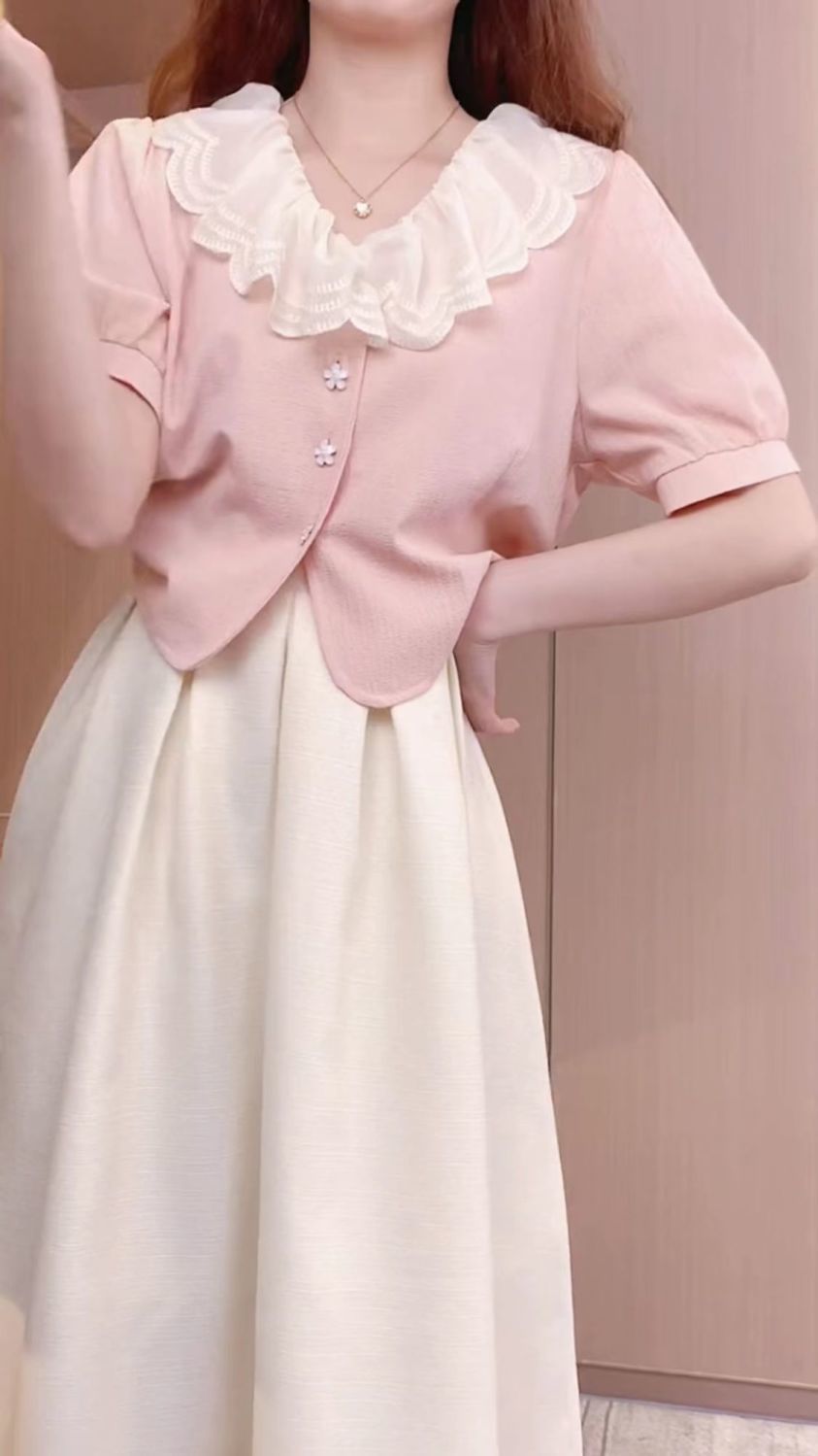 • 핑크 레이스 탑 + 살구 화이트 플리츠 스커트 [대나무 린넨 소재]