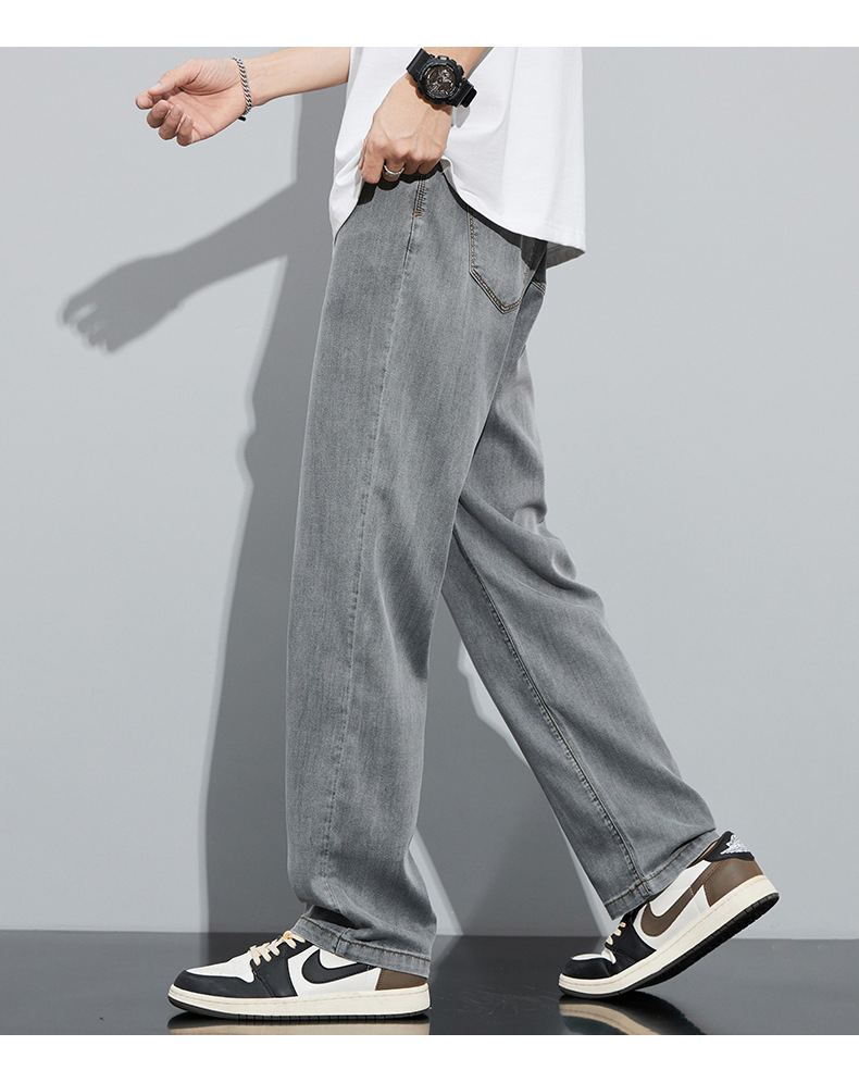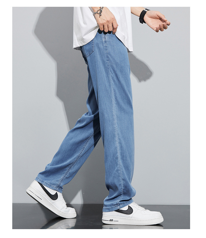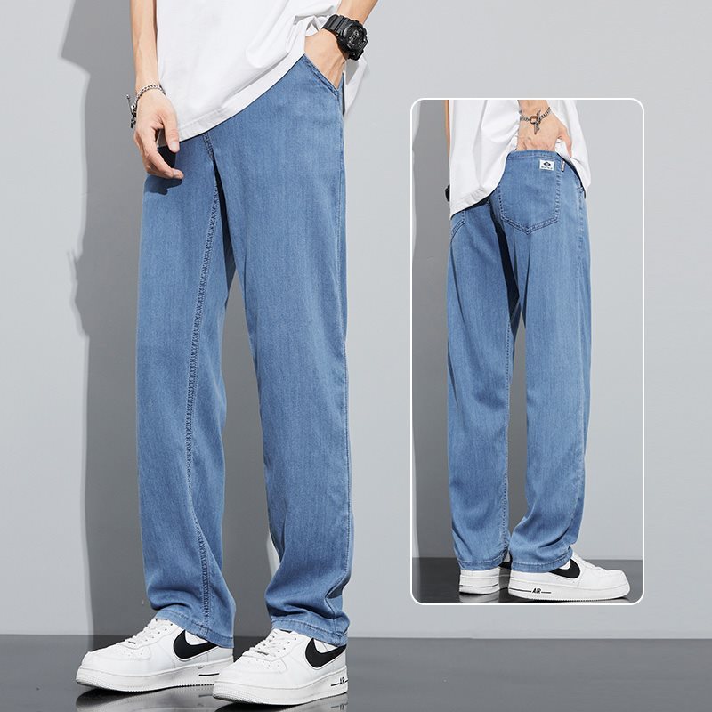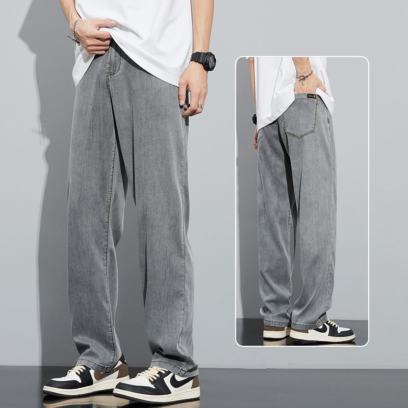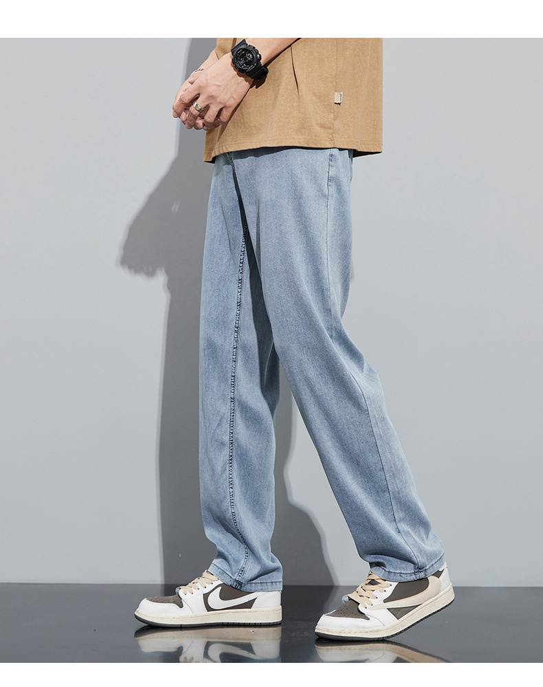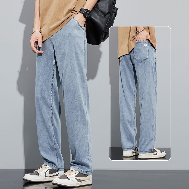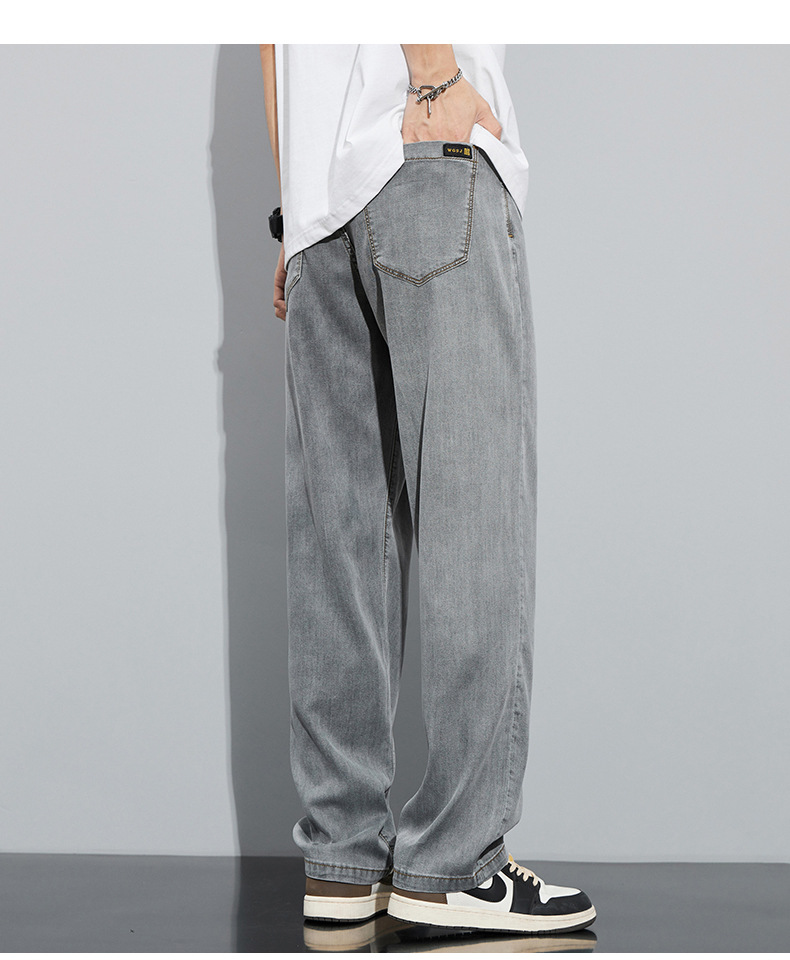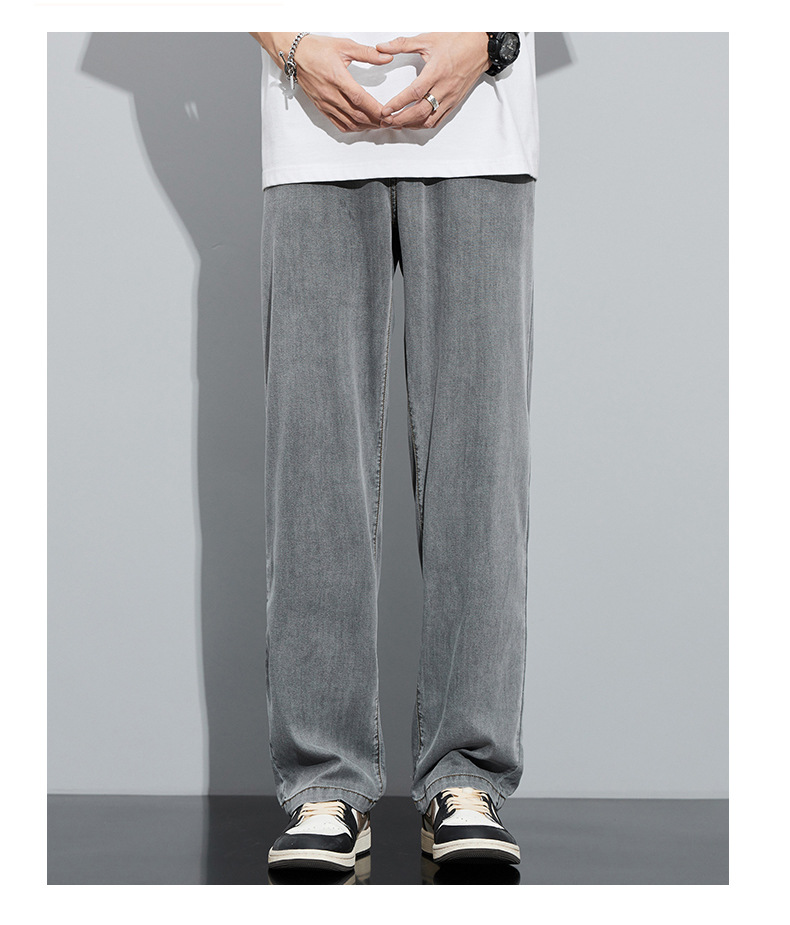 아이스 실크 청바지 남자의 얇은 여름 스트레이트 느슨한 텐셀 넓은 다리 바지 빈티지 여름 남자 캐주얼 긴 바지스토어 가기