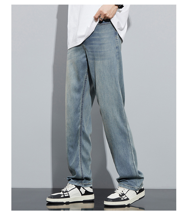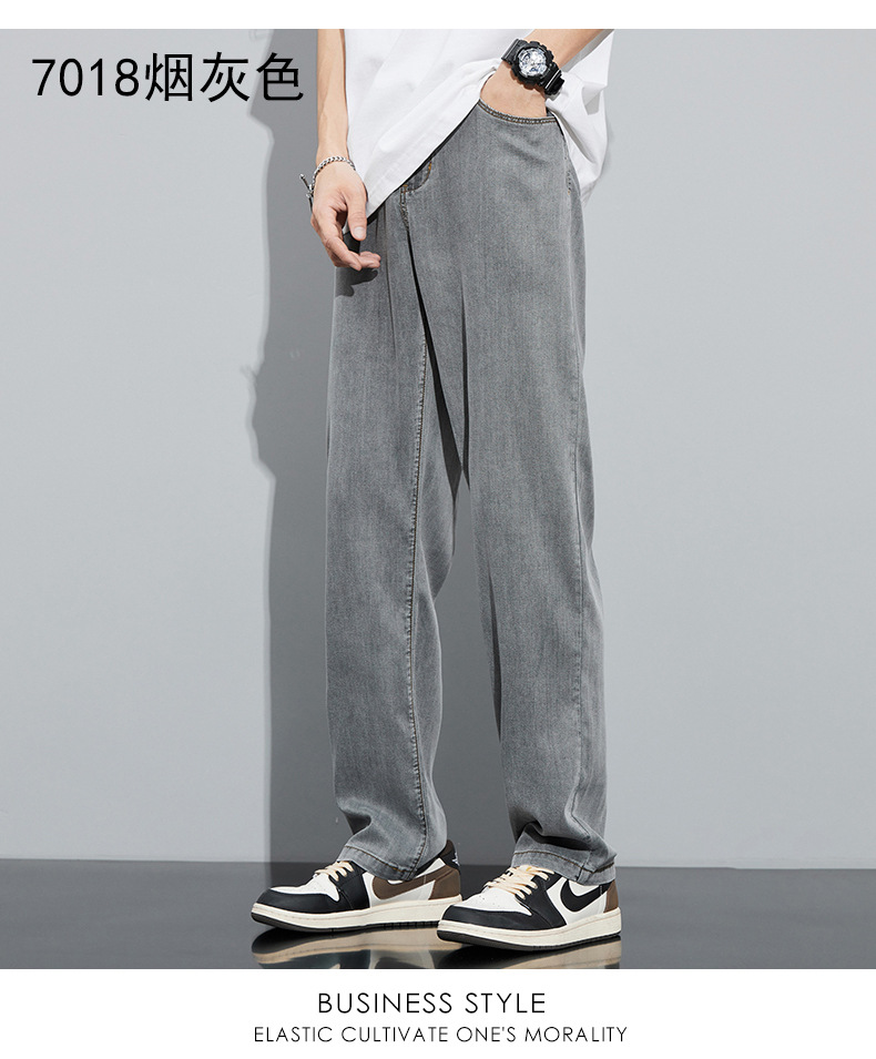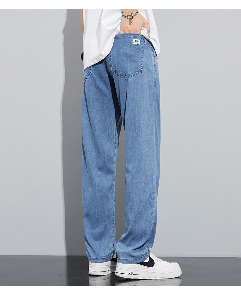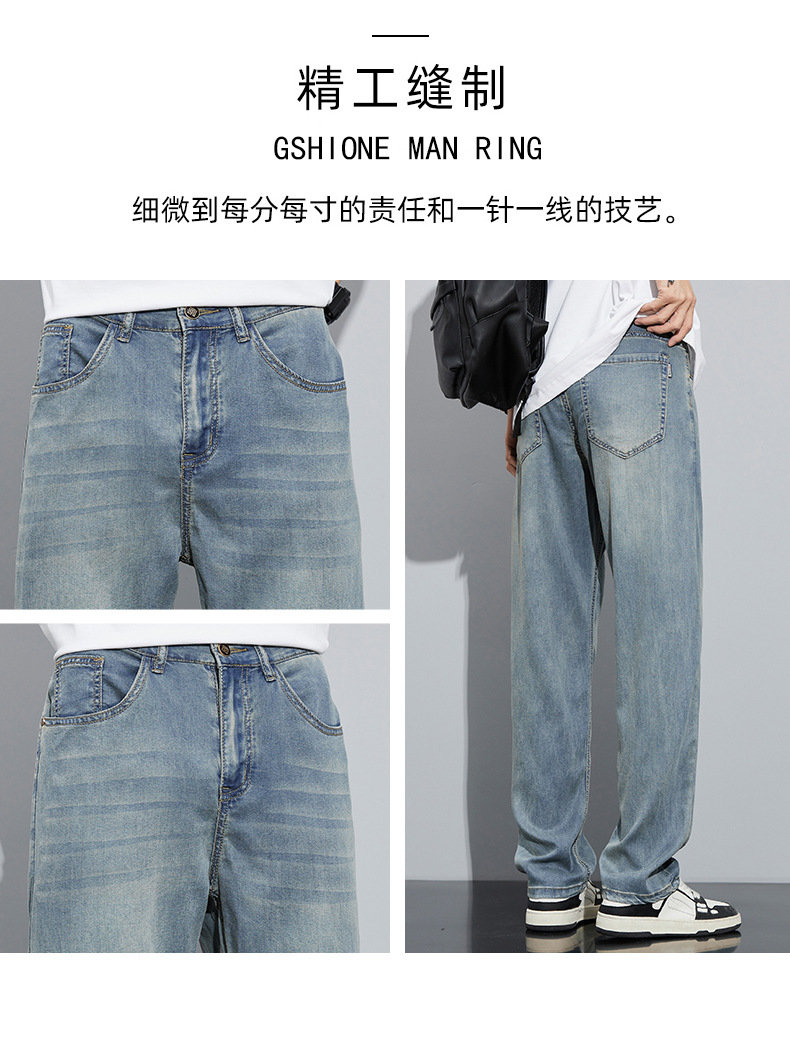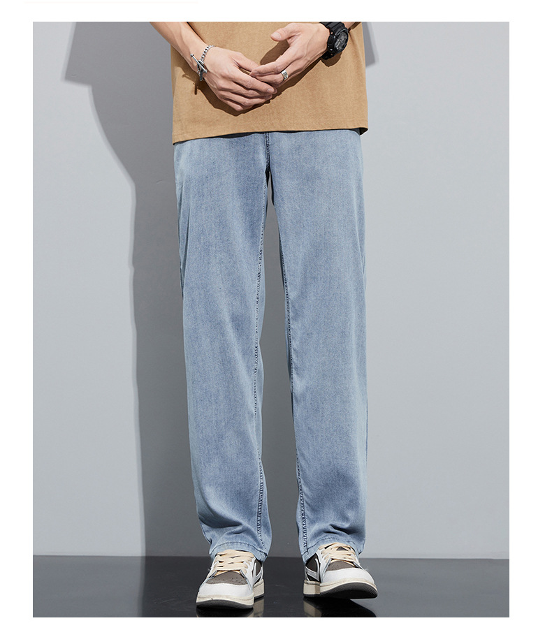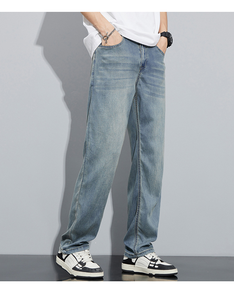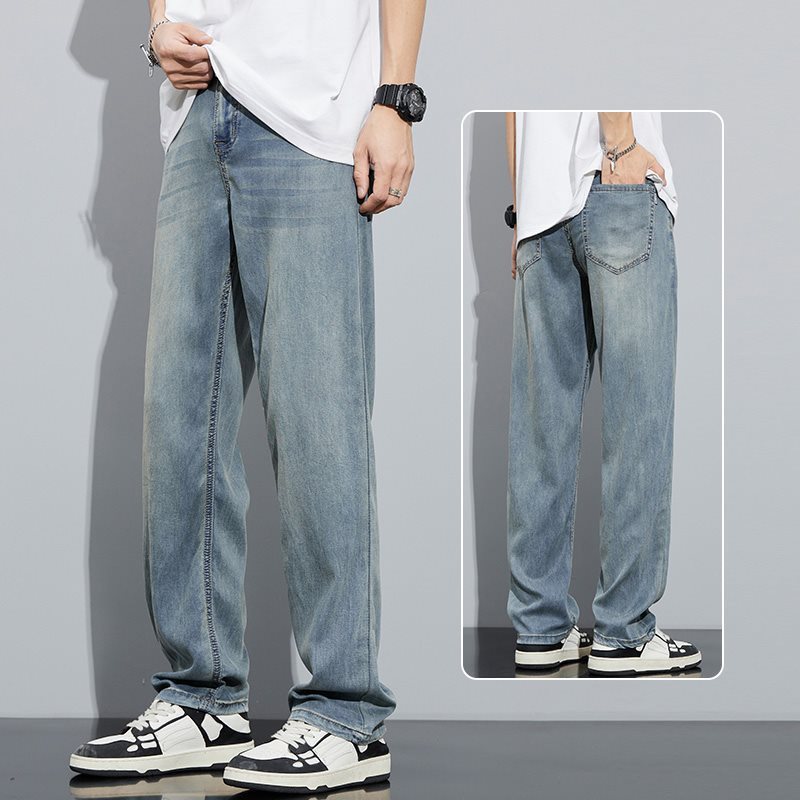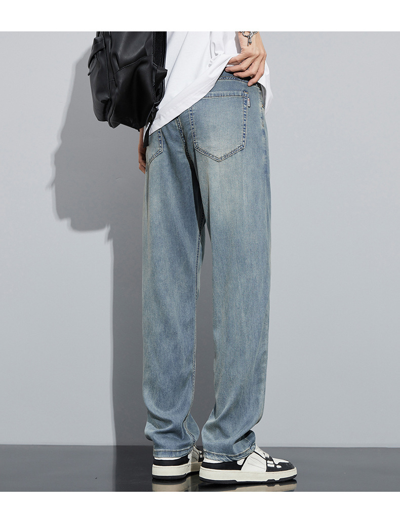 아이스 실크 청바지 남자의 얇은 여름 스트레이트 느슨한 텐셀 넓은 다리 바지 빈티지 여름 남자 캐주얼 긴 바지스토어 가기