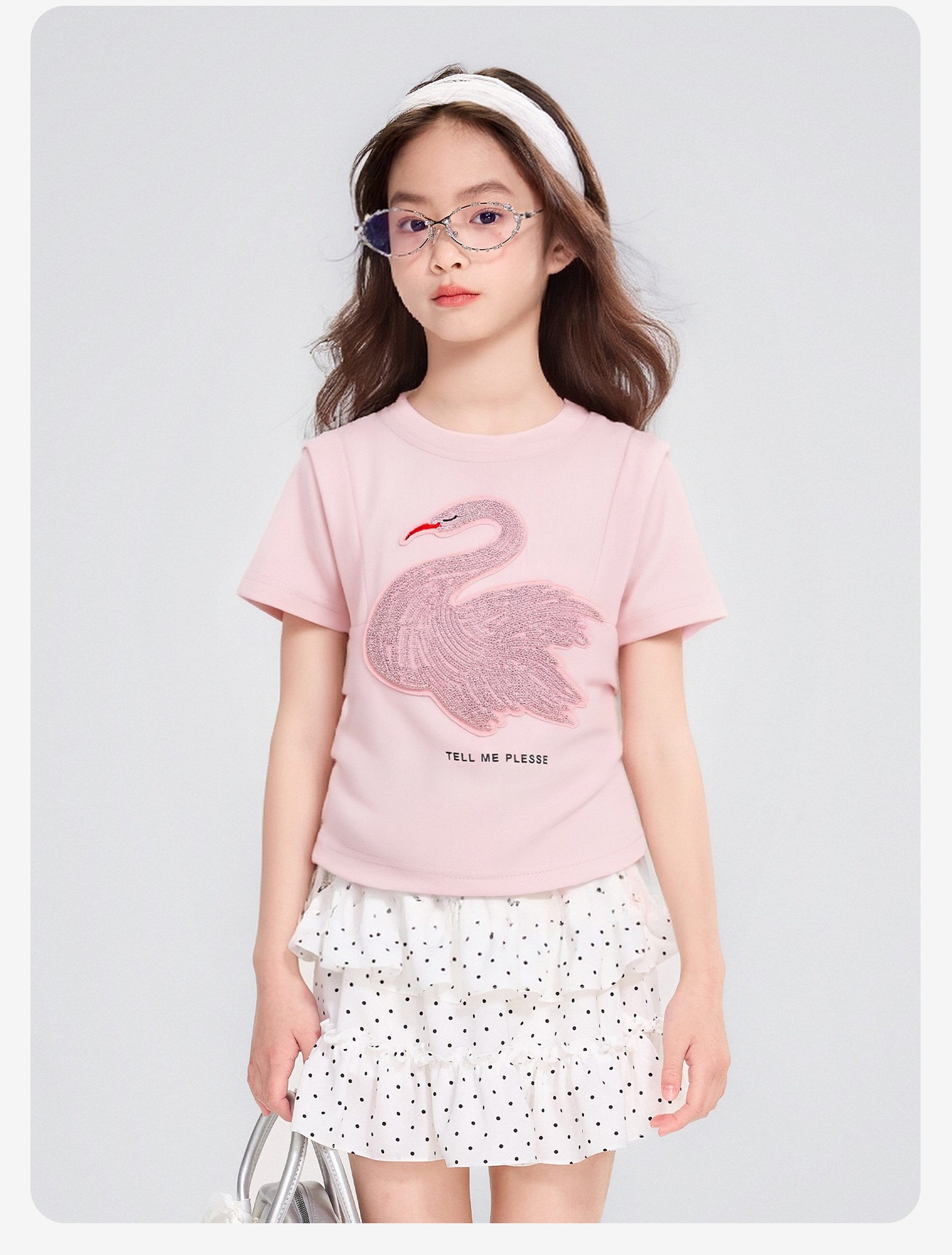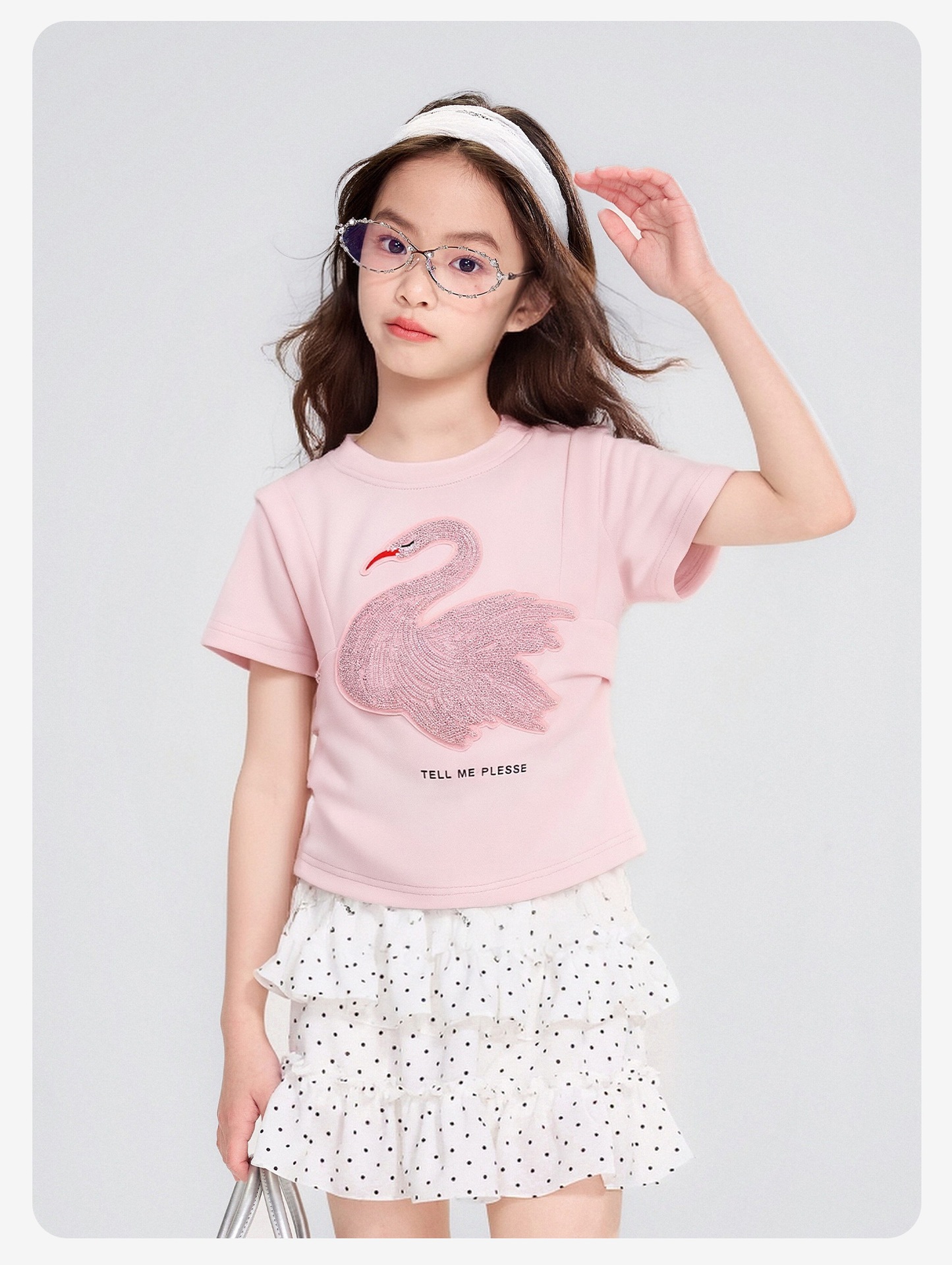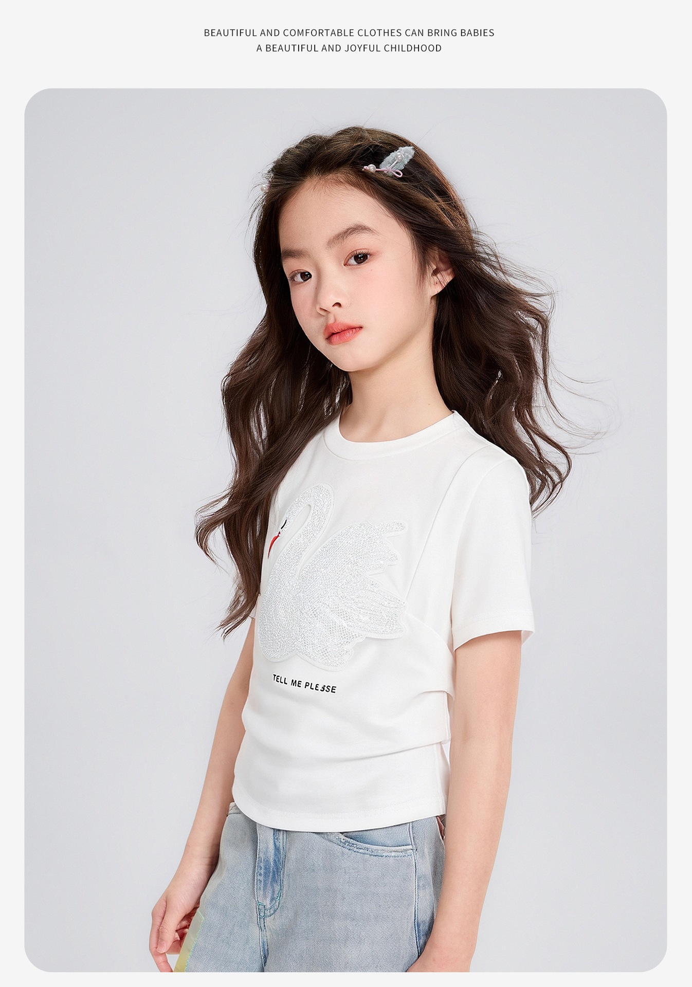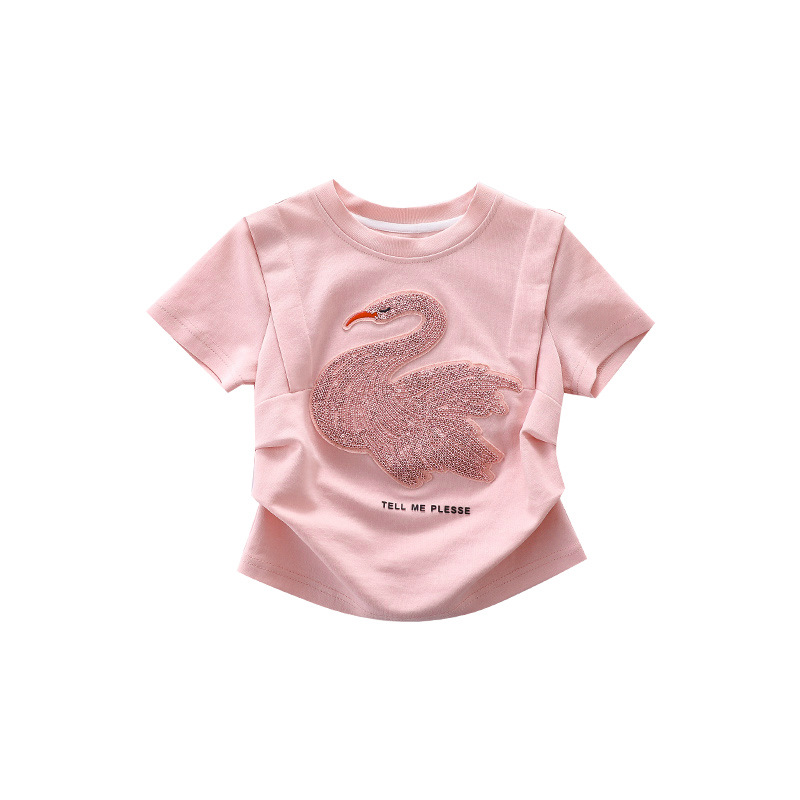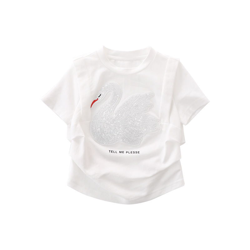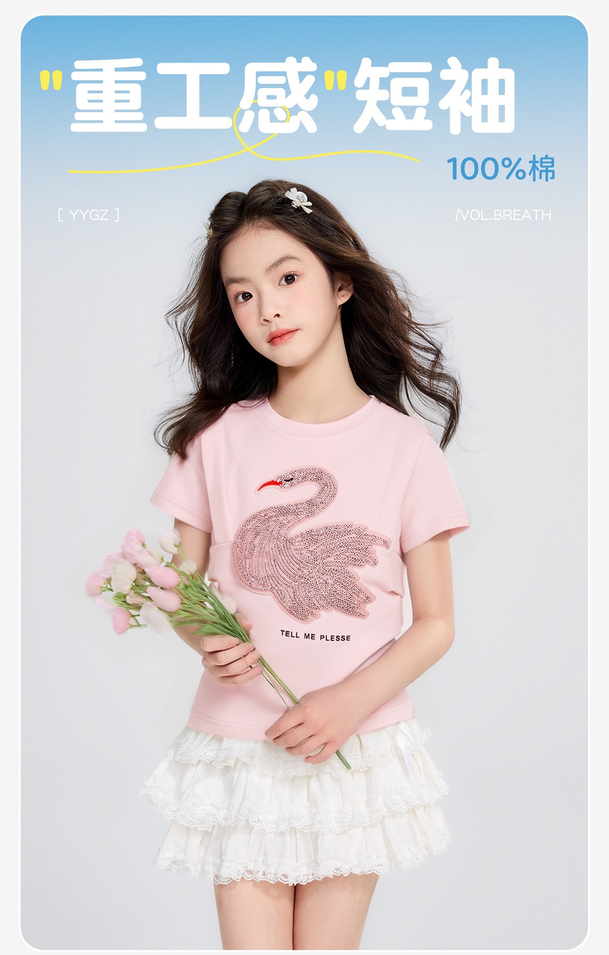 [100 면] 여자 반팔 티셔츠 여름 2025 새로운 어린이 스팽글 만화 어린 소녀 패션 짧은 T