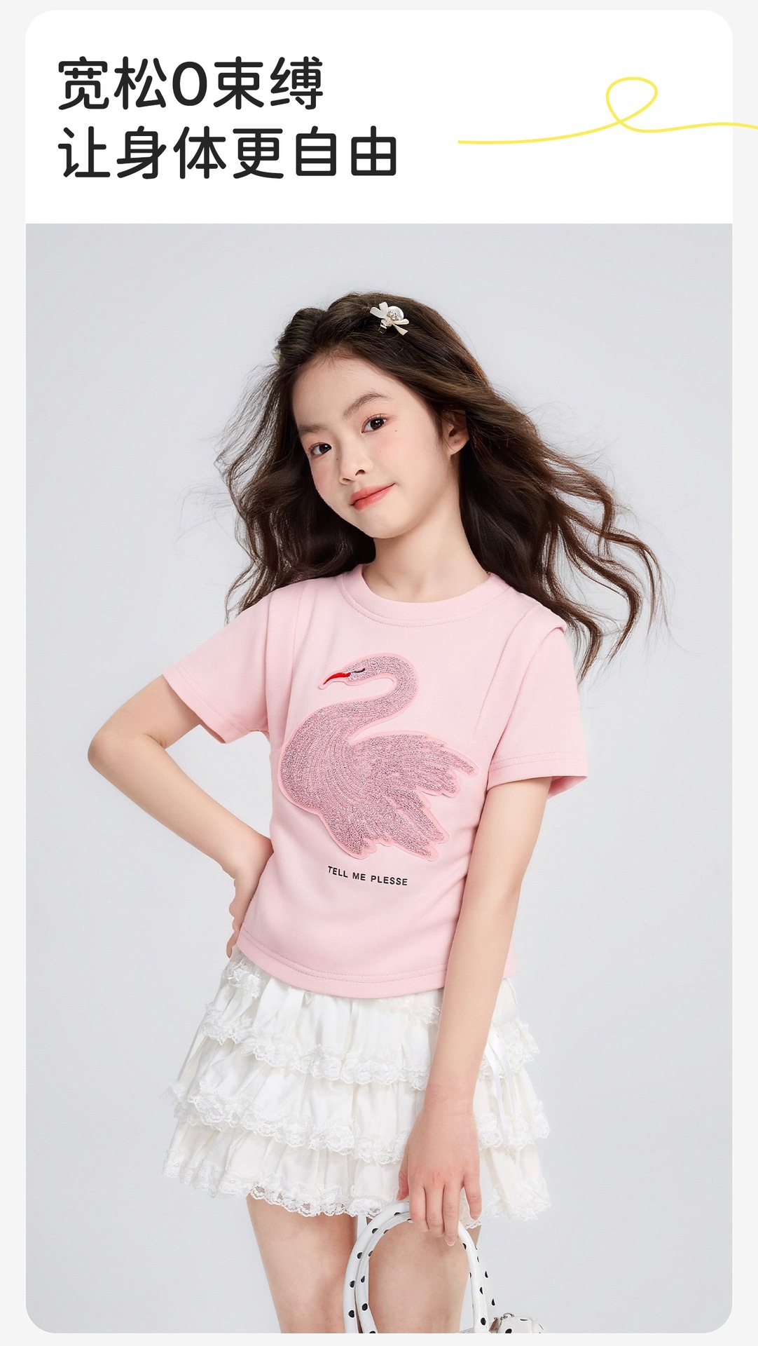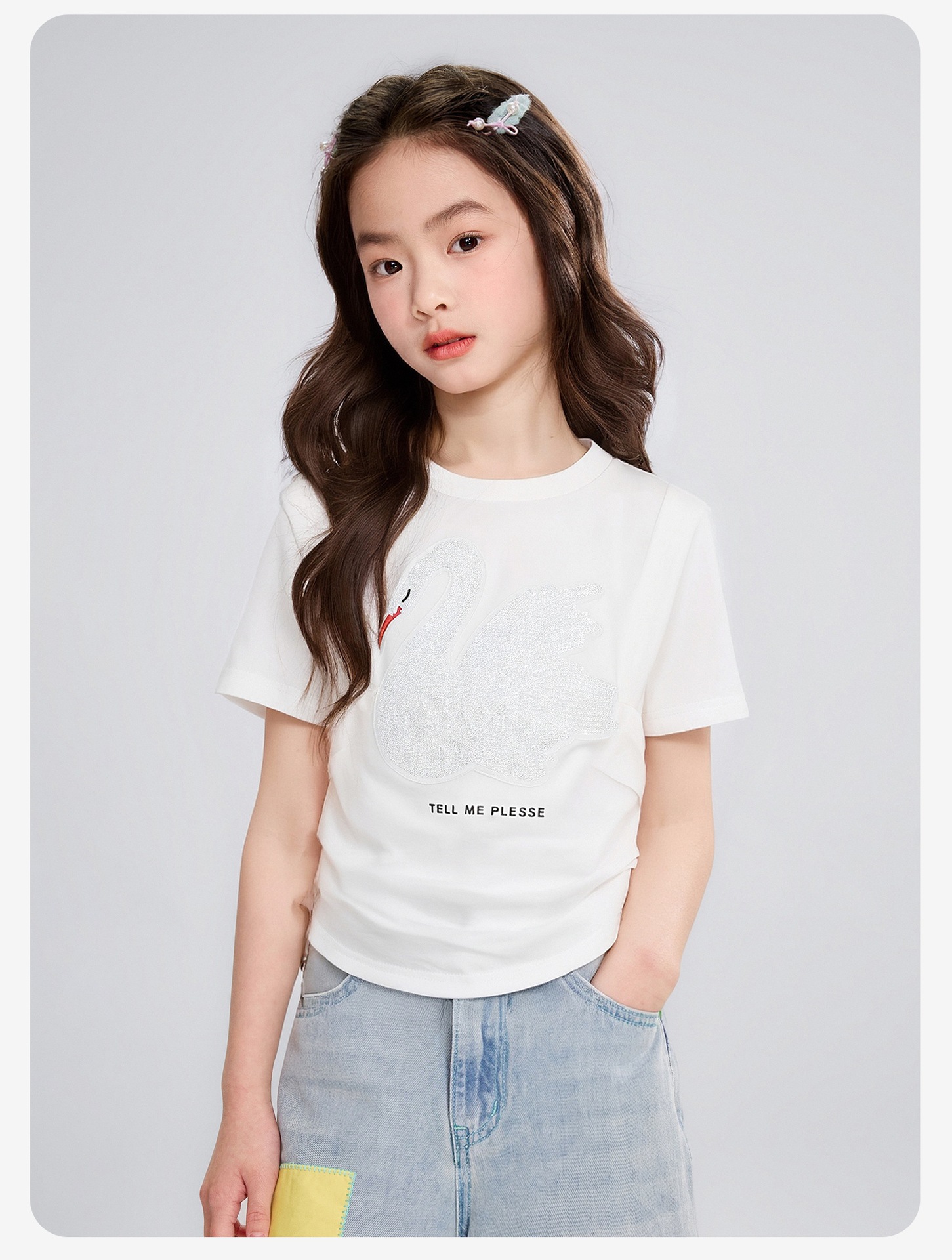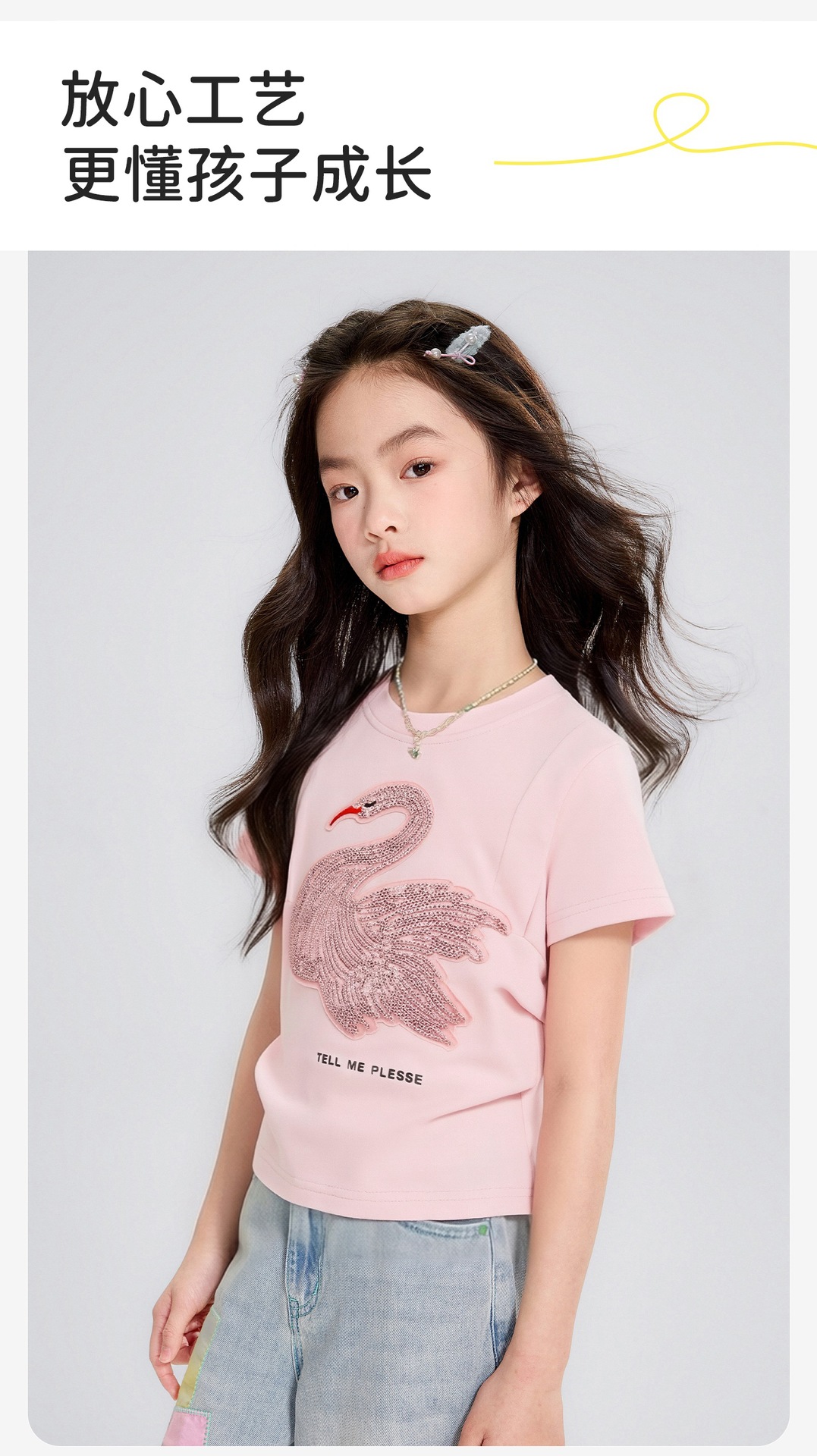 [100 면] 여자 반팔 티셔츠 여름 2025 새로운 어린이 스팽글 만화 어린 소녀 패션 짧은 T스토어 가기