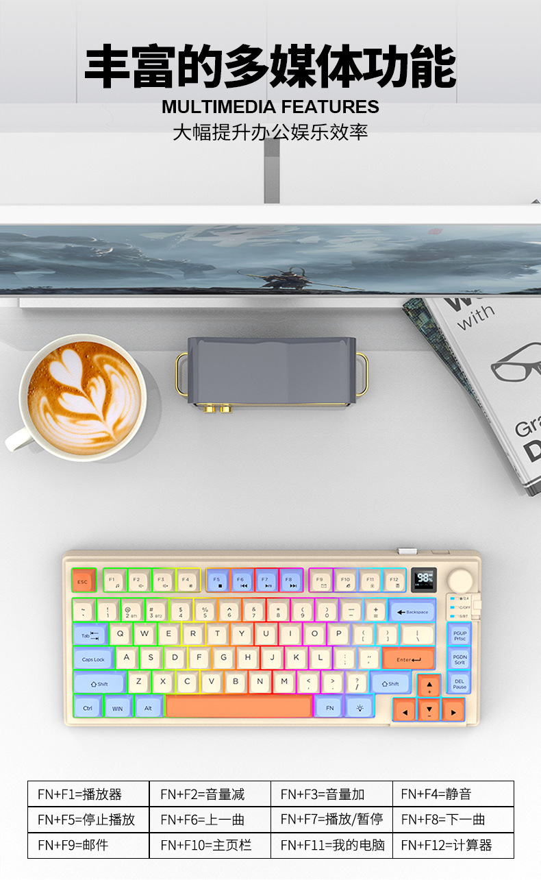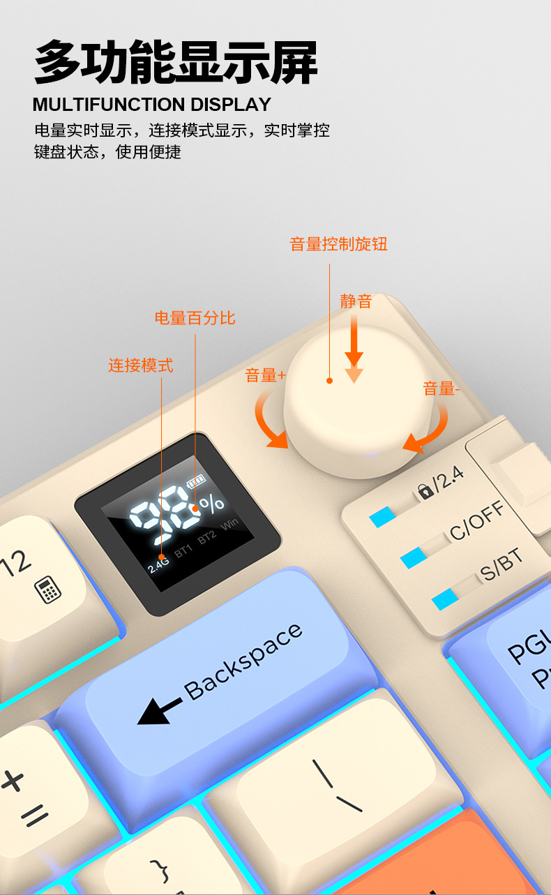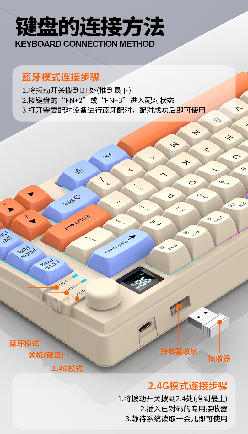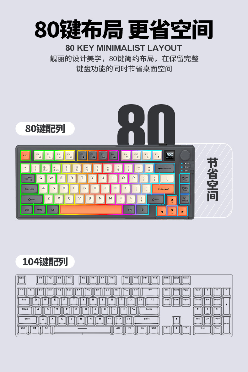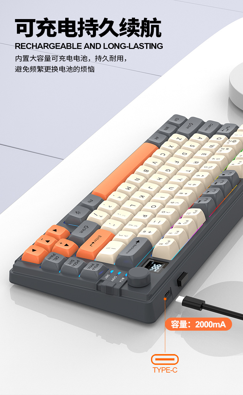 현 실버 폭스 K92 무선 블루투스 듀얼 모드 기계적 그라디언트 키보드 MDA 볼 캡 디스플레이 손잡이 게임 키보드