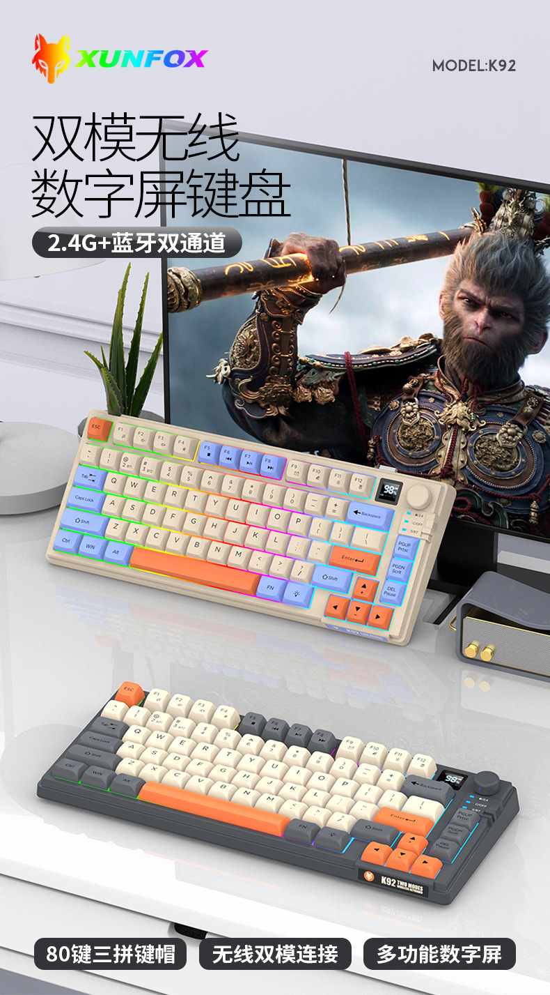 현 실버 폭스 K92 무선 블루투스 듀얼 모드 기계적 그라디언트 키보드 MDA 볼 캡 디스플레이 손잡이 게임 키보드스토어 가기