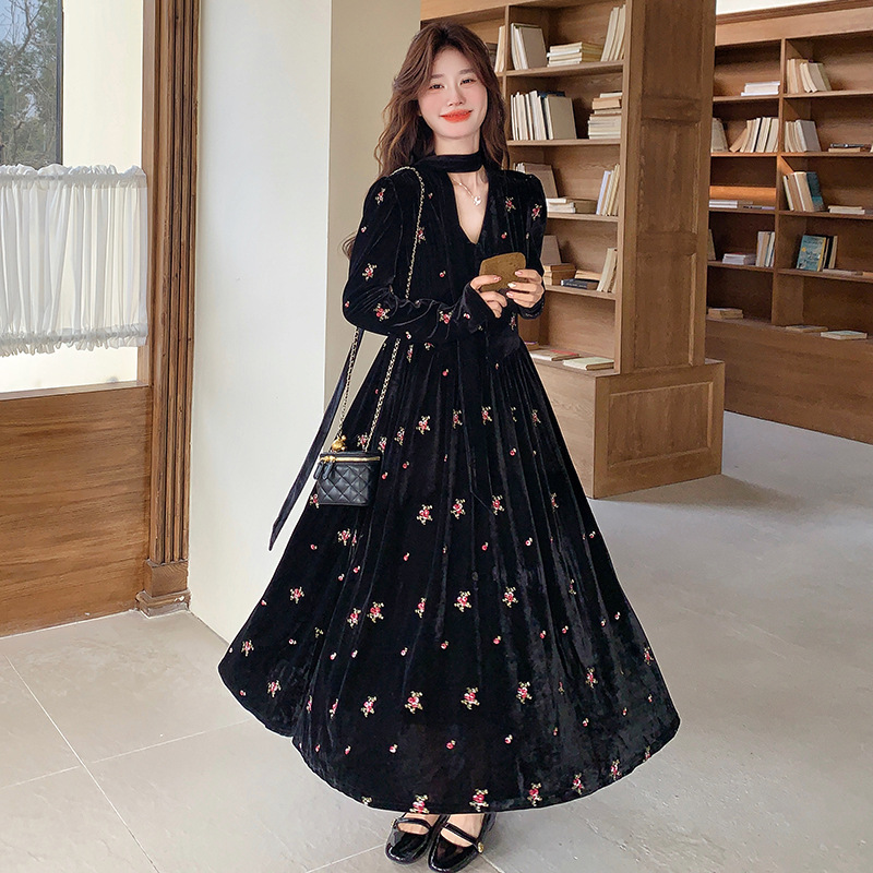 리얼 샷 프랑스 헤비 자수 벨벳 원피스 2025 새로운 빈티지 우아한 V 넥 하이 웨이스트 슬림 원피스스토어 가기