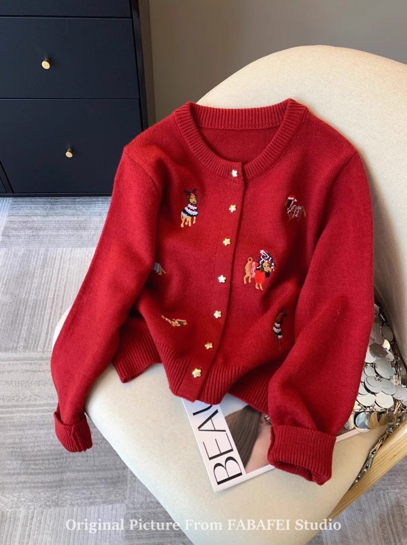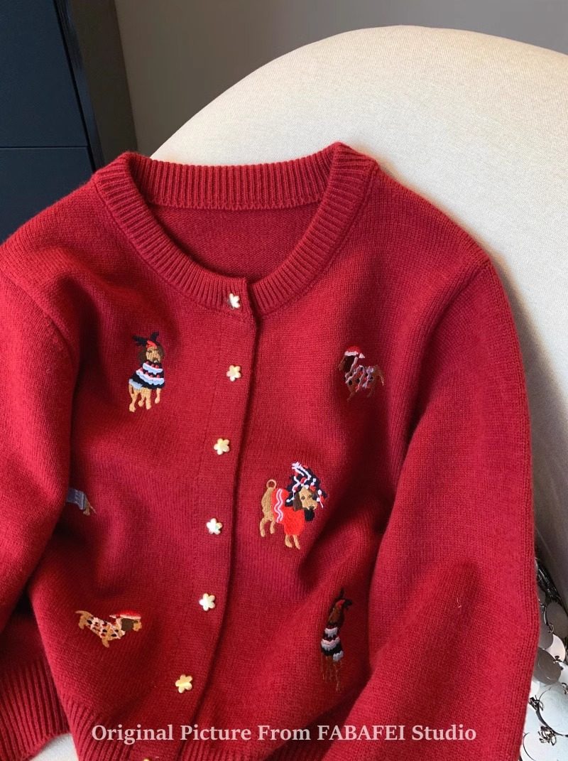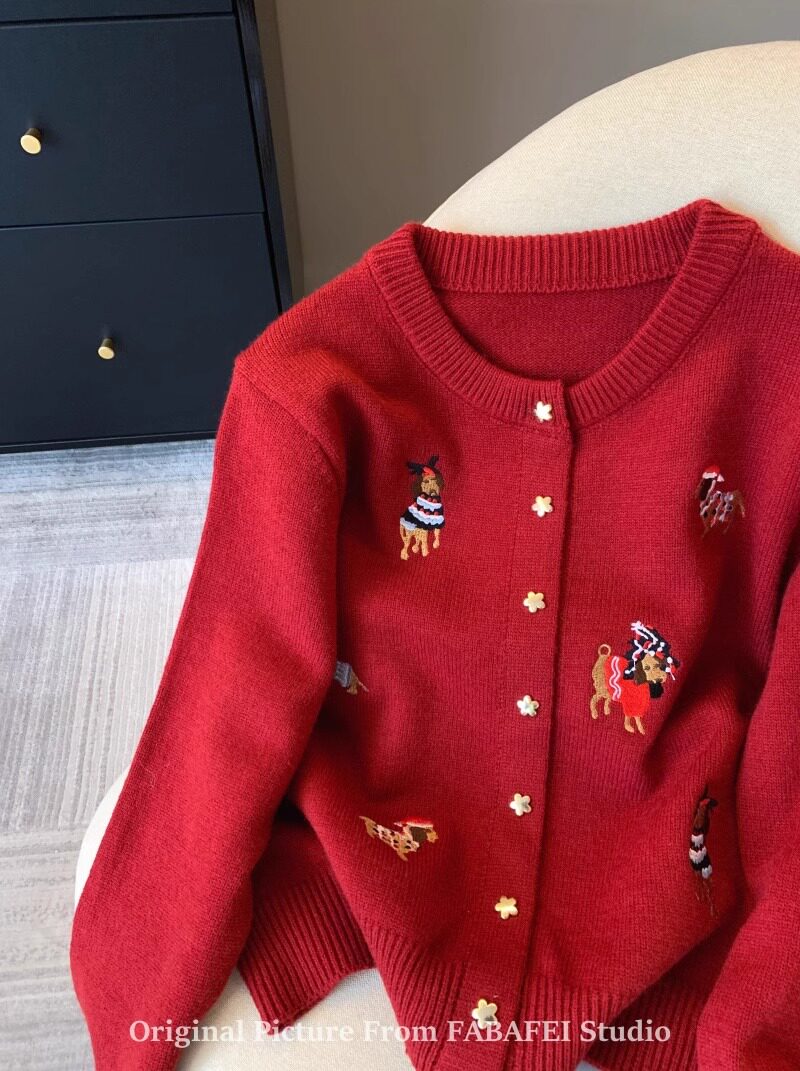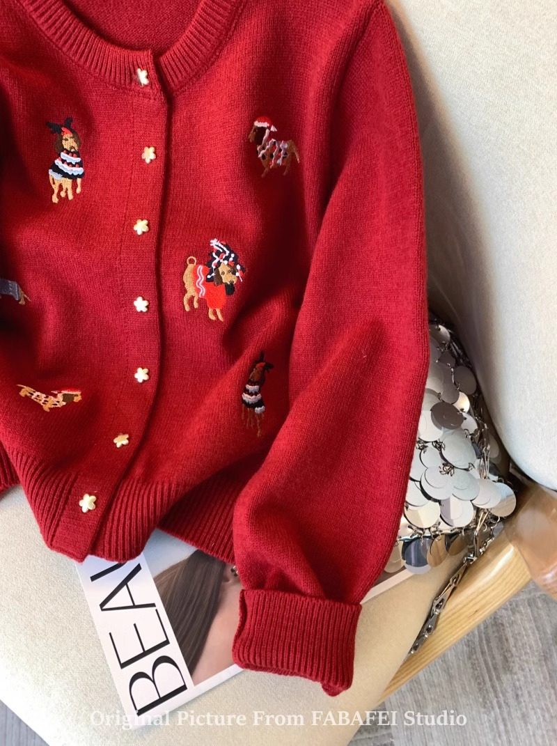 세련된 레트로 크리스마스 레드 강아지 자수 니트 카디건 여성 디자인 센스 5 점 스타 버튼 스웨터 코트 봄과 가을스토어 가기