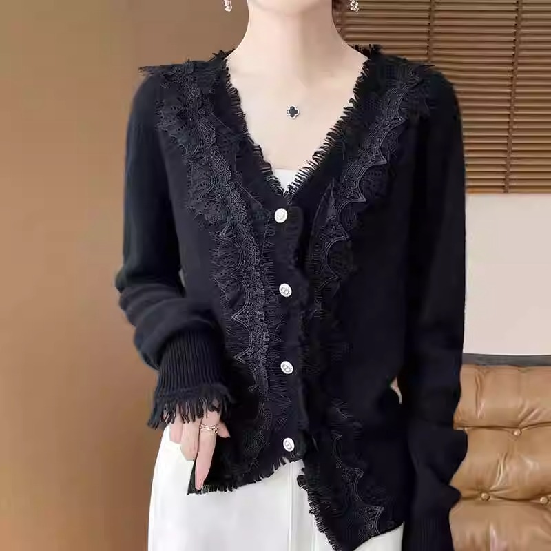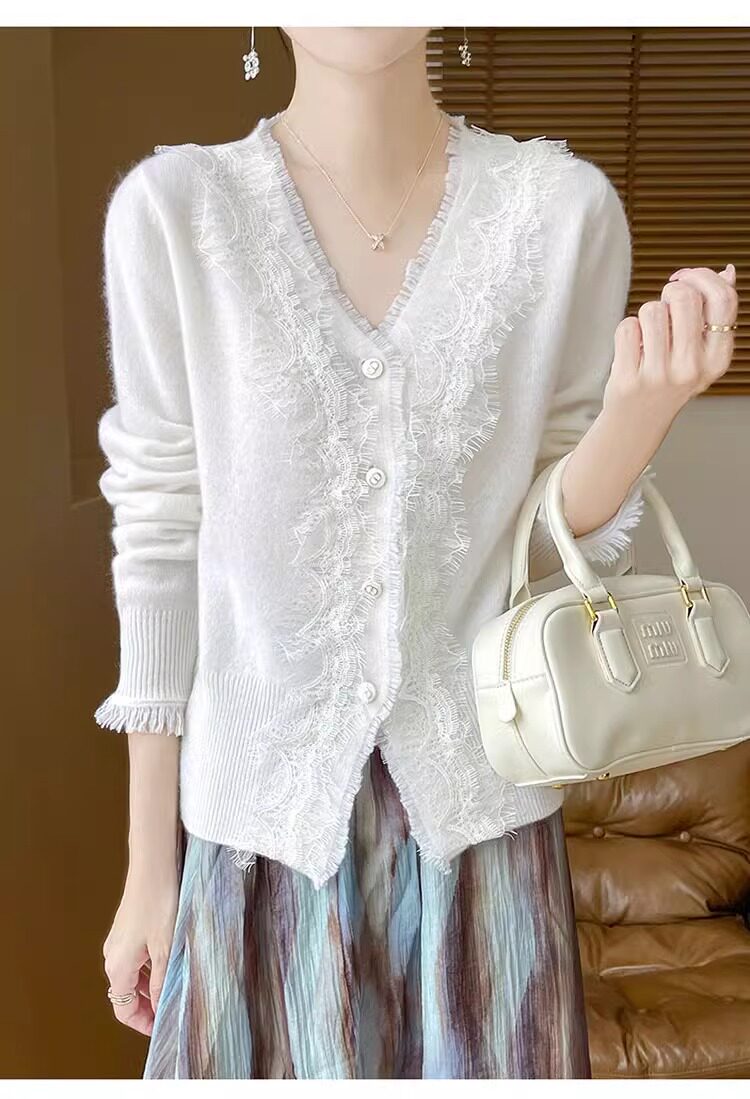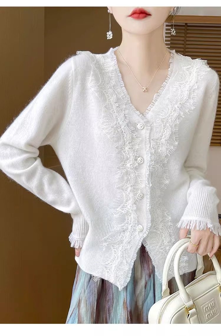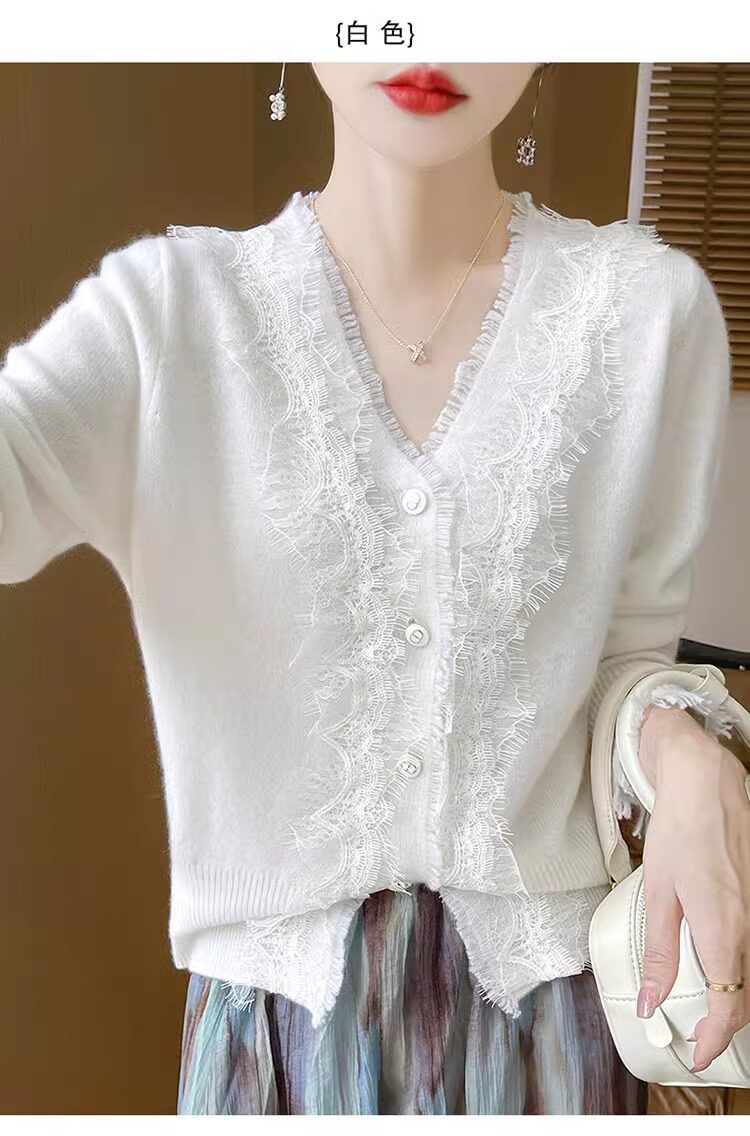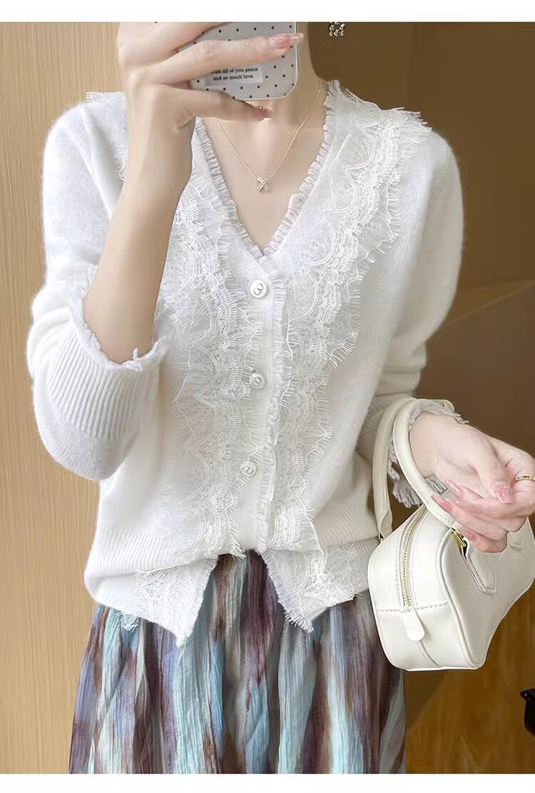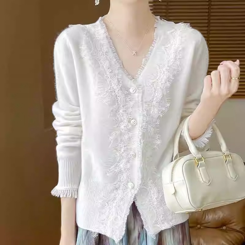 레이스 V 넥 화이트 니트베이스 셔츠 여성용 카디건 봄과 가을 뉴 2025 서양식 긴팔 반팔 스웨터 탑