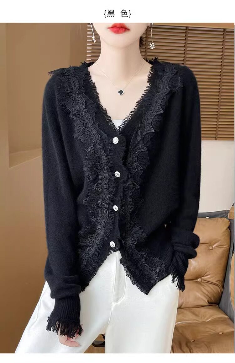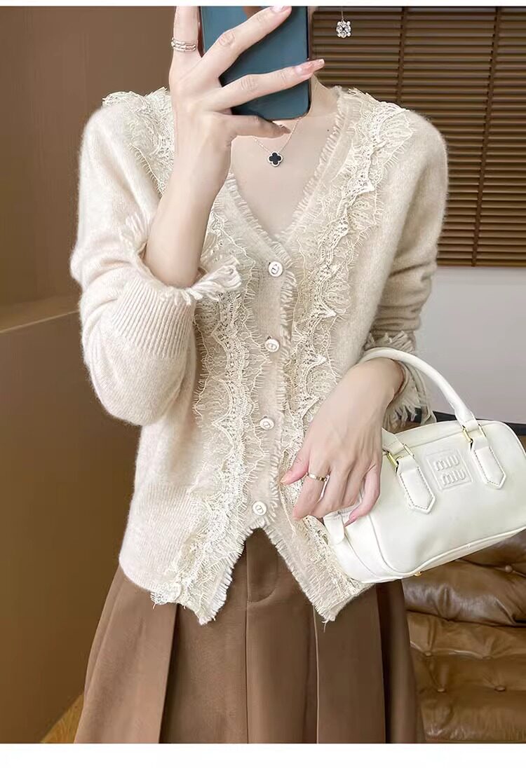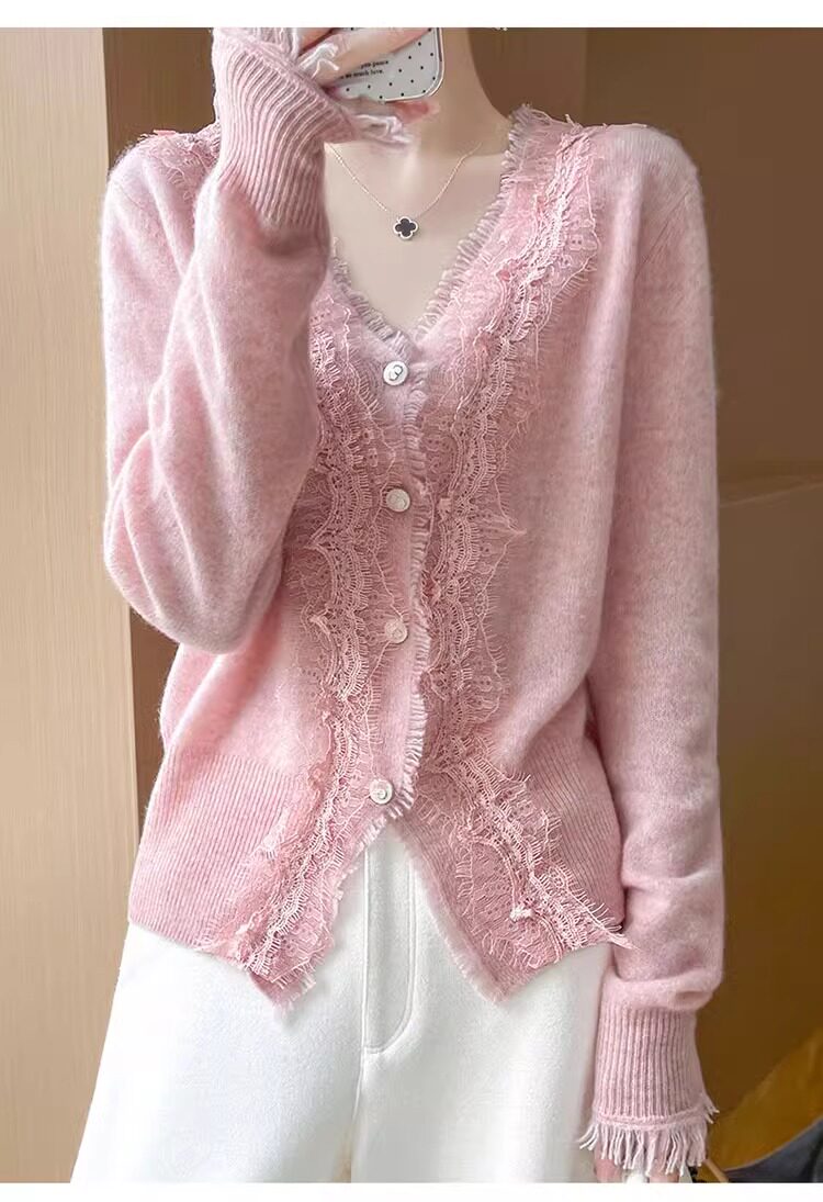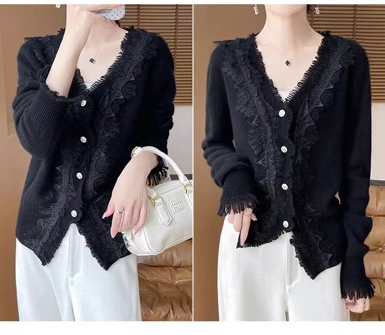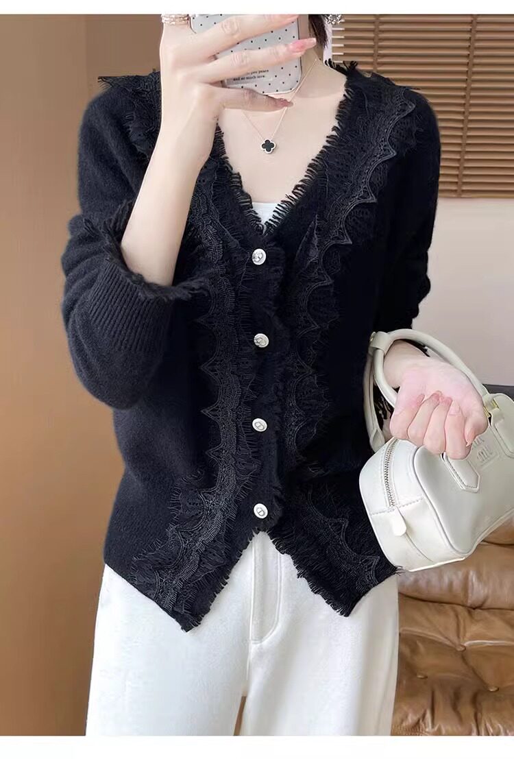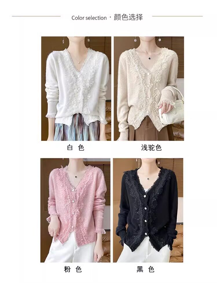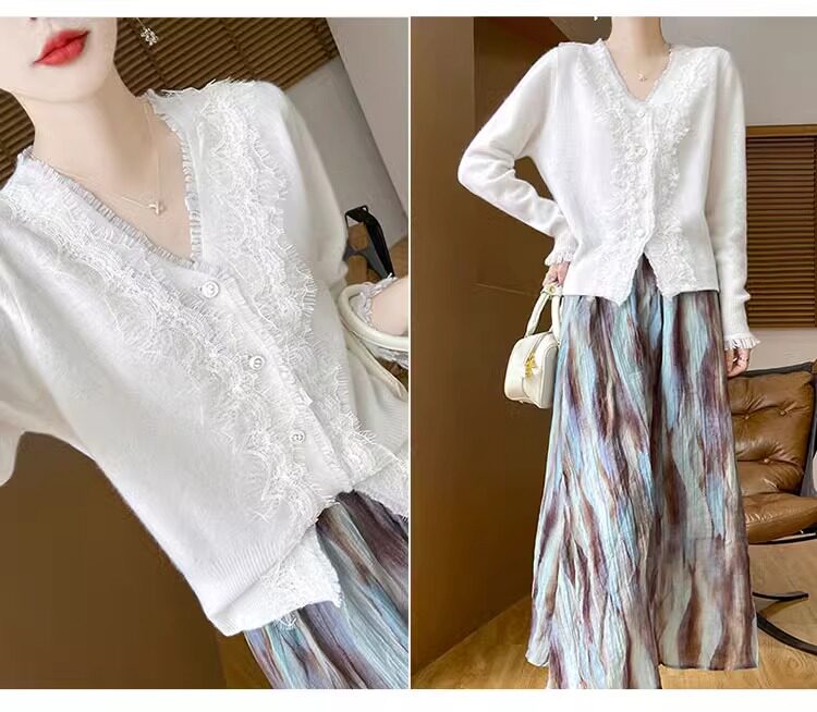 레이스 V 넥 화이트 니트베이스 셔츠 여성용 카디건 봄과 가을 뉴 2025 서양식 긴팔 반팔 스웨터 탑