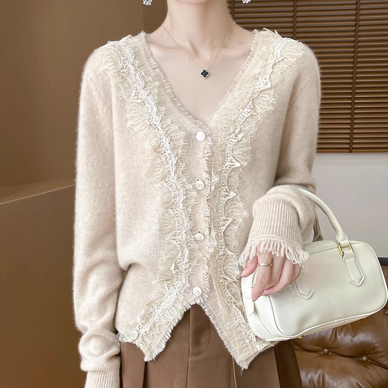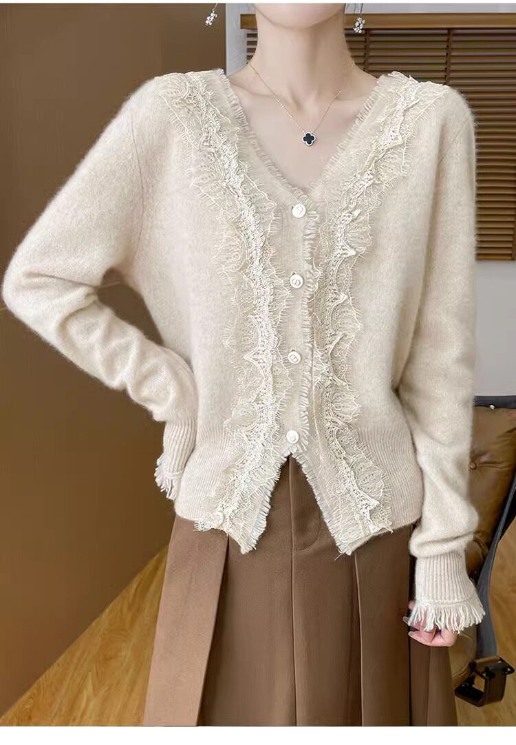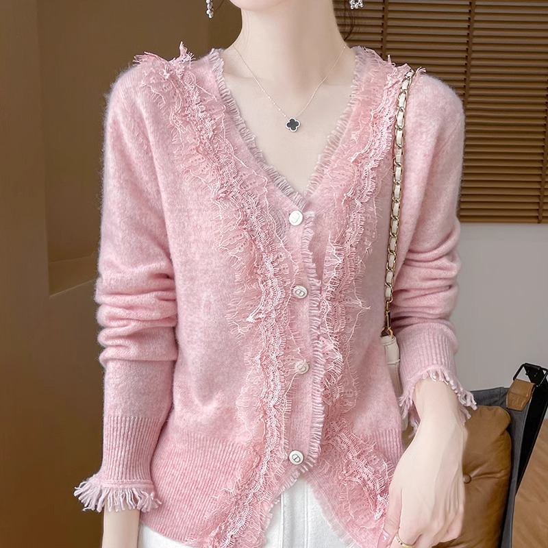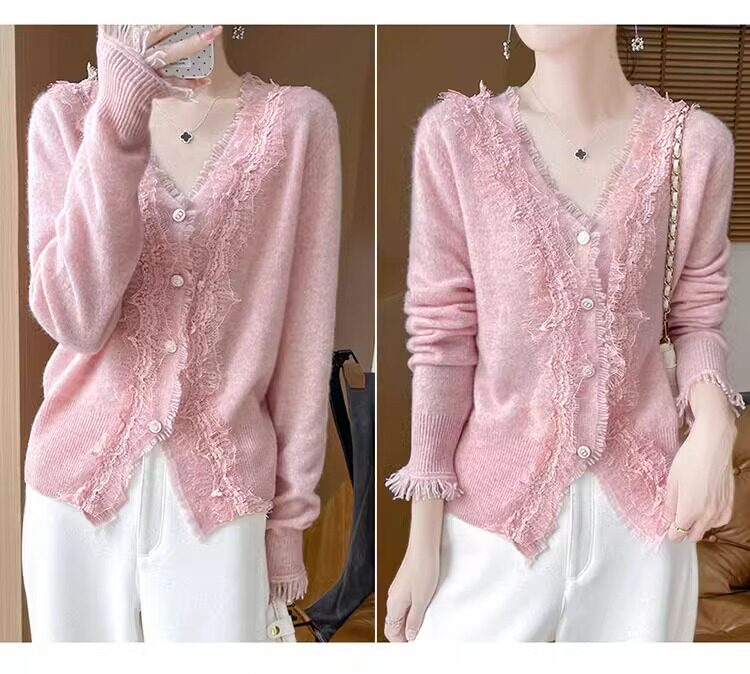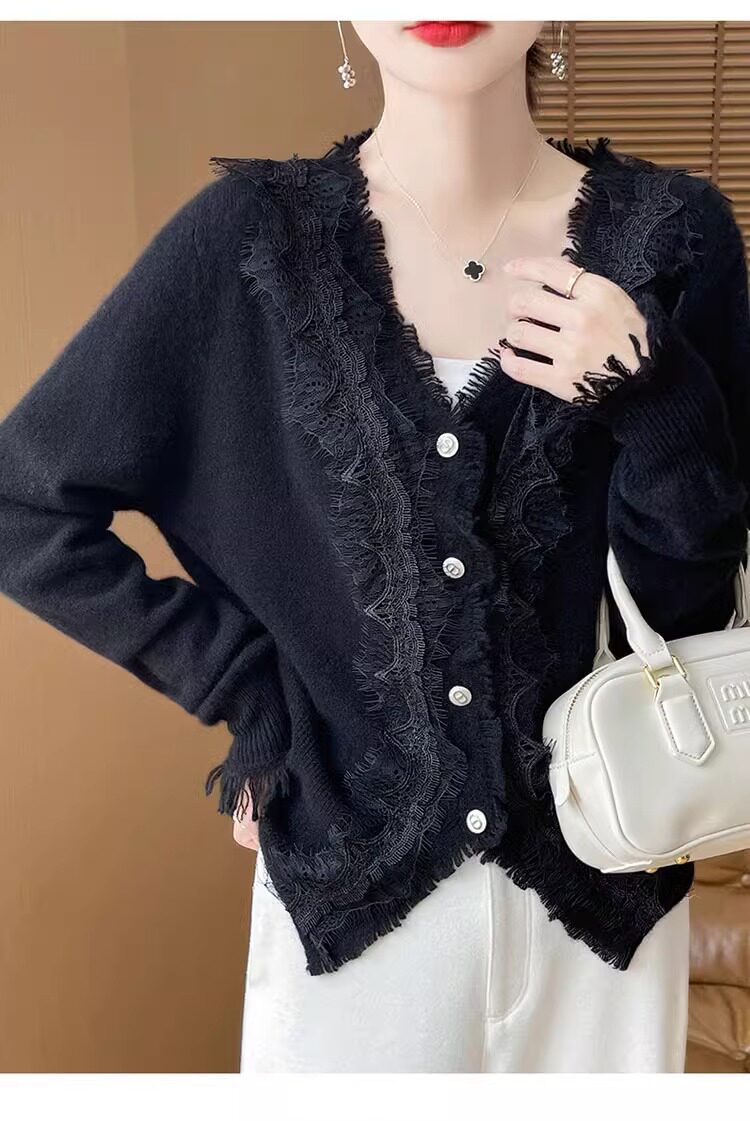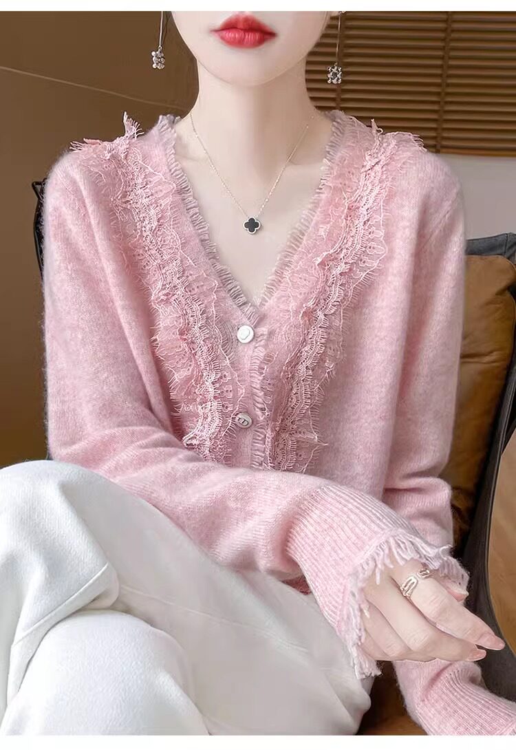 레이스 V 넥 화이트 니트베이스 셔츠 여성용 카디건 봄과 가을 뉴 2025 서양식 긴팔 반팔 스웨터 탑
