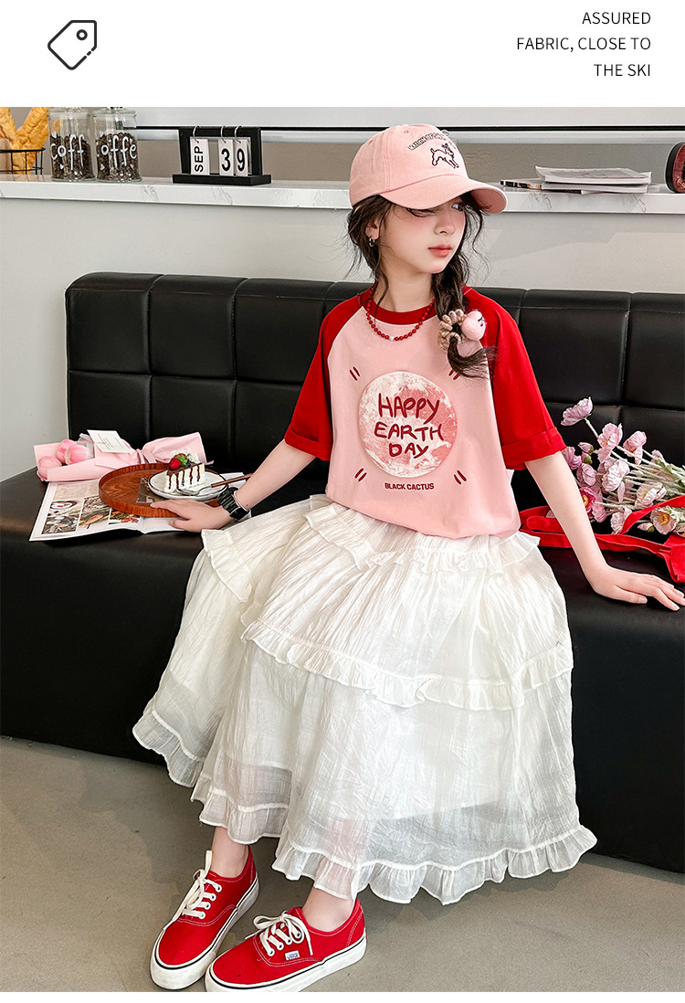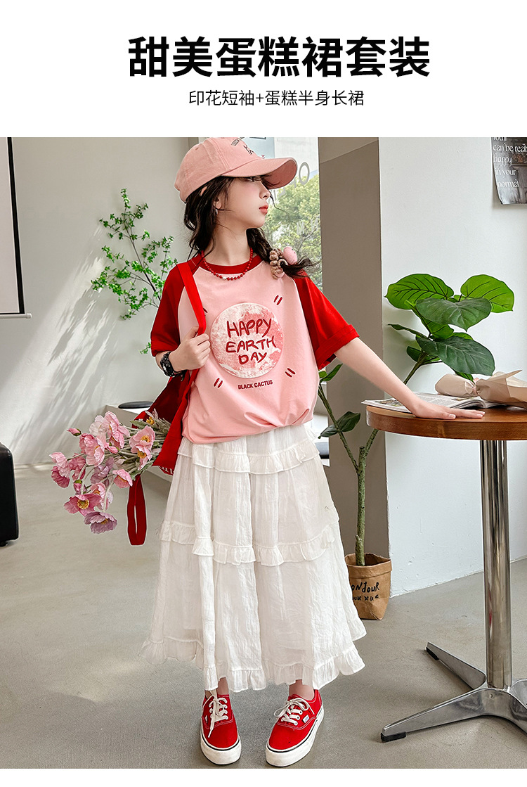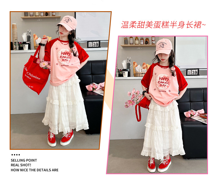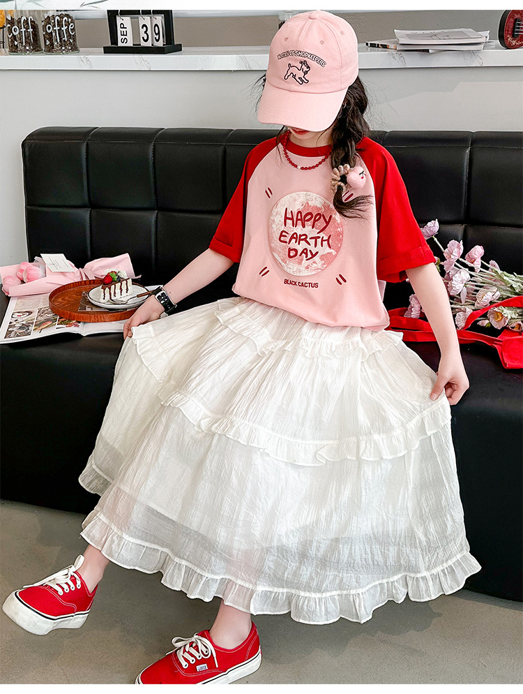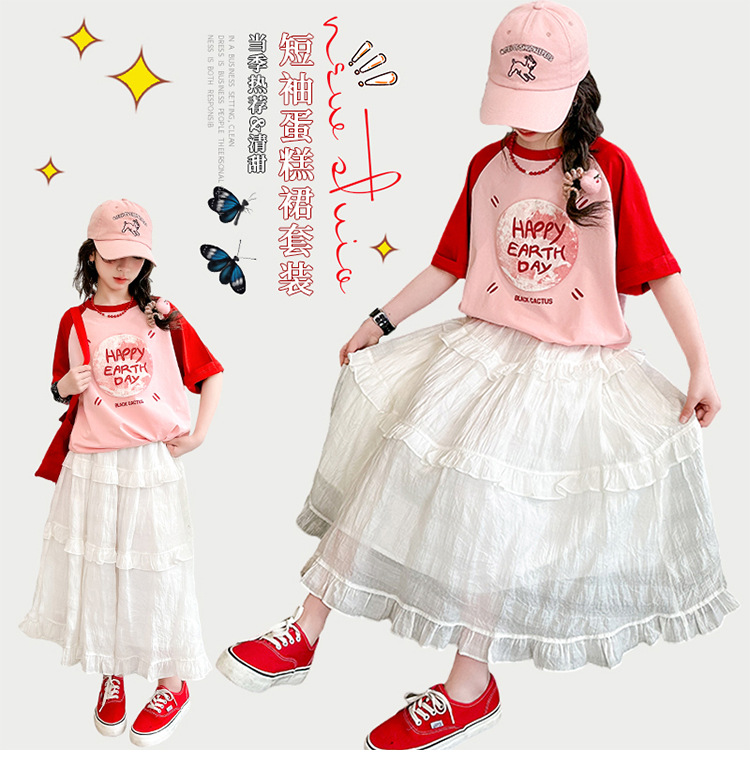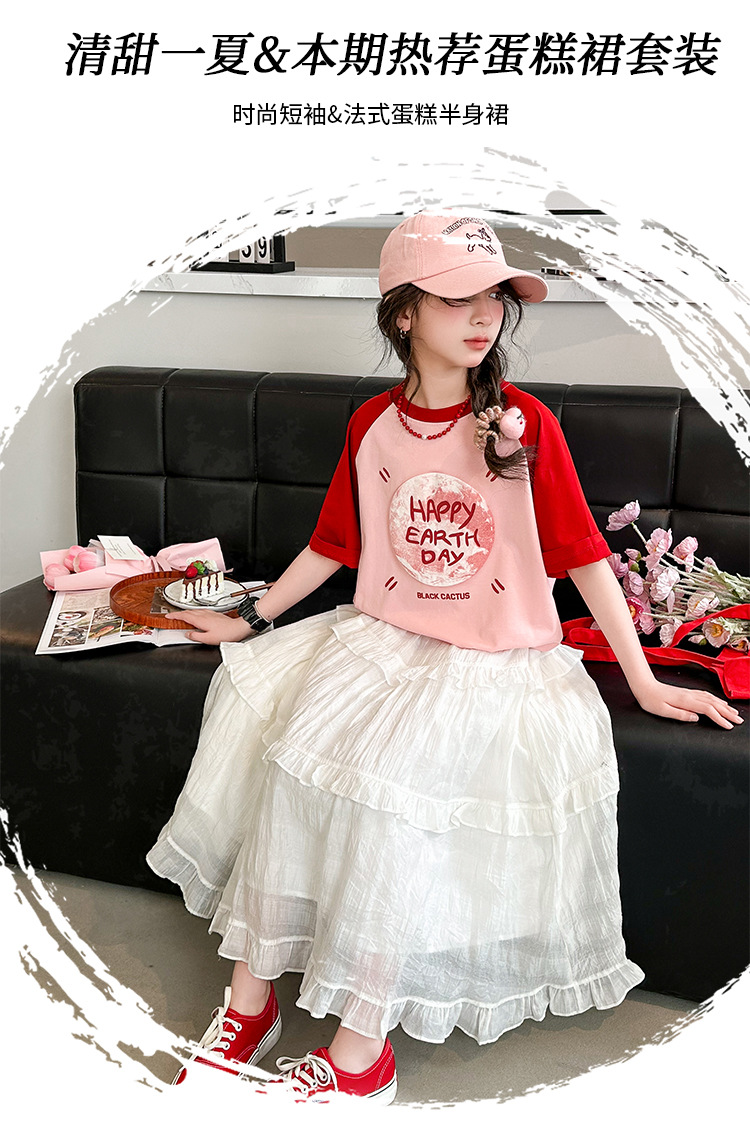 소녀 여름 반팔 티셔츠 세트 2025 새로운 스타일 소녀 편지 베이스 셔츠 스커트 케이크 스커트스토어 가기