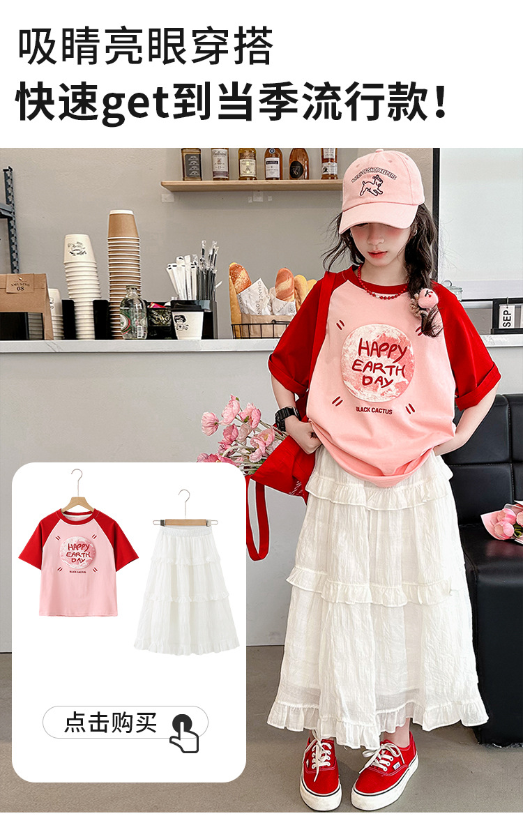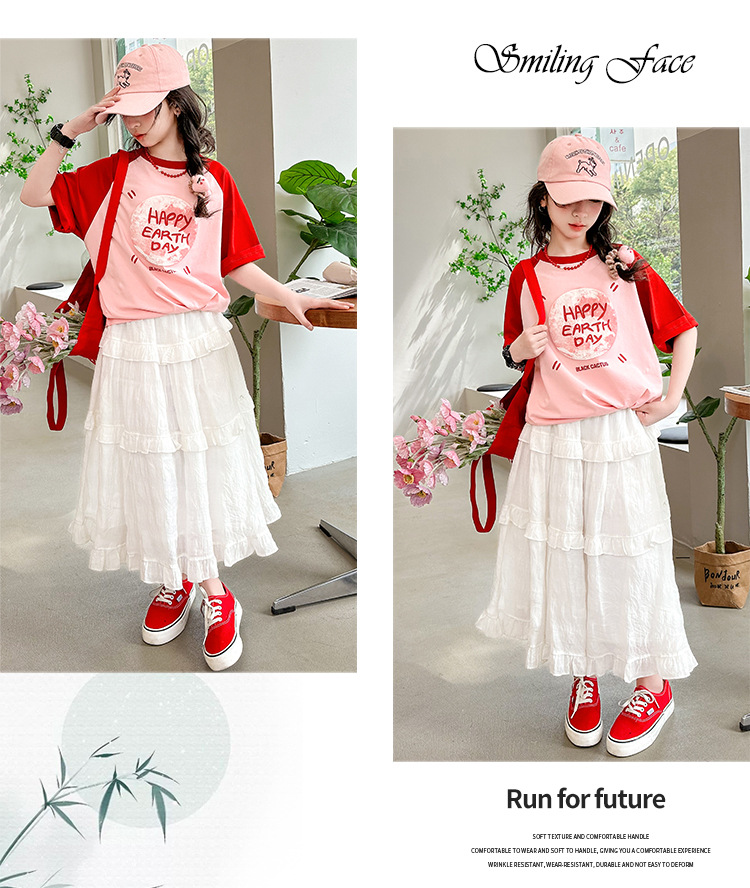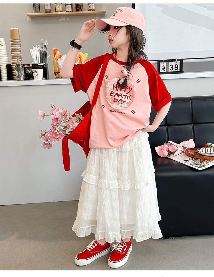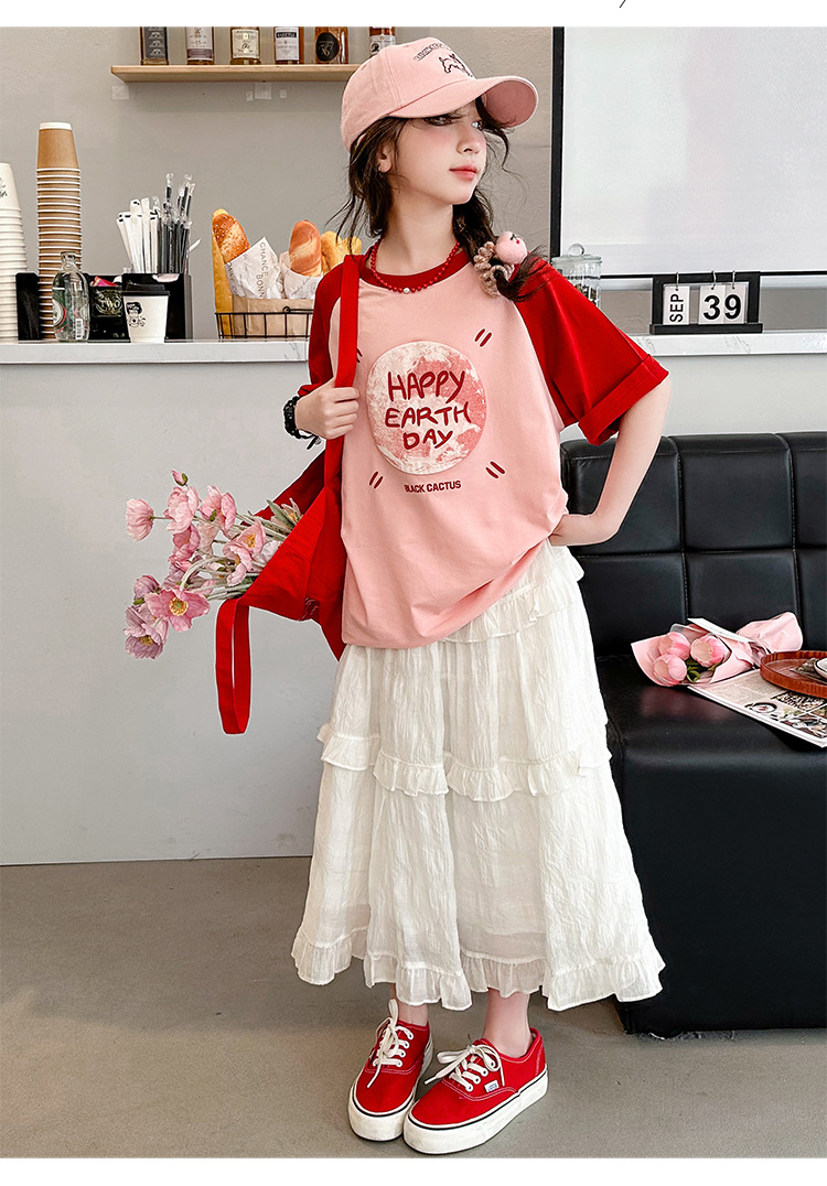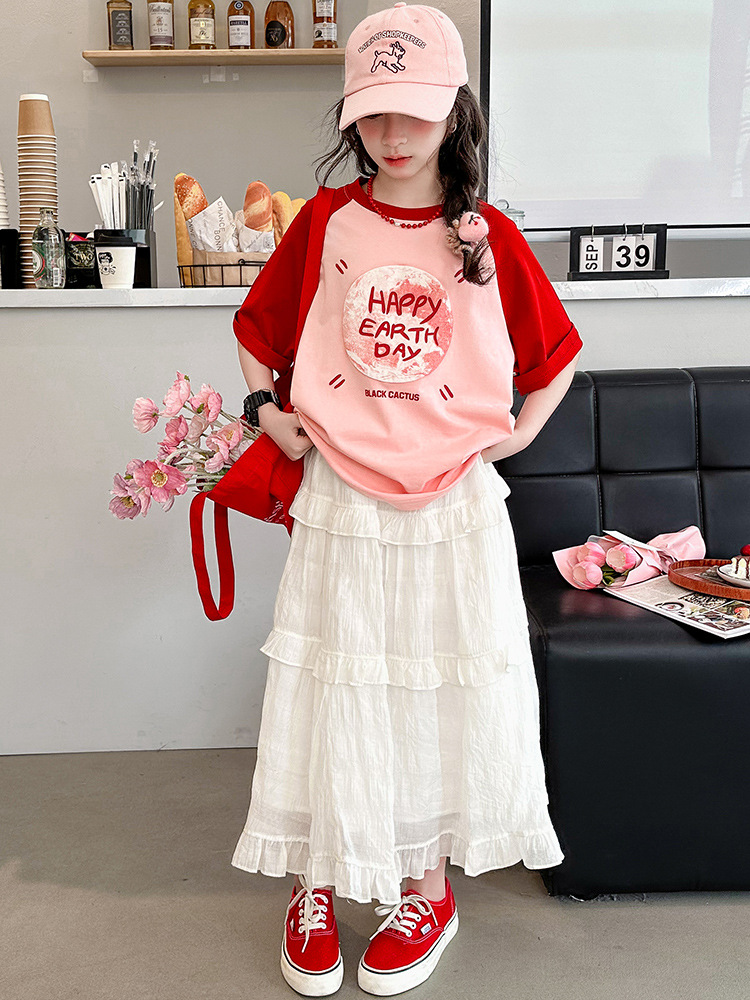 소녀 여름 반팔 티셔츠 세트 2025 새로운 스타일 소녀 편지 베이스 셔츠 스커트 케이크 스커트스토어 가기