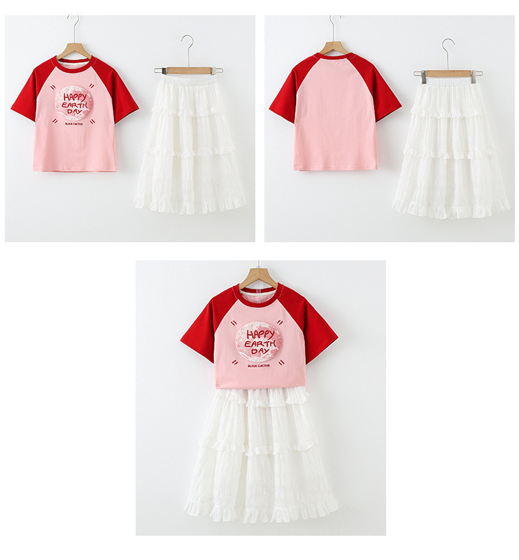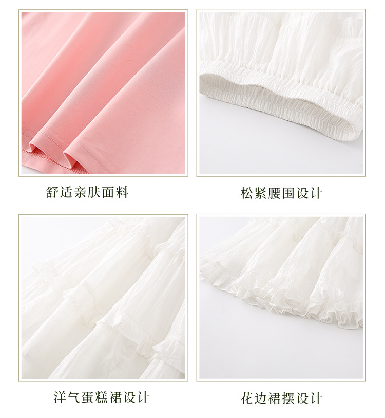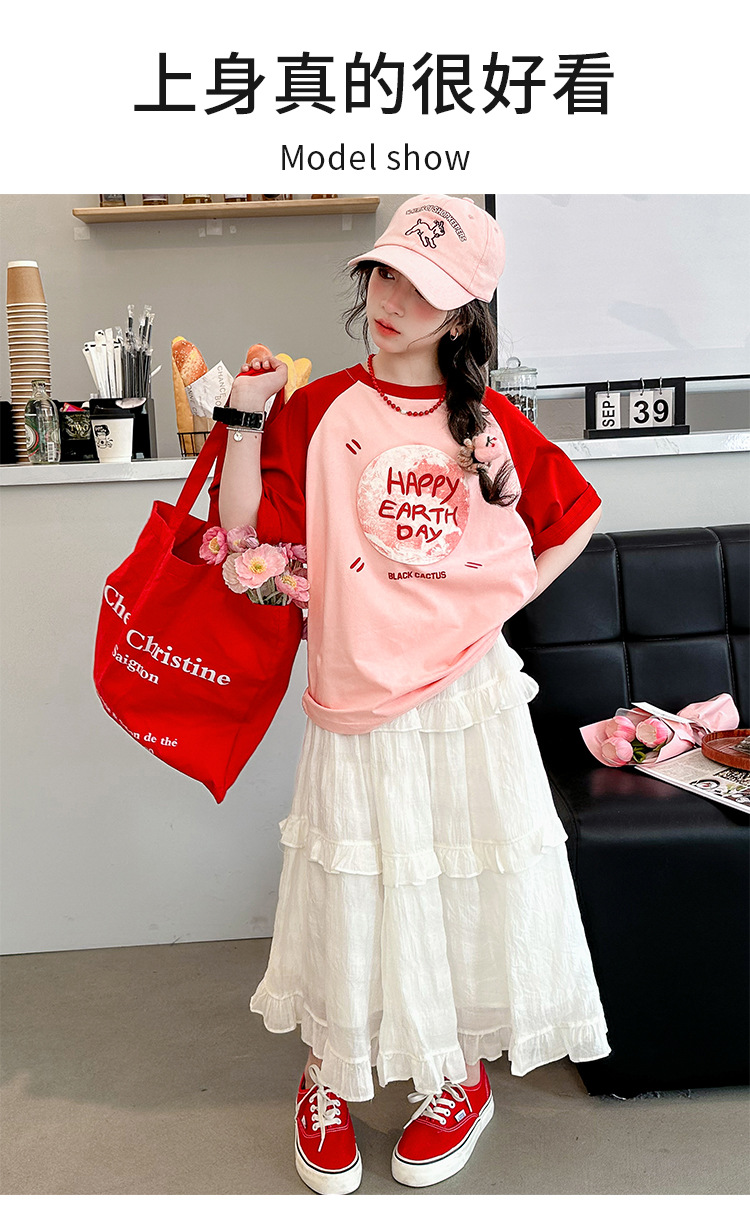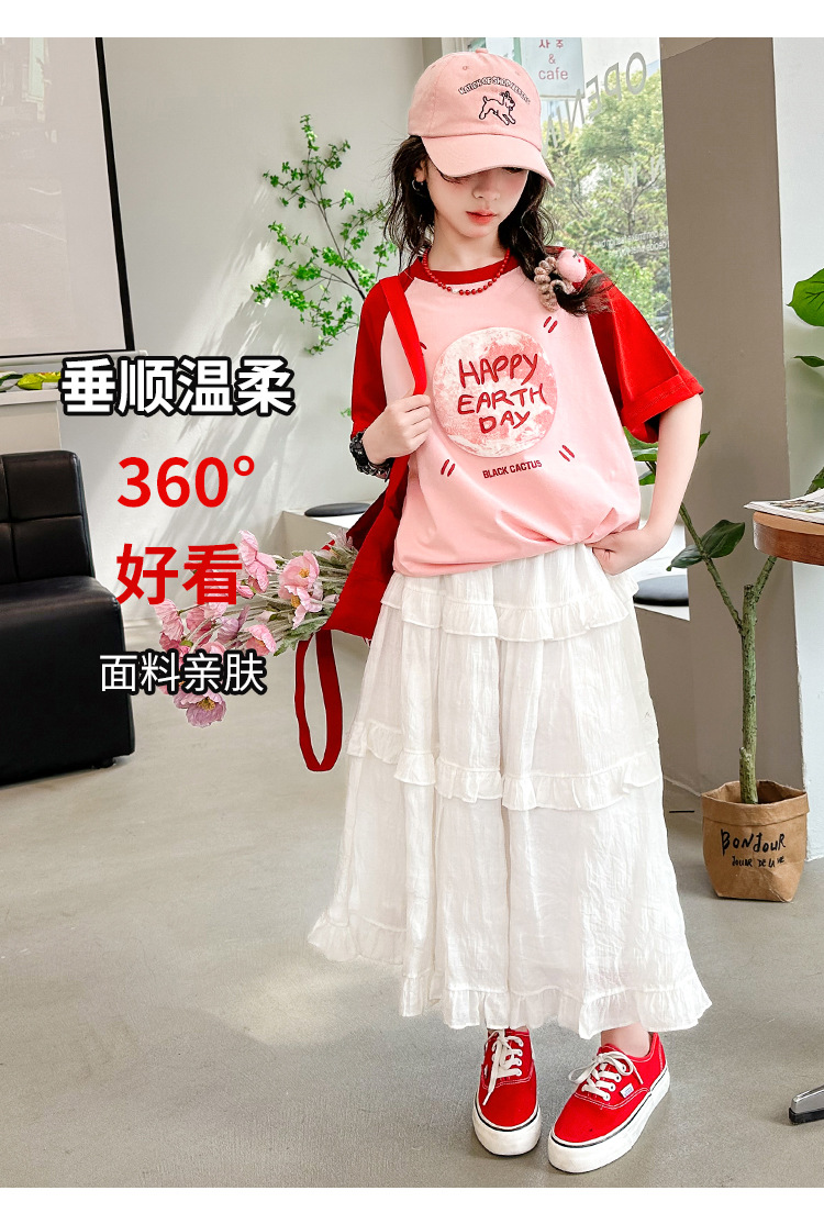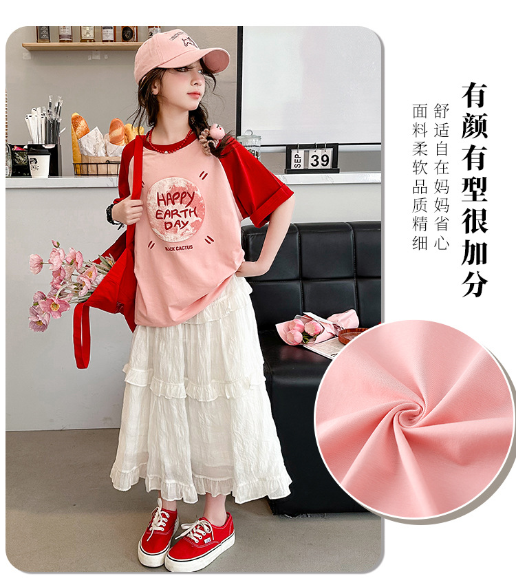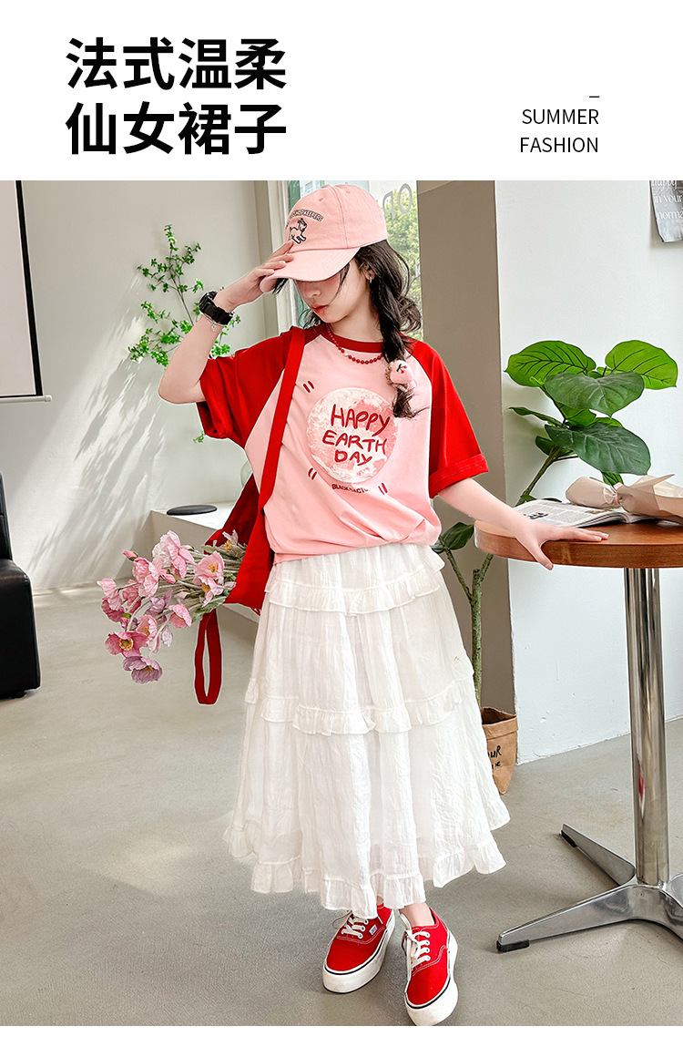 소녀 여름 반팔 티셔츠 세트 2025 새로운 스타일 소녀 편지 베이스 셔츠 스커트 케이크 스커트스토어 가기