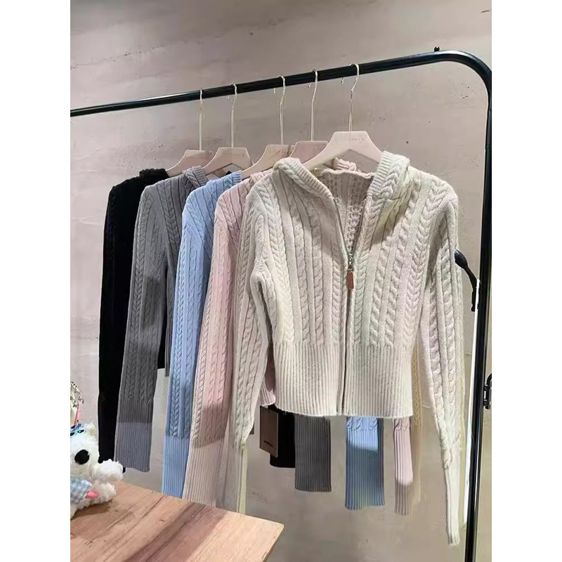 부드러운 바람 트위스트 후드 니트 카디건 여성용 봄과 가을 한국 스타일 게으른 지퍼 스웨터 코트 타이트 허리 쇼트 탑스토어 가기
