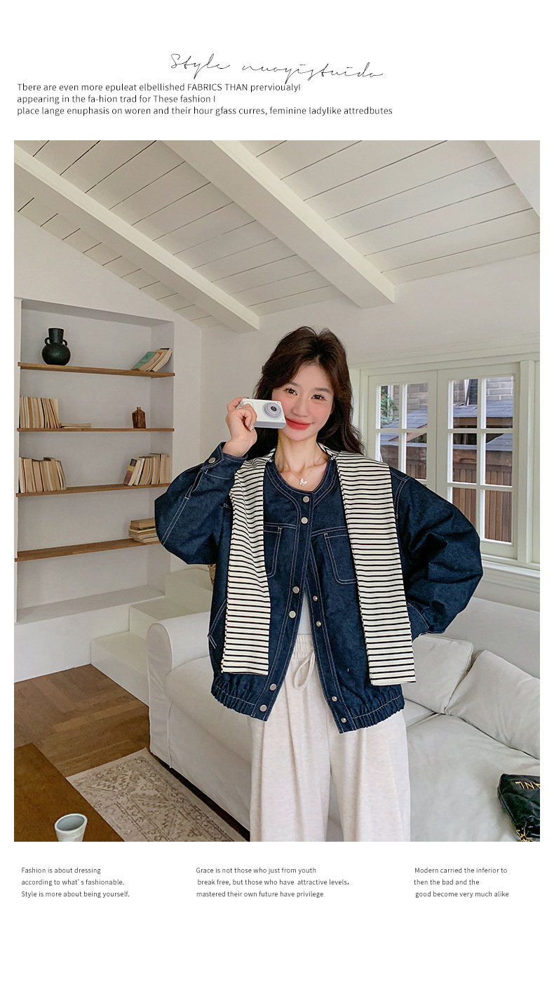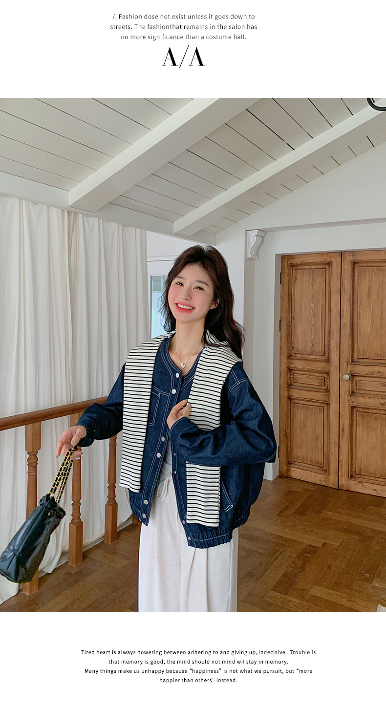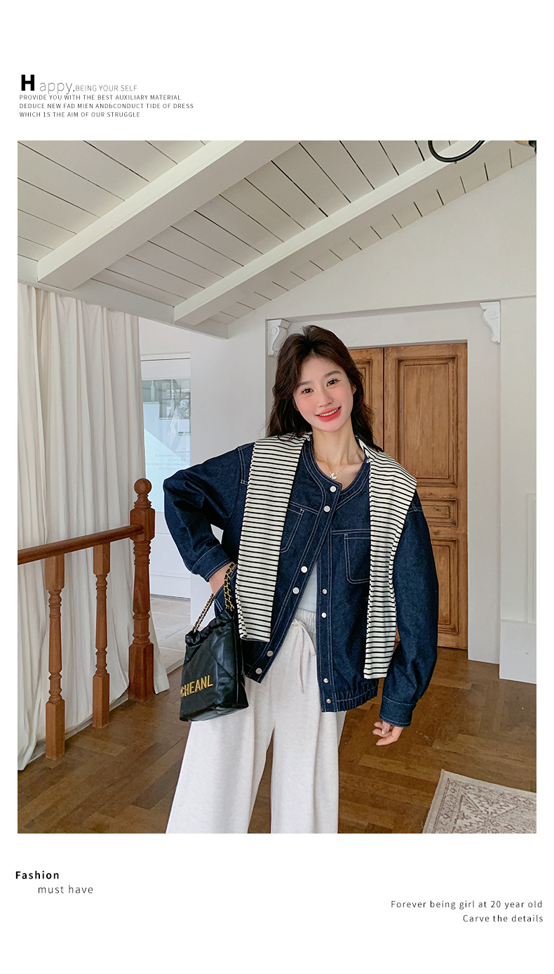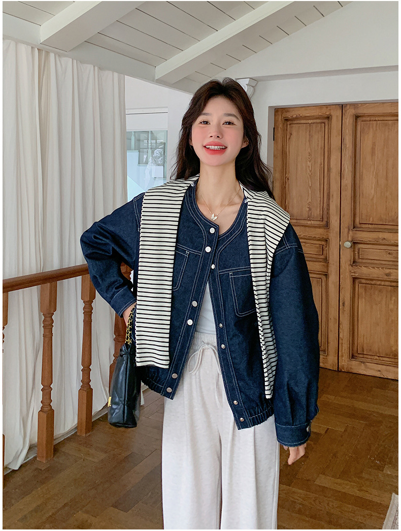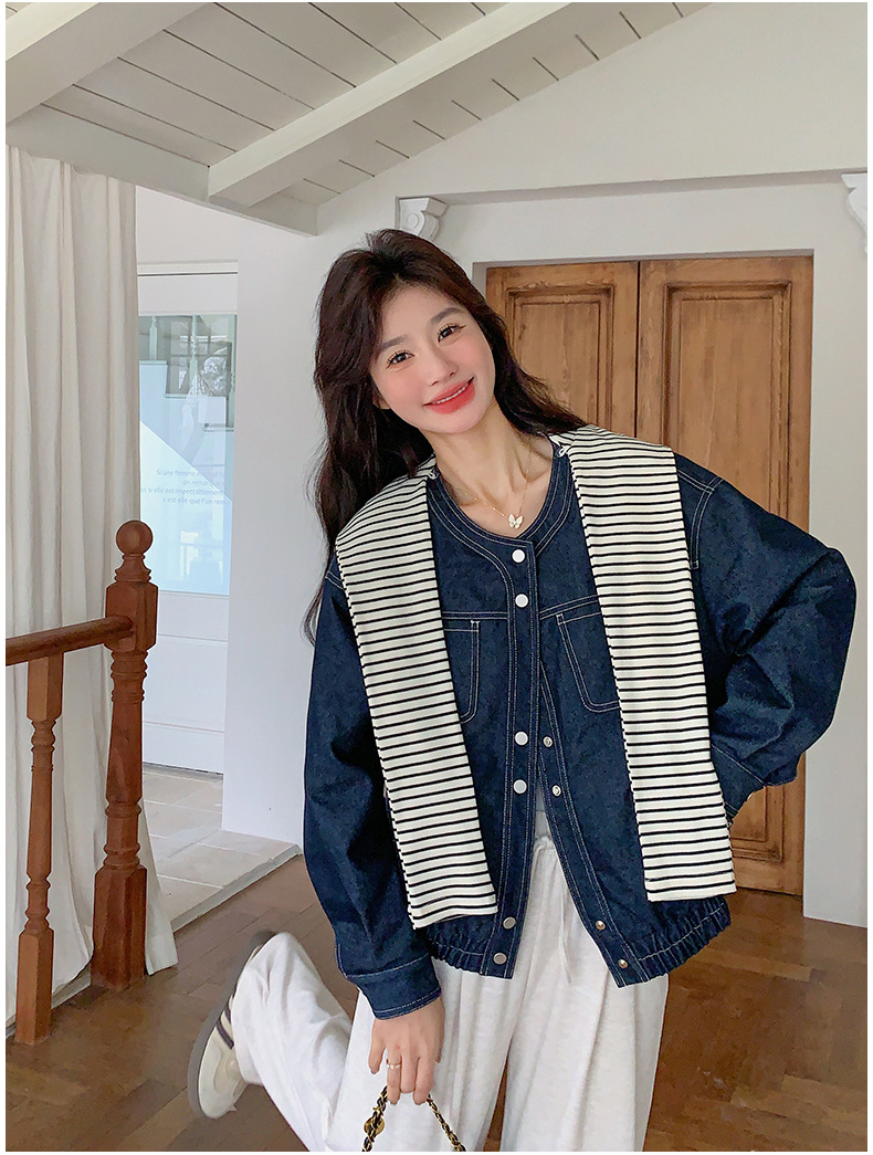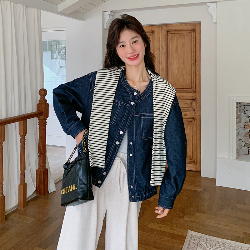 [Mengmei] 25 봄 스타일 패션 기질 라운드 넥 올매치 스트라이프 숄 느슨한 캐주얼 데님 코트 여성 패션스토어 가기