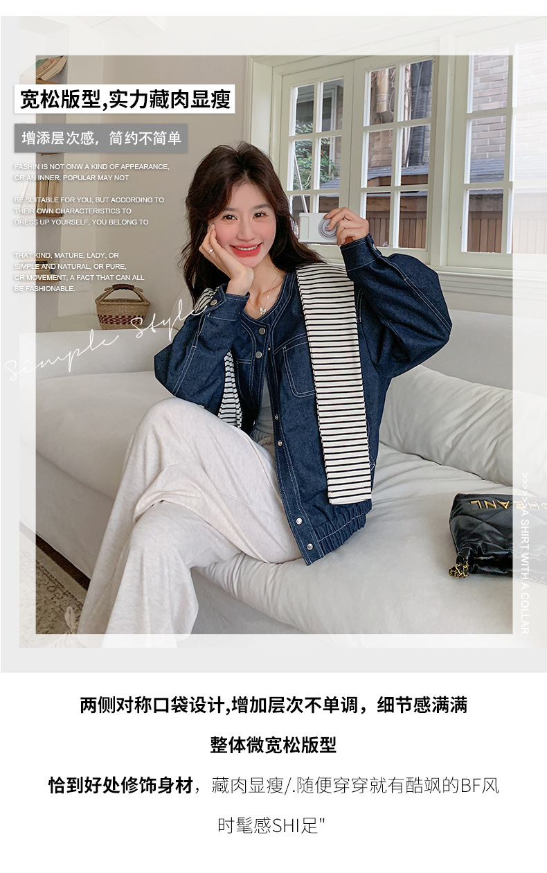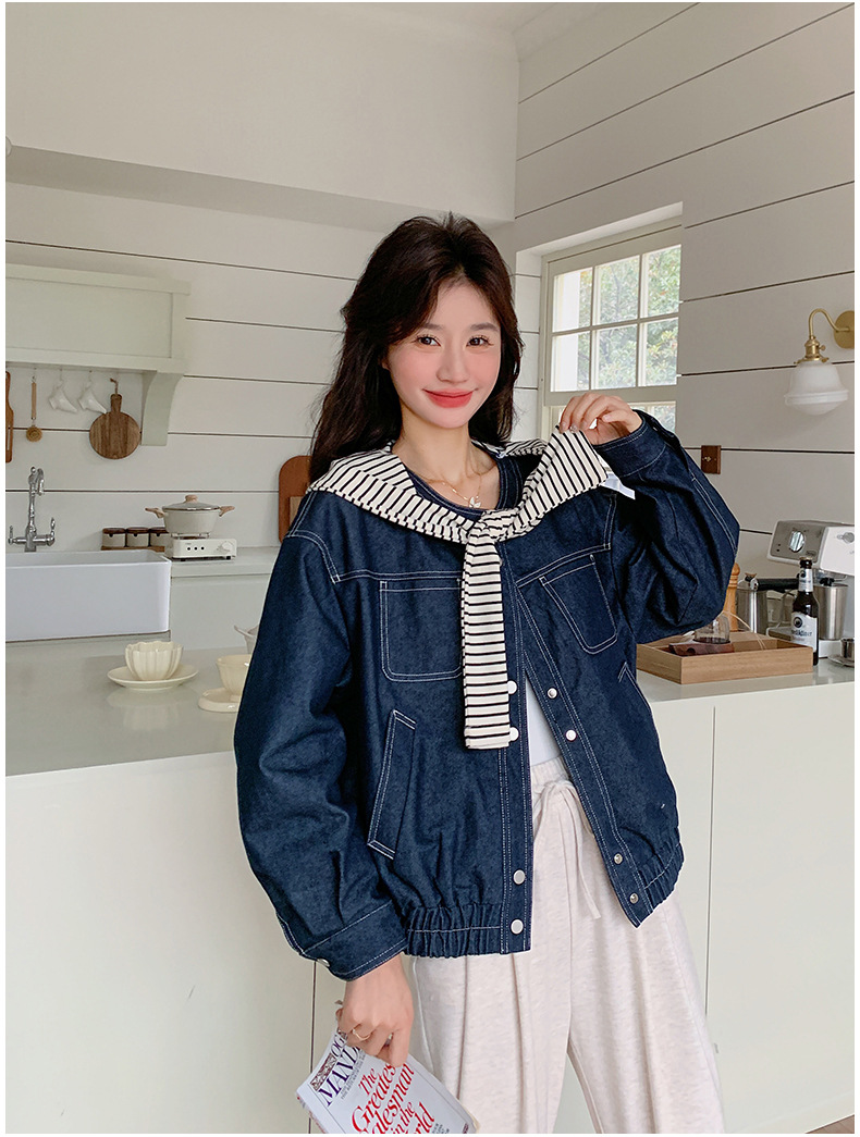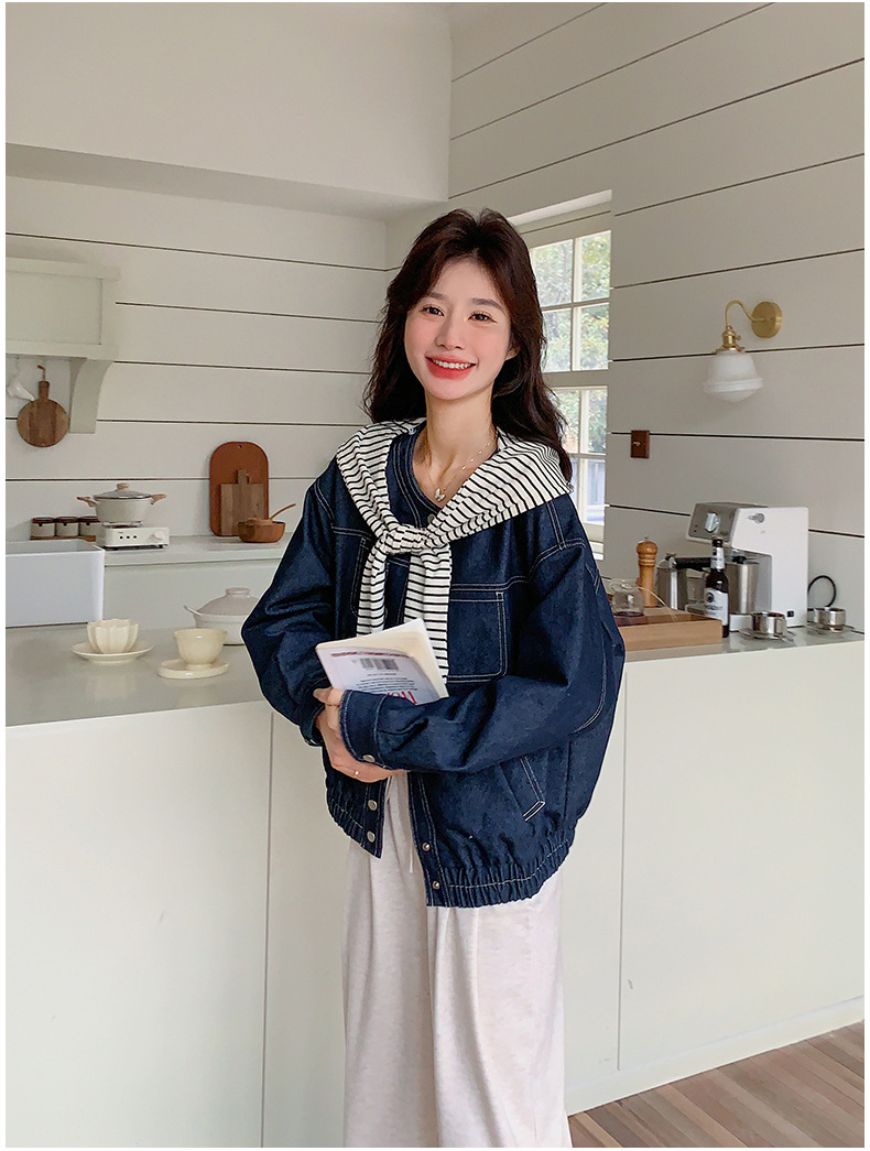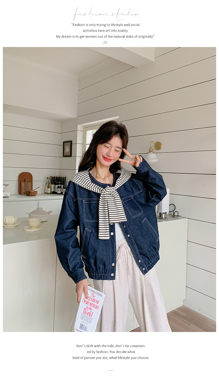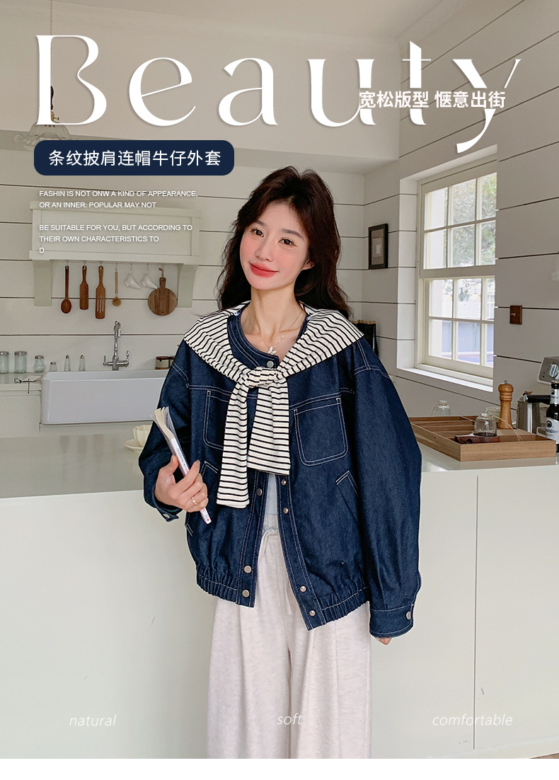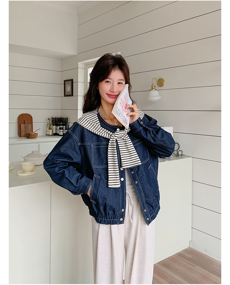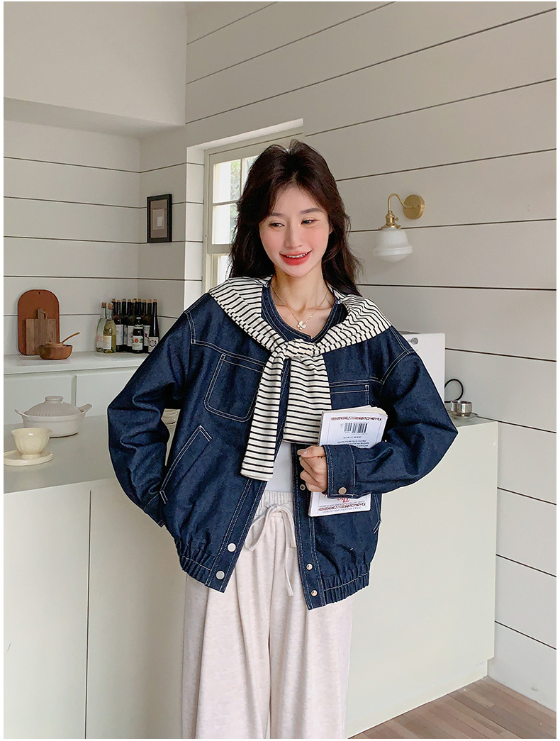 [Mengmei] 25 봄 스타일 패션 기질 라운드 넥 올매치 스트라이프 숄 느슨한 캐주얼 데님 코트 여성 패션스토어 가기