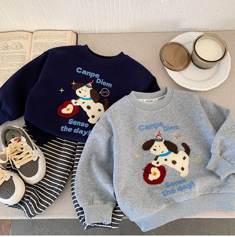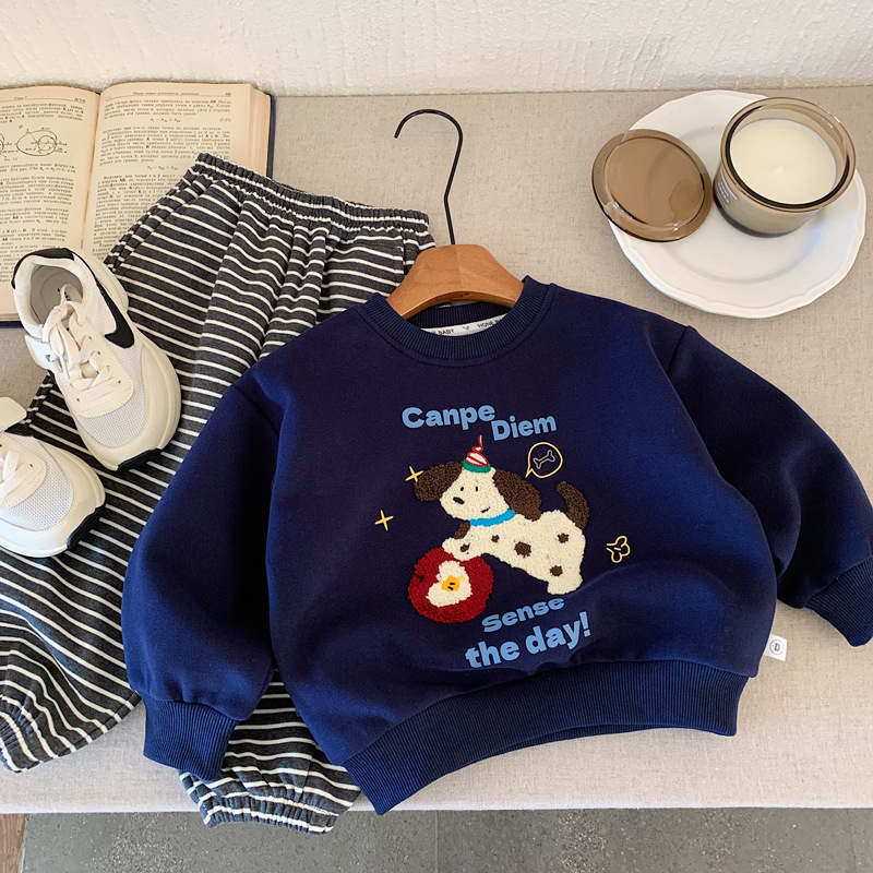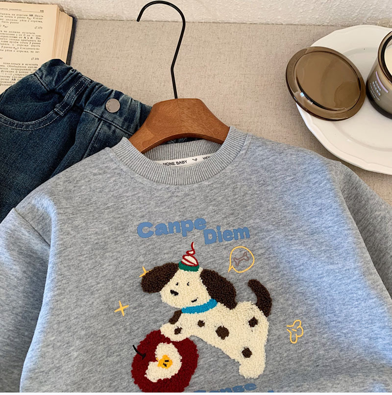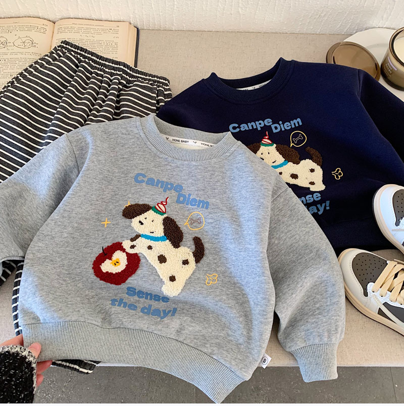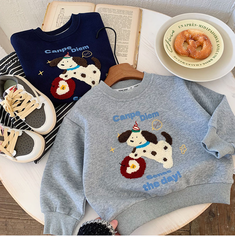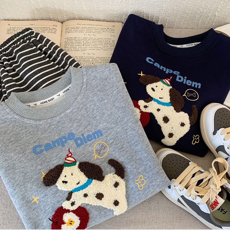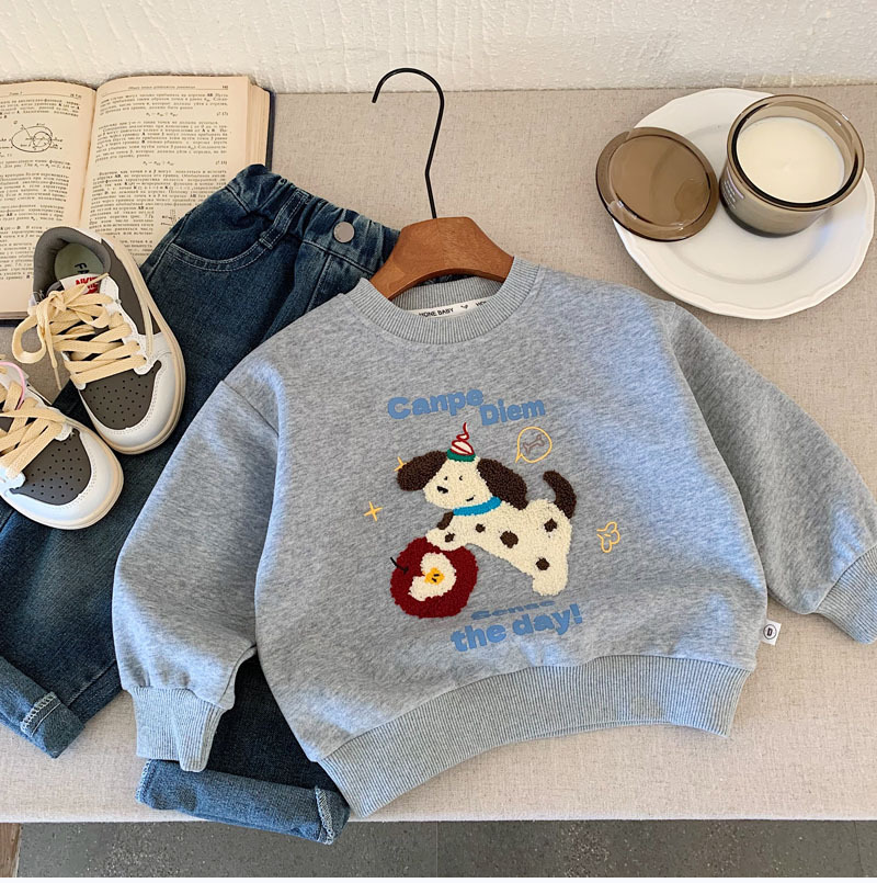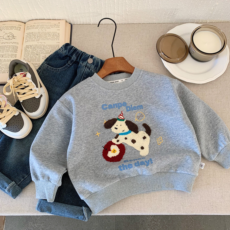 소년 캐주얼 풀오버 땀 2025 봄 새 어린이 타월 자수 중공업 자수 강아지 올매치 탑 트렌디스토어 가기
