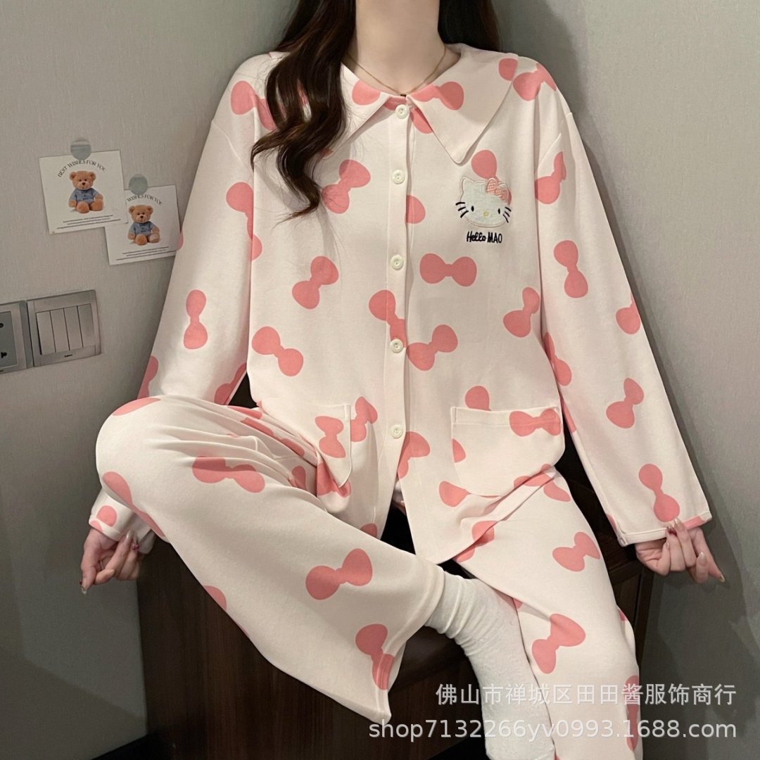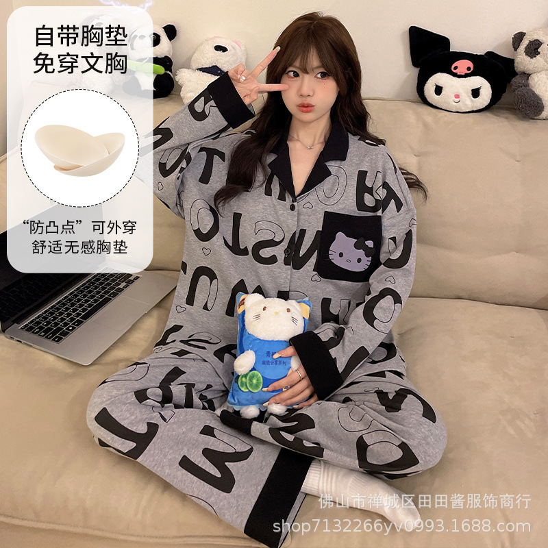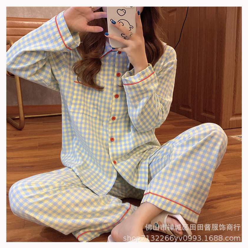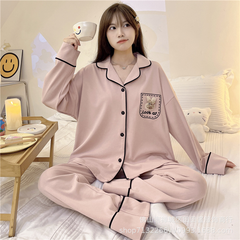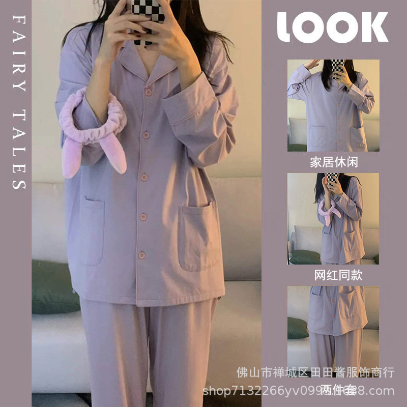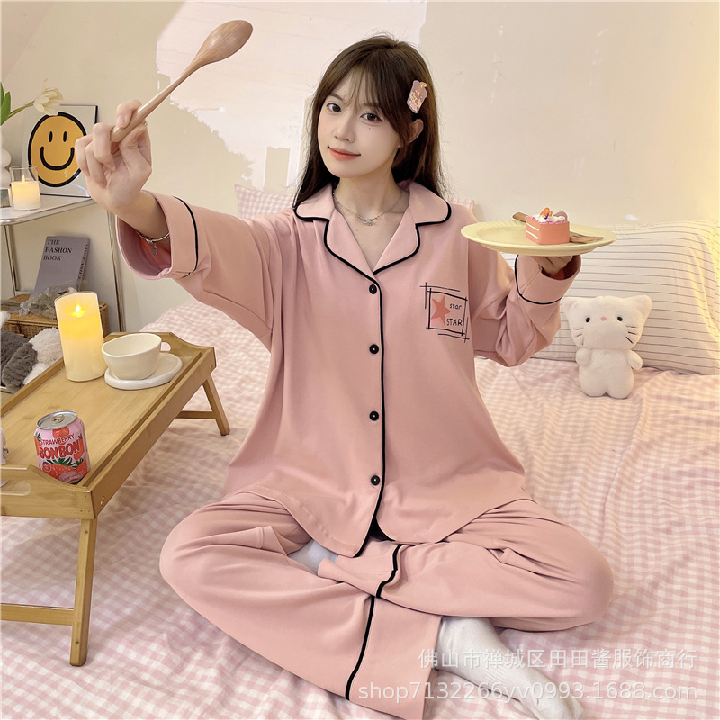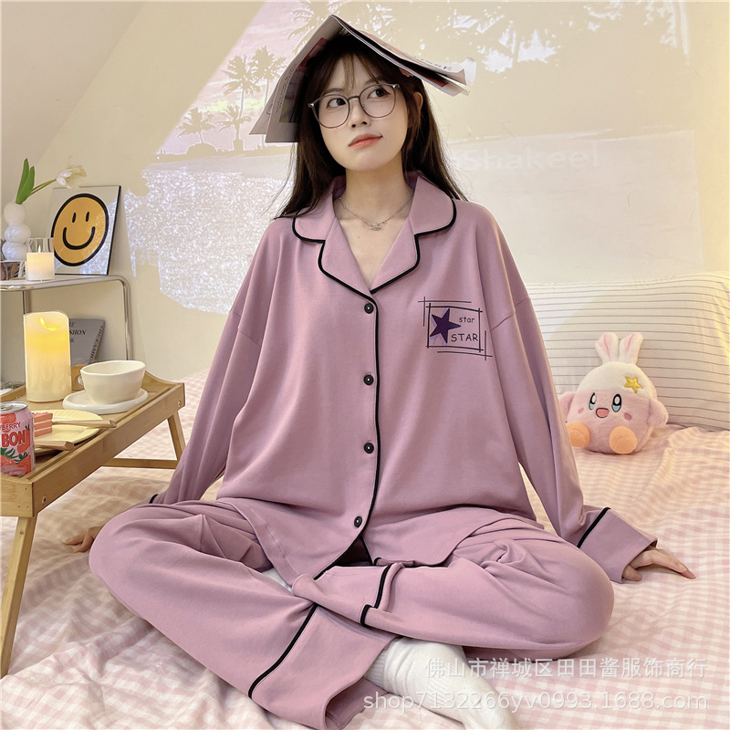 새로운 잠옷 여성용 긴팔 바지 카디건 옷깃 가짜 코튼 소녀 학생 투피스 플러스 사이즈 홈 옷 목욕스토어 가기