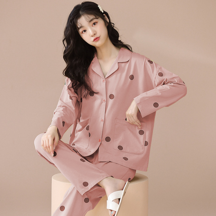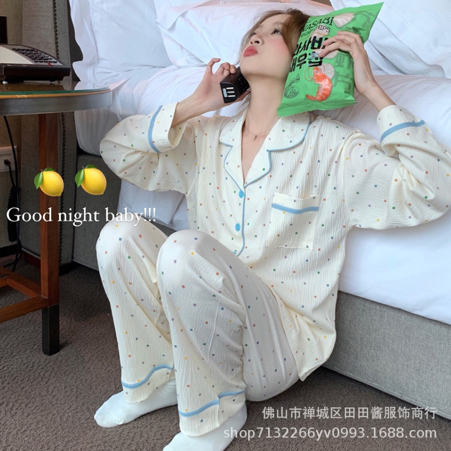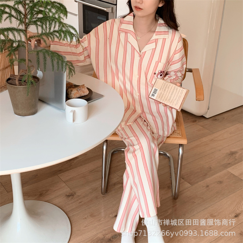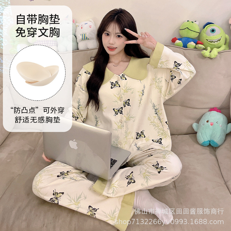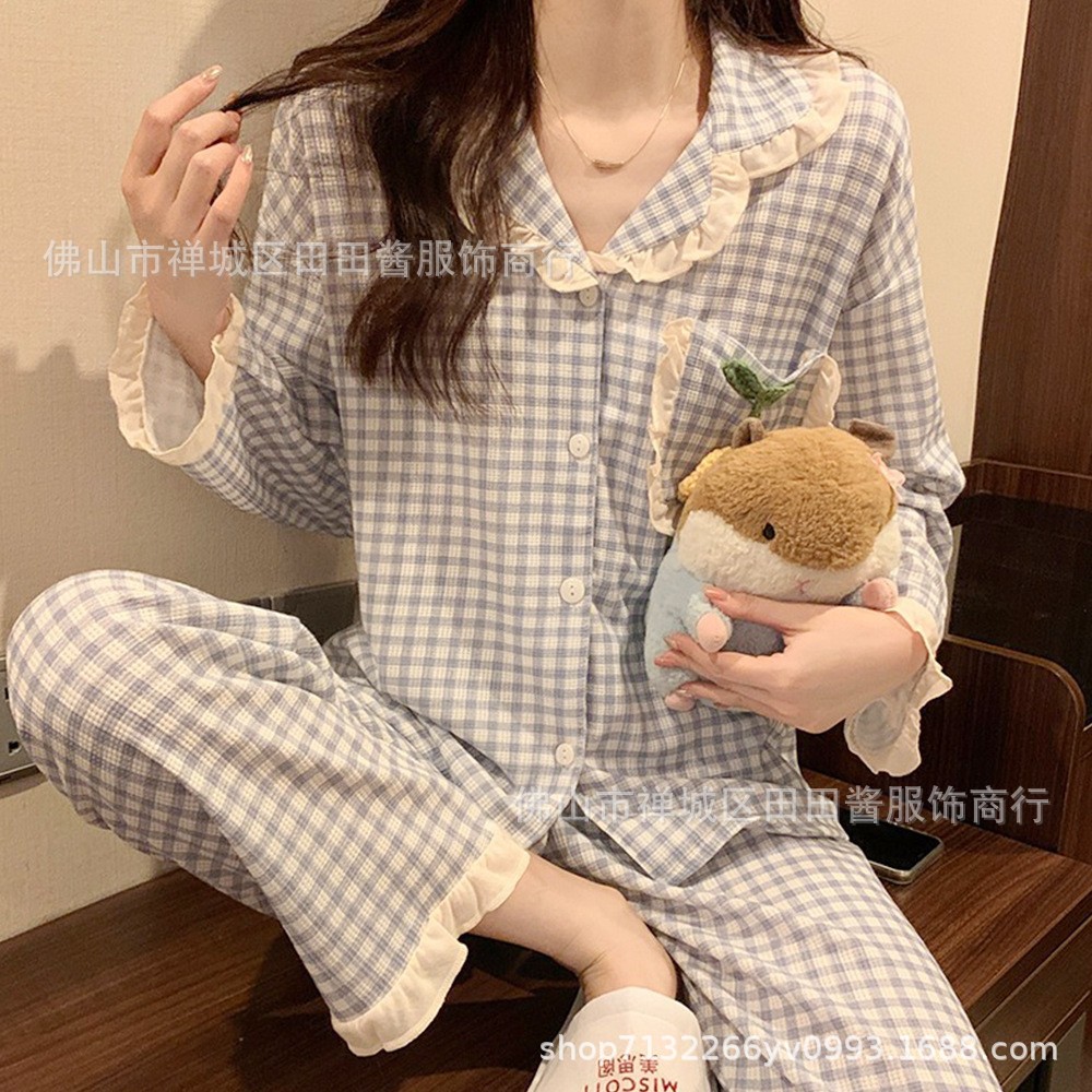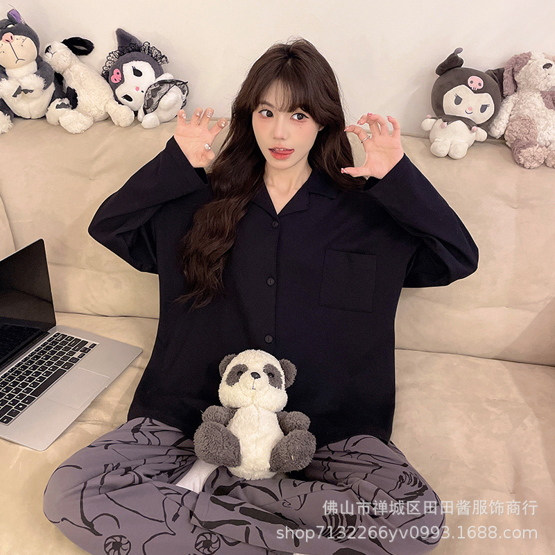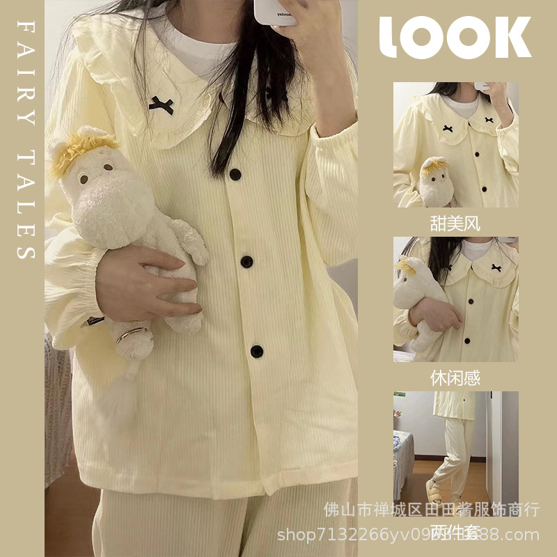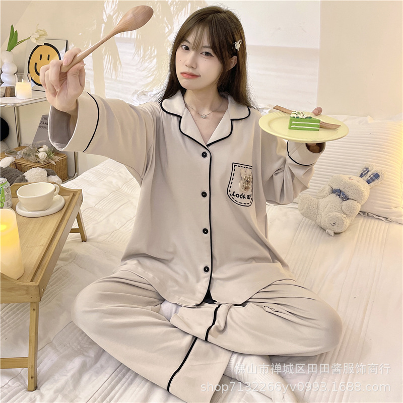 새로운 잠옷 여성용 긴팔 바지 카디건 옷깃 가짜 코튼 소녀 학생 투피스 플러스 사이즈 홈 옷 목욕스토어 가기