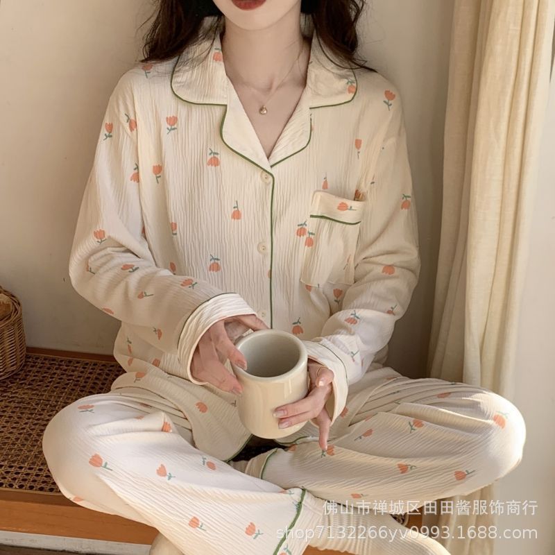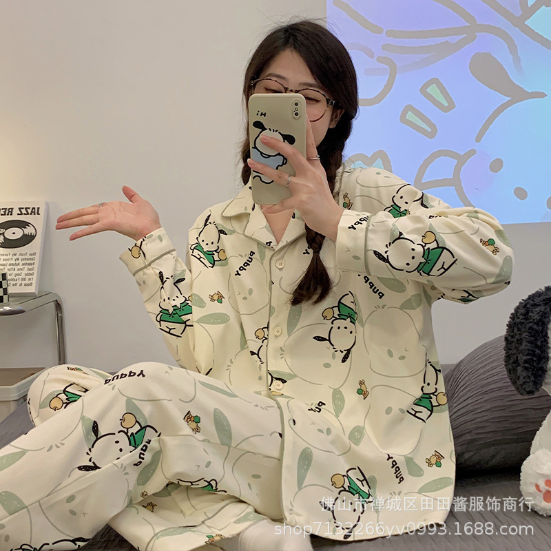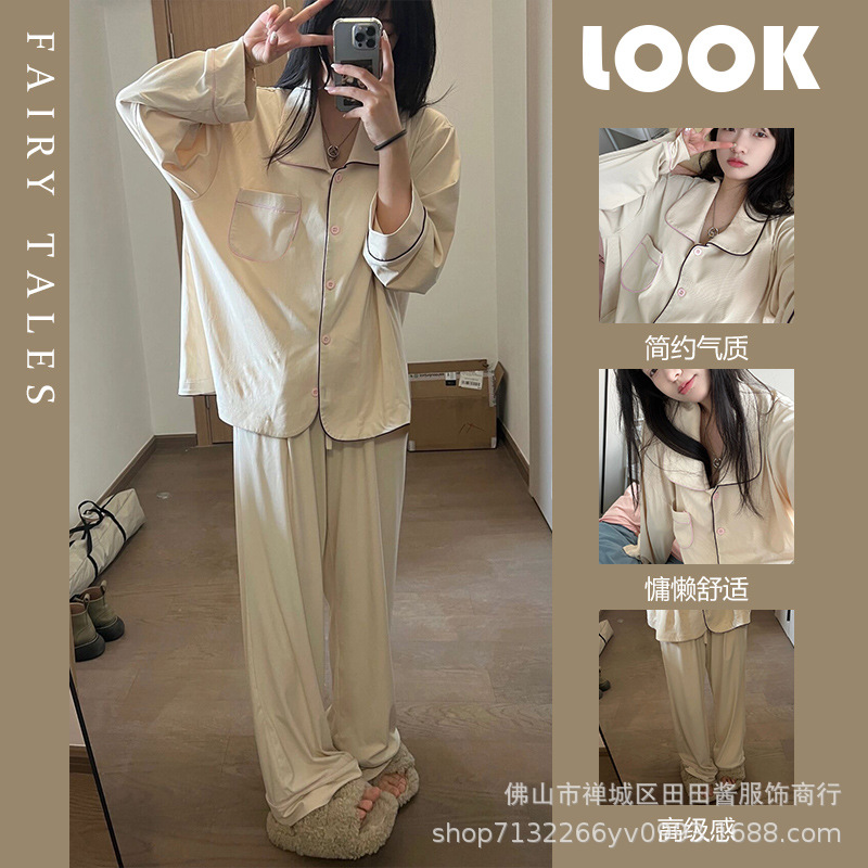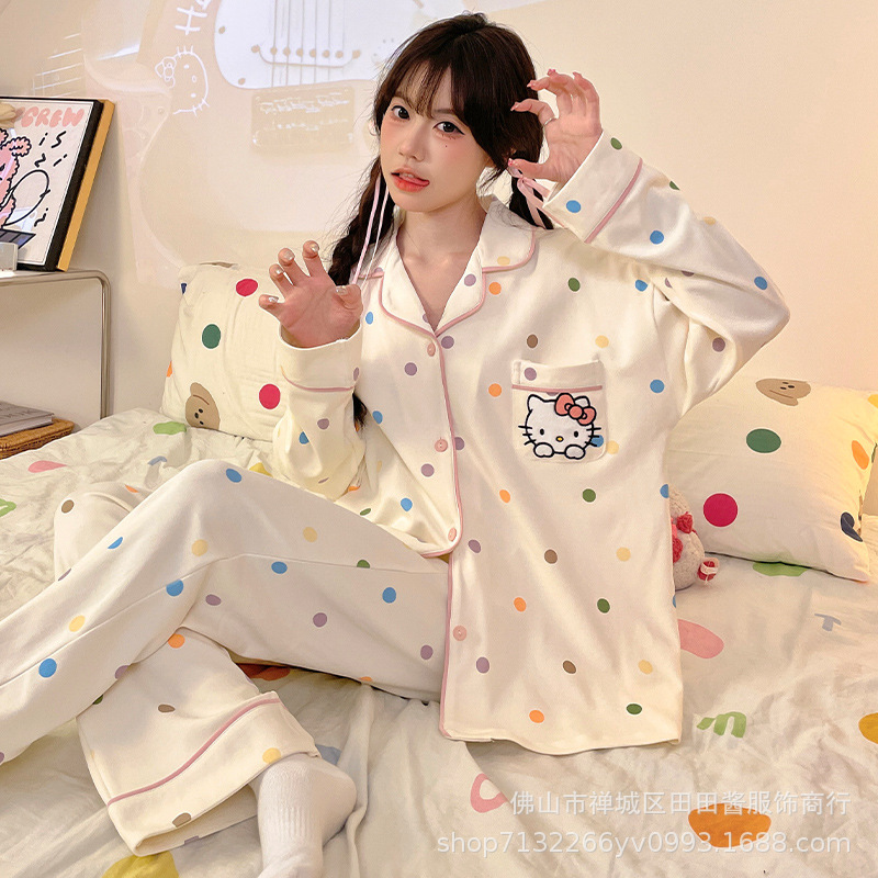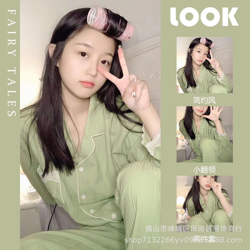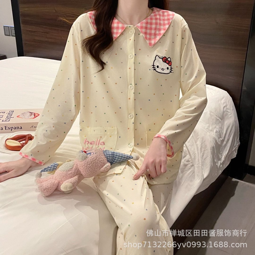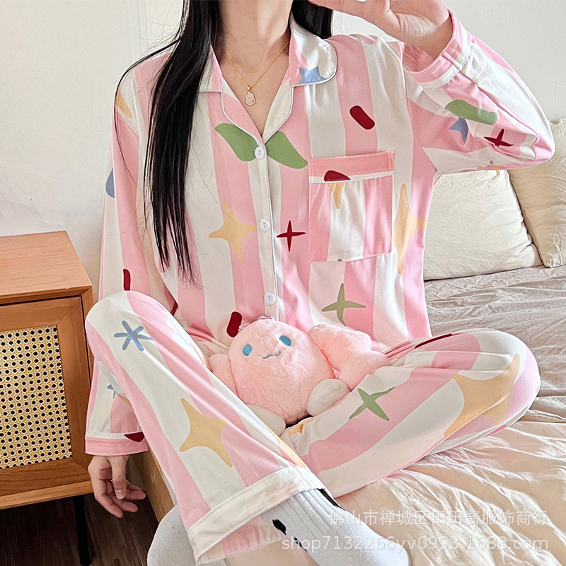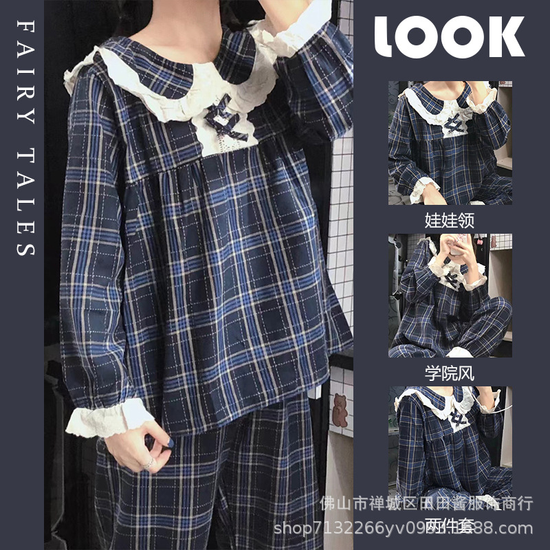 새로운 잠옷 여성용 긴팔 바지 카디건 옷깃 가짜 코튼 소녀 학생 투피스 플러스 사이즈 홈 옷 목욕스토어 가기