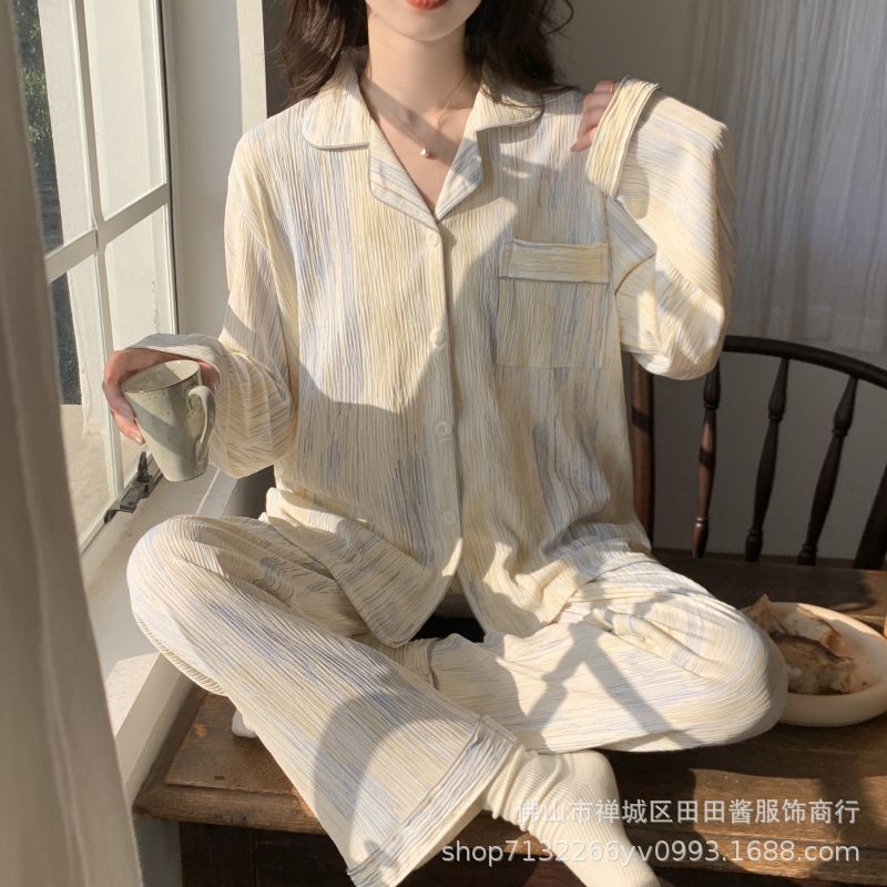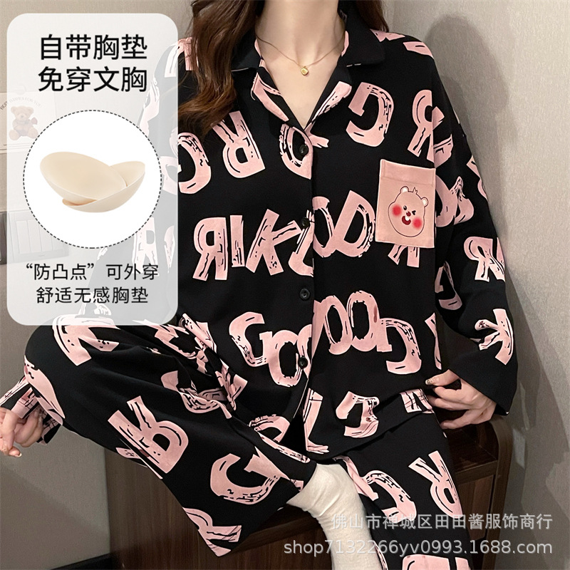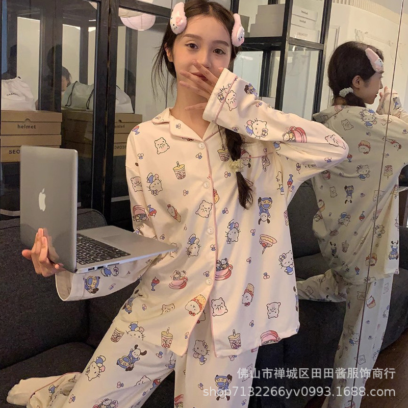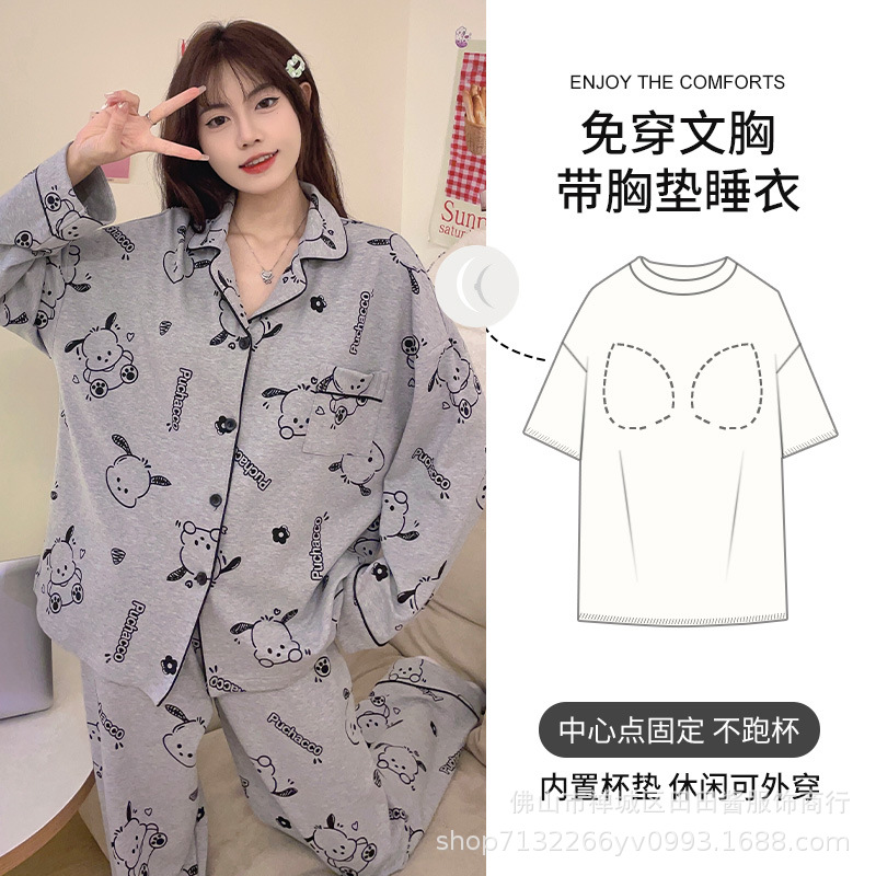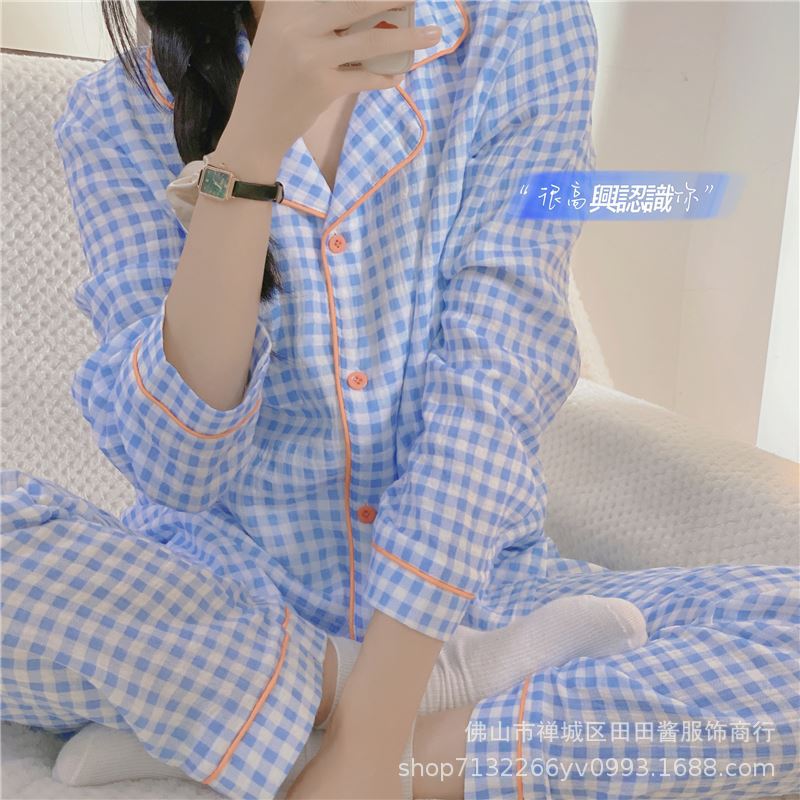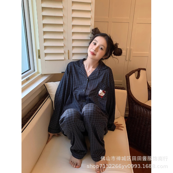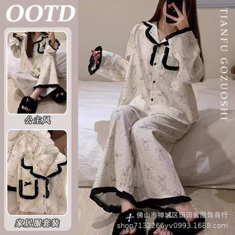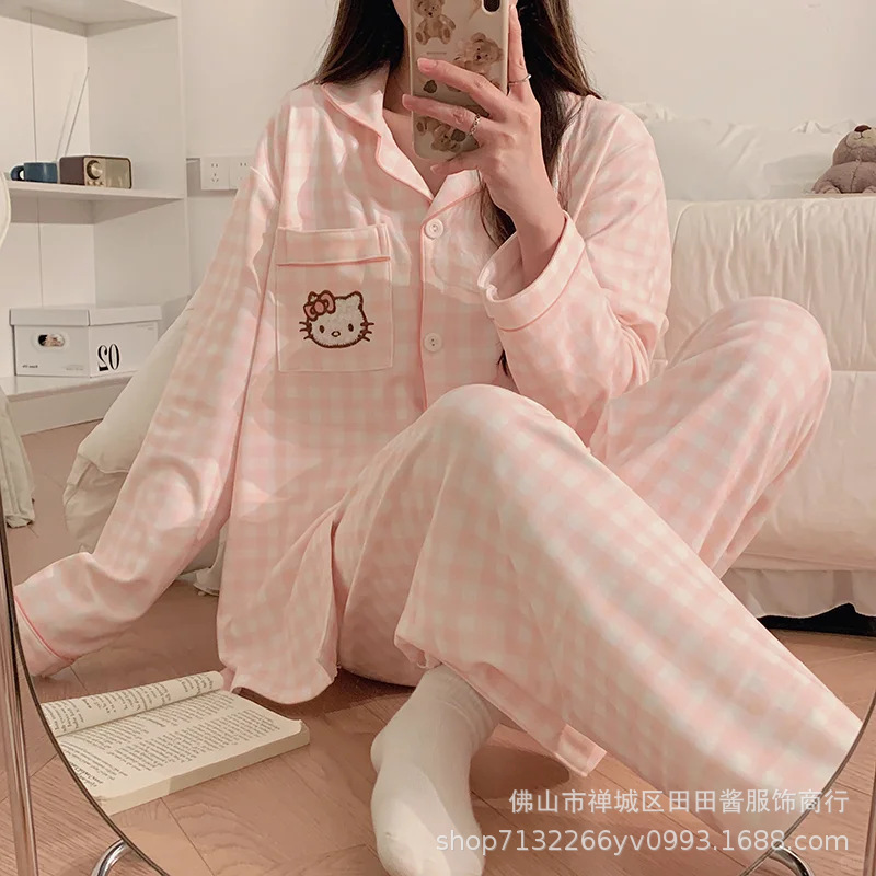 새로운 잠옷 여성용 긴팔 바지 카디건 옷깃 가짜 코튼 소녀 학생 투피스 플러스 사이즈 홈 옷 목욕스토어 가기