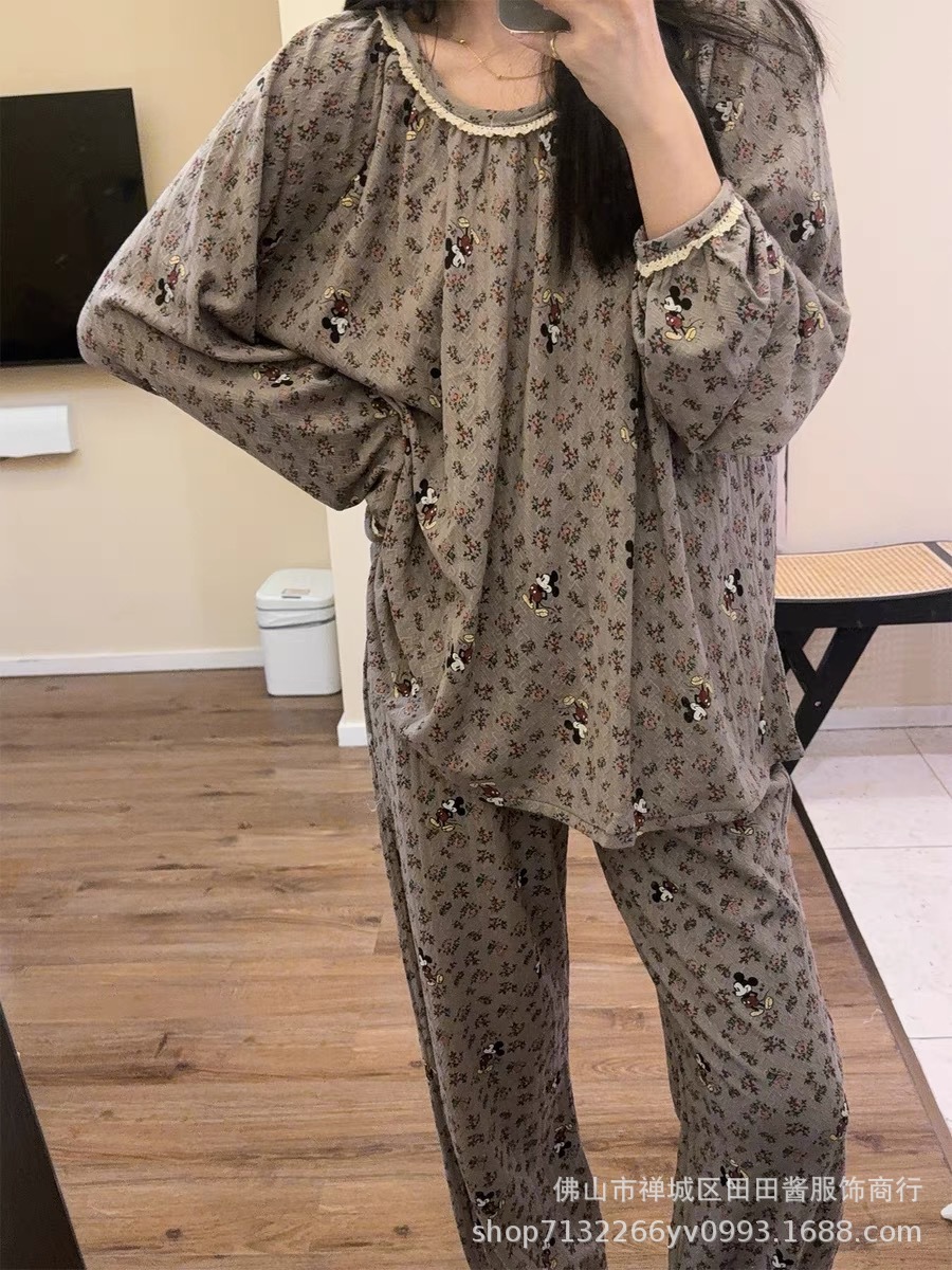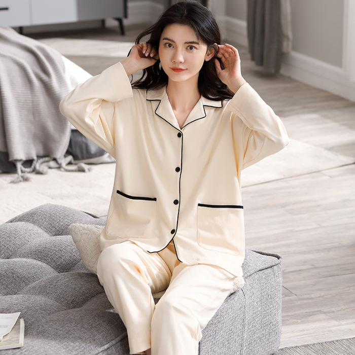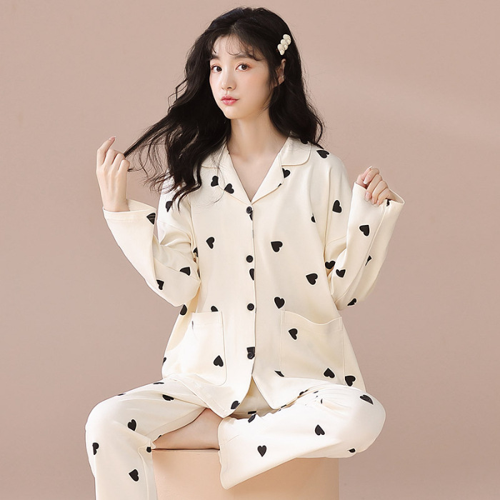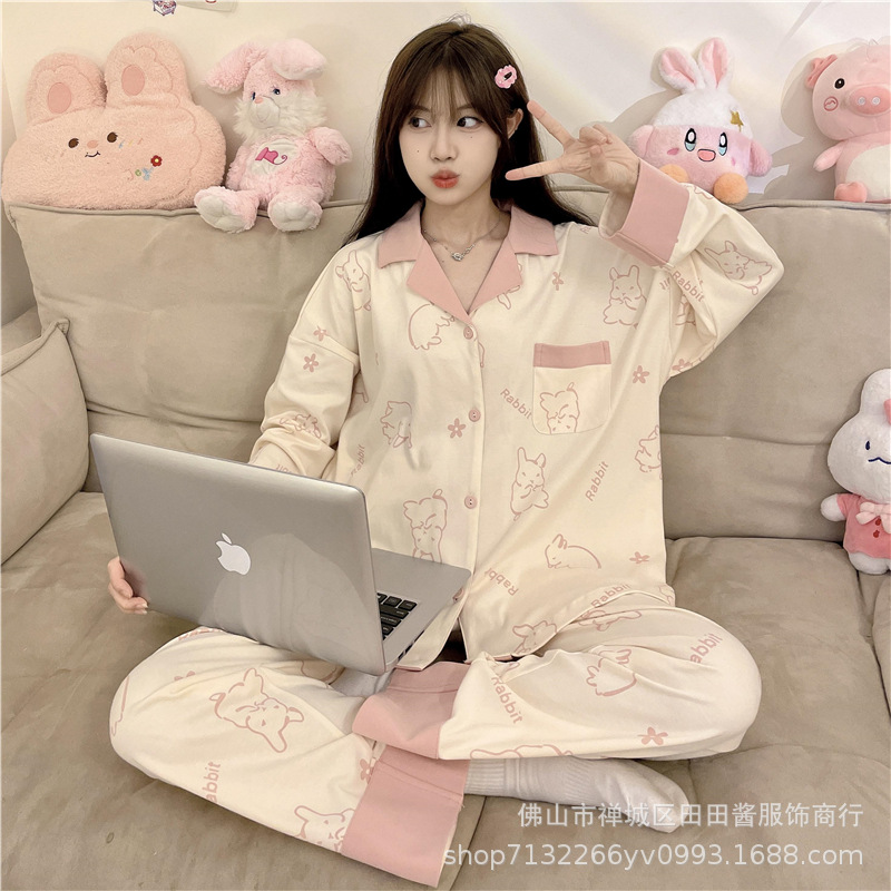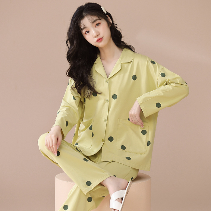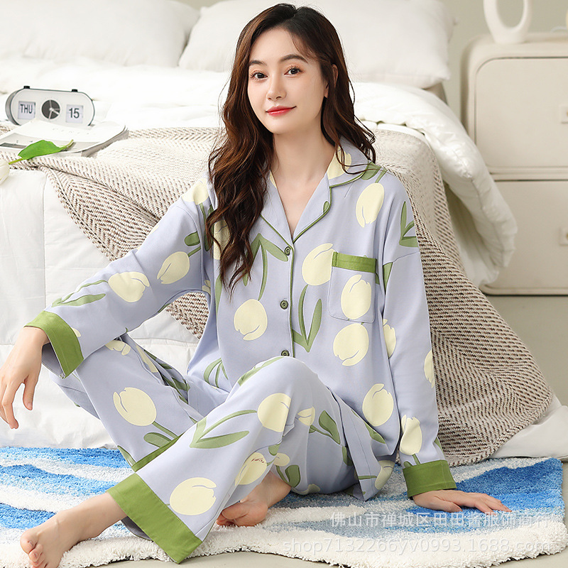 새로운 잠옷 여성용 긴팔 바지 카디건 옷깃 가짜 코튼 소녀 학생 투피스 플러스 사이즈 홈 옷 목욕