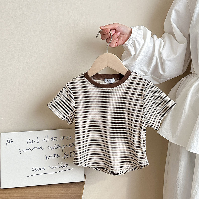 어린이 아메리칸 스타일 레트로 스트라이프 슬림 핏 반팔 콘트라스트 컬러 티셔츠 여성 여름 코튼 칼리지 올 매치 웨스턴 스타일 라운드 넥 탑