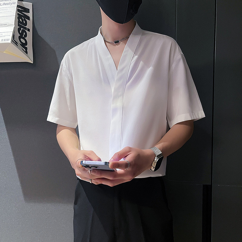 새로운 잘 생긴 셔츠 남성 국가 스타일 여름 새로운 중국 스타일 V-Neck 느슨한 하이 엔드 디자인 숨겨진 버튼 셔츠 반팔 남성 스타일스토어 가기