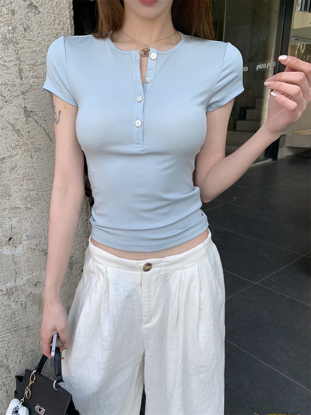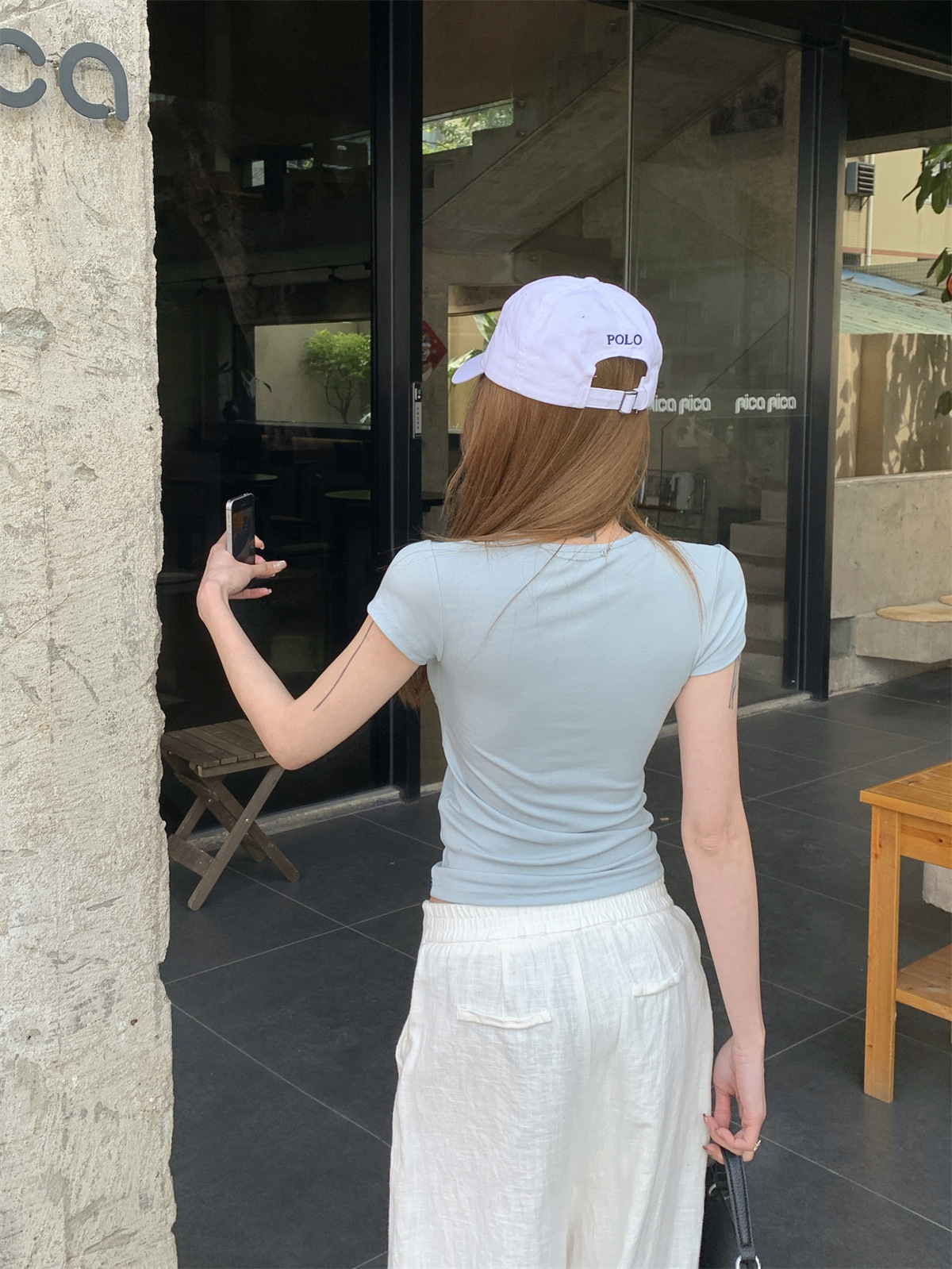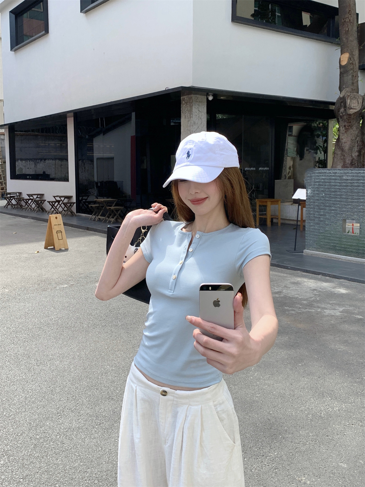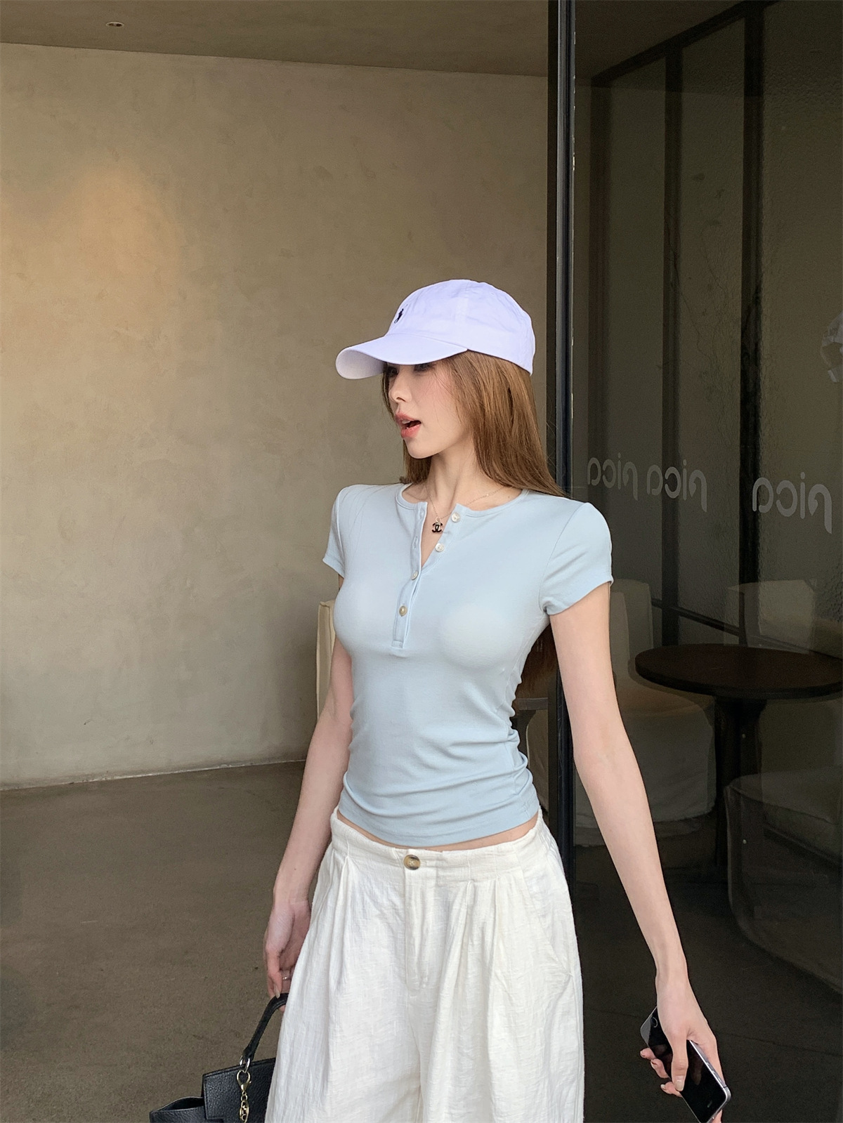 블루 반팔 어깨 티셔츠 여성용 여름 반 오픈 칼라 슬림 핏 슬림 핏 스파이스 걸스 내부 스트레치 타이트베이스 탑스토어 가기