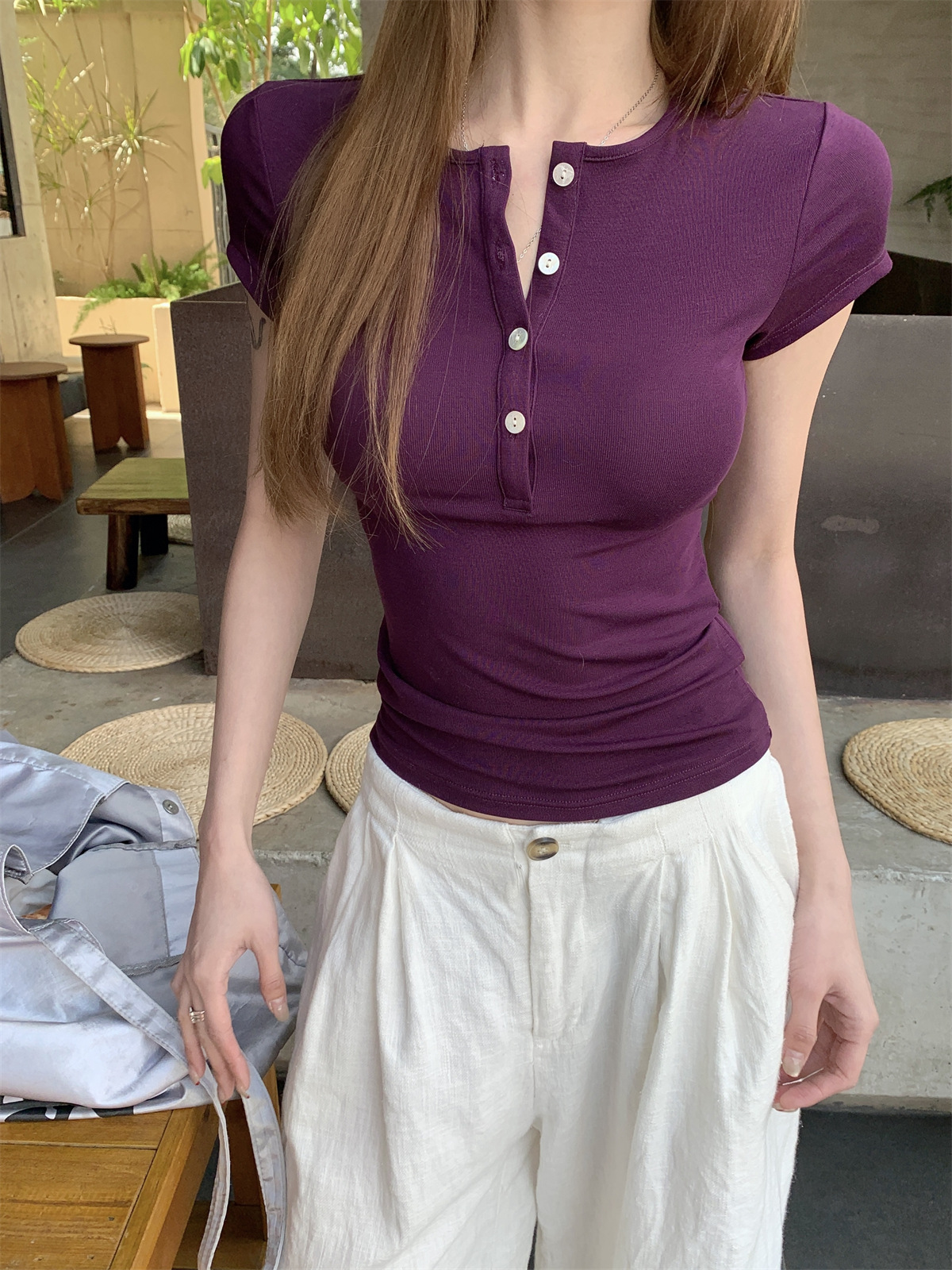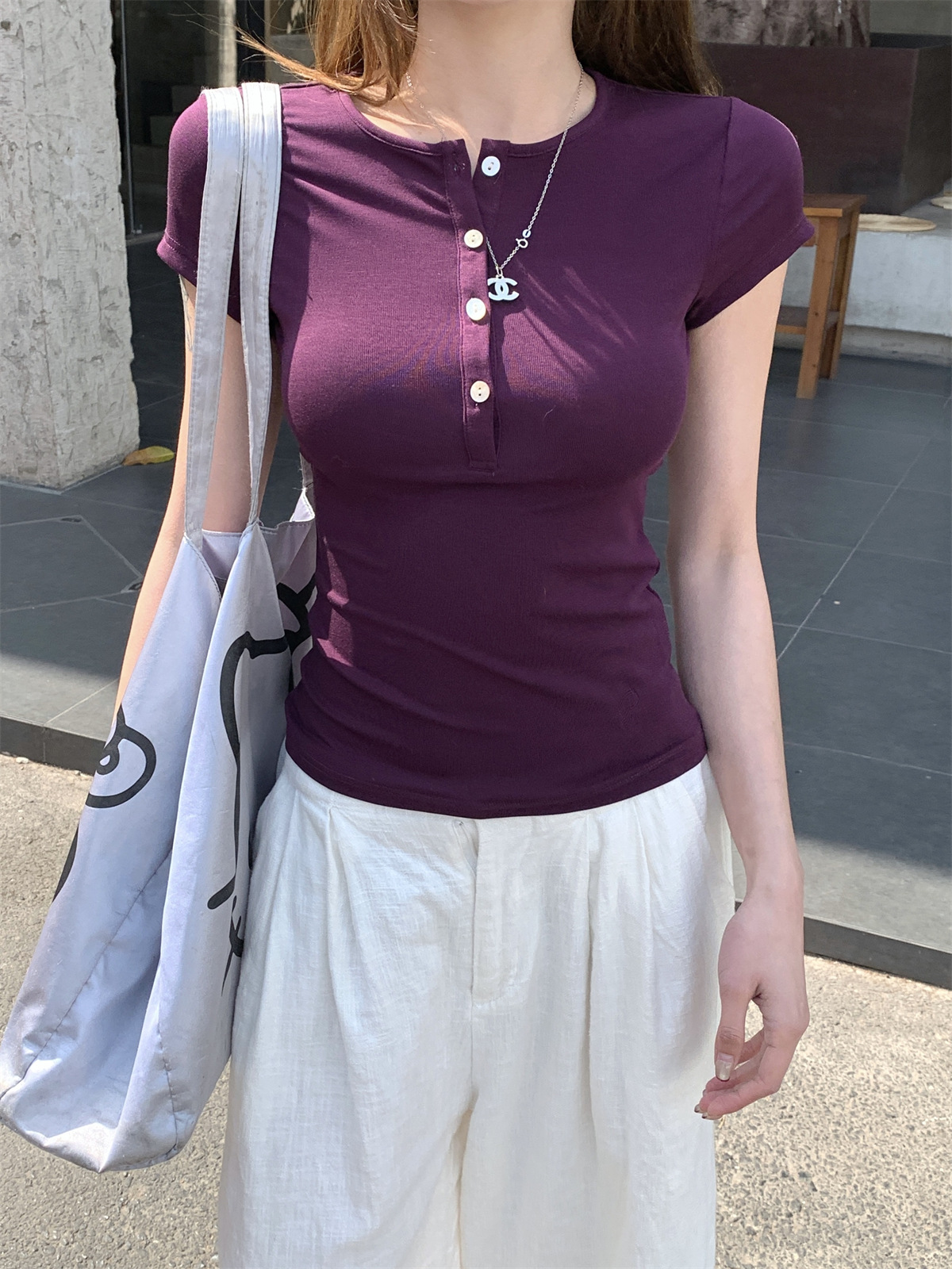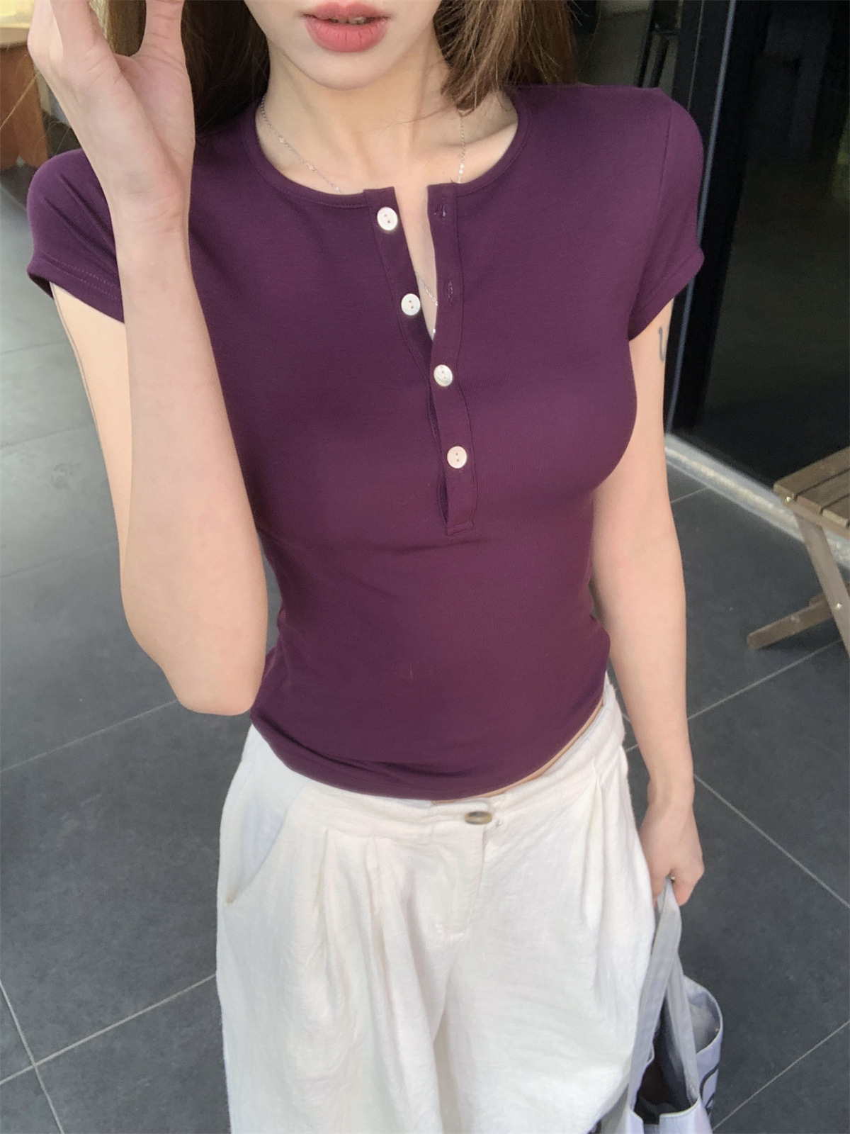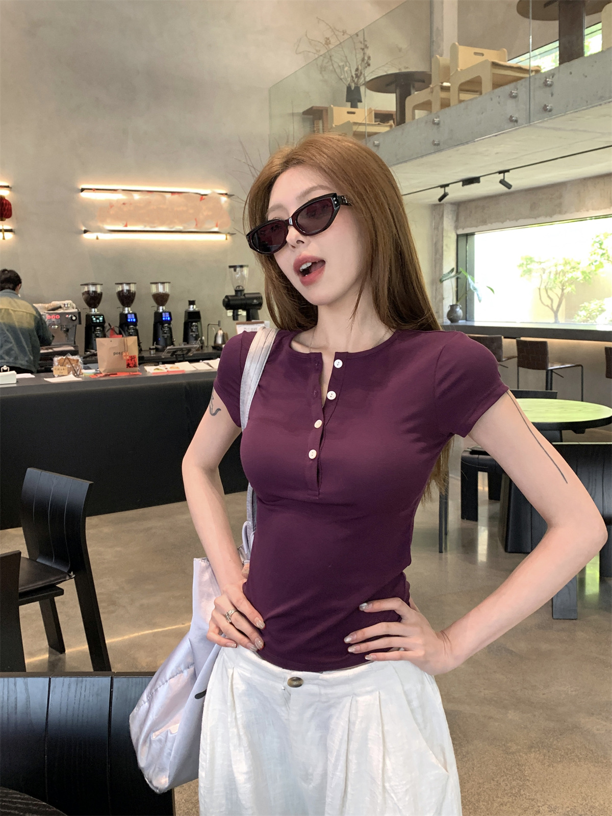 블루 반팔 어깨 티셔츠 여성용 여름 반 오픈 칼라 슬림 핏 슬림 핏 스파이스 걸스 내부 스트레치 타이트베이스 탑스토어 가기