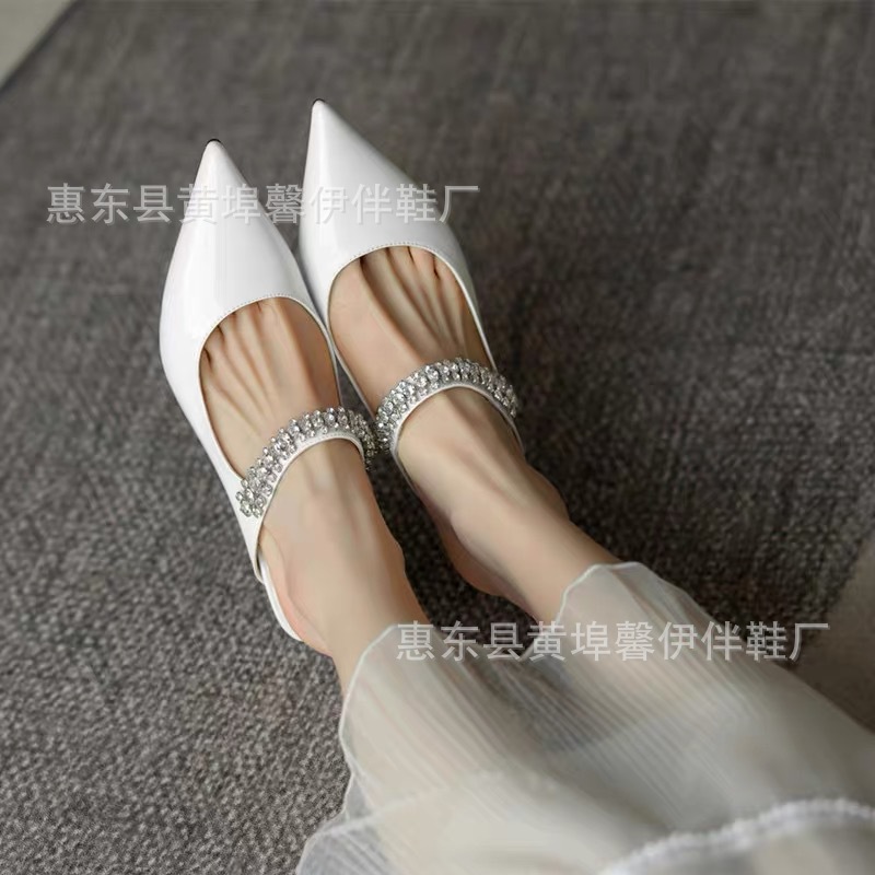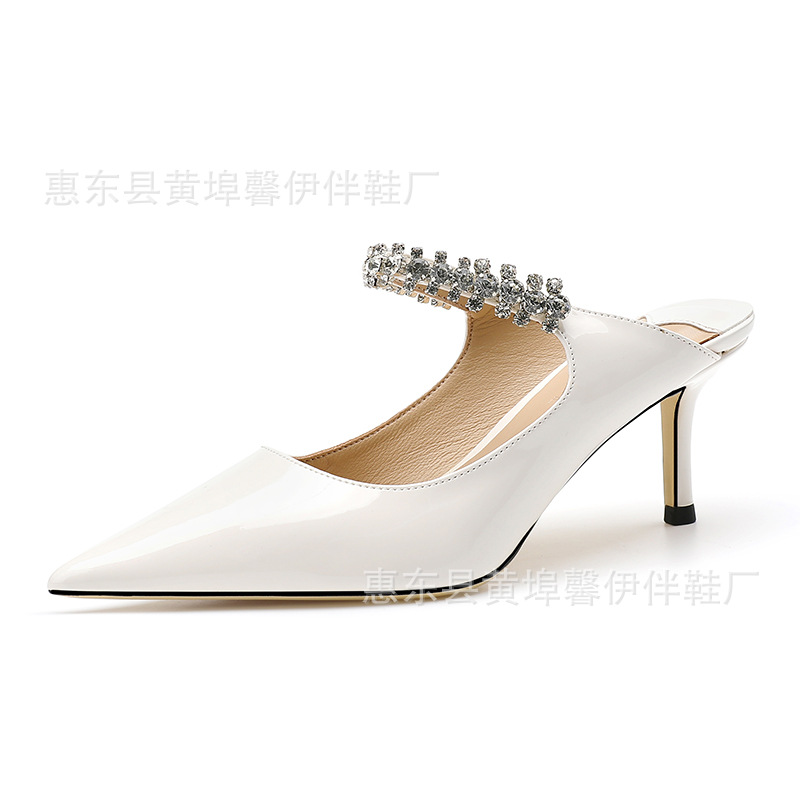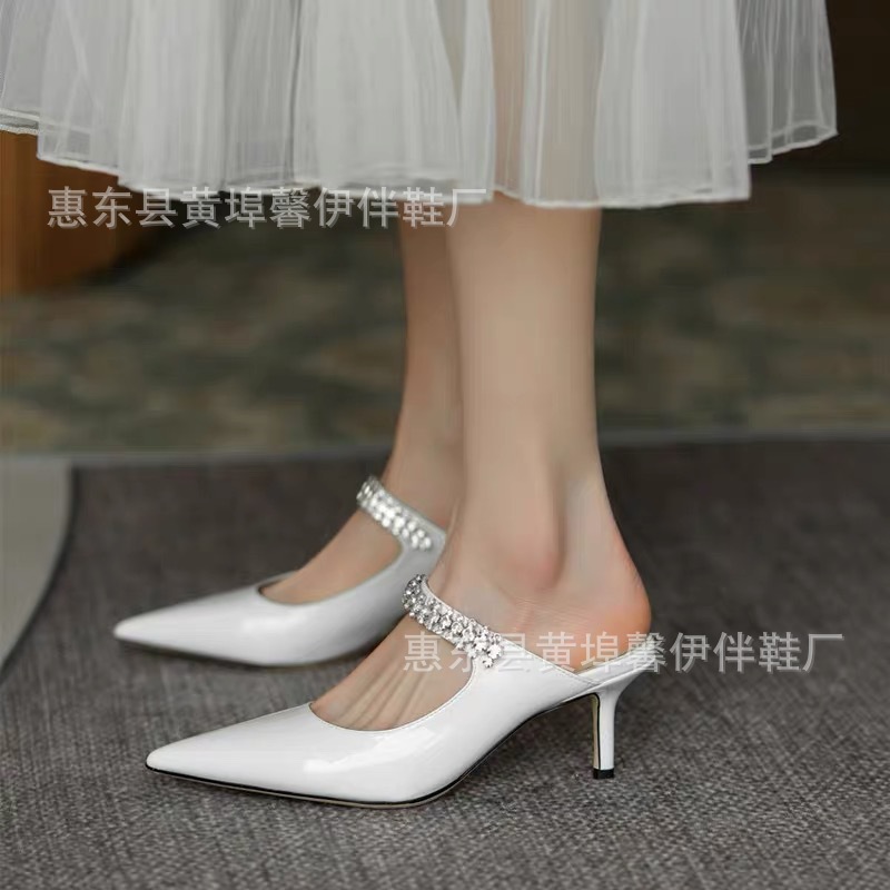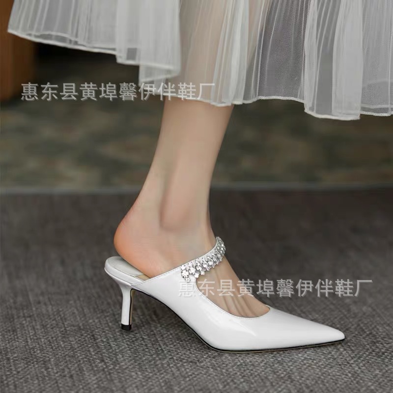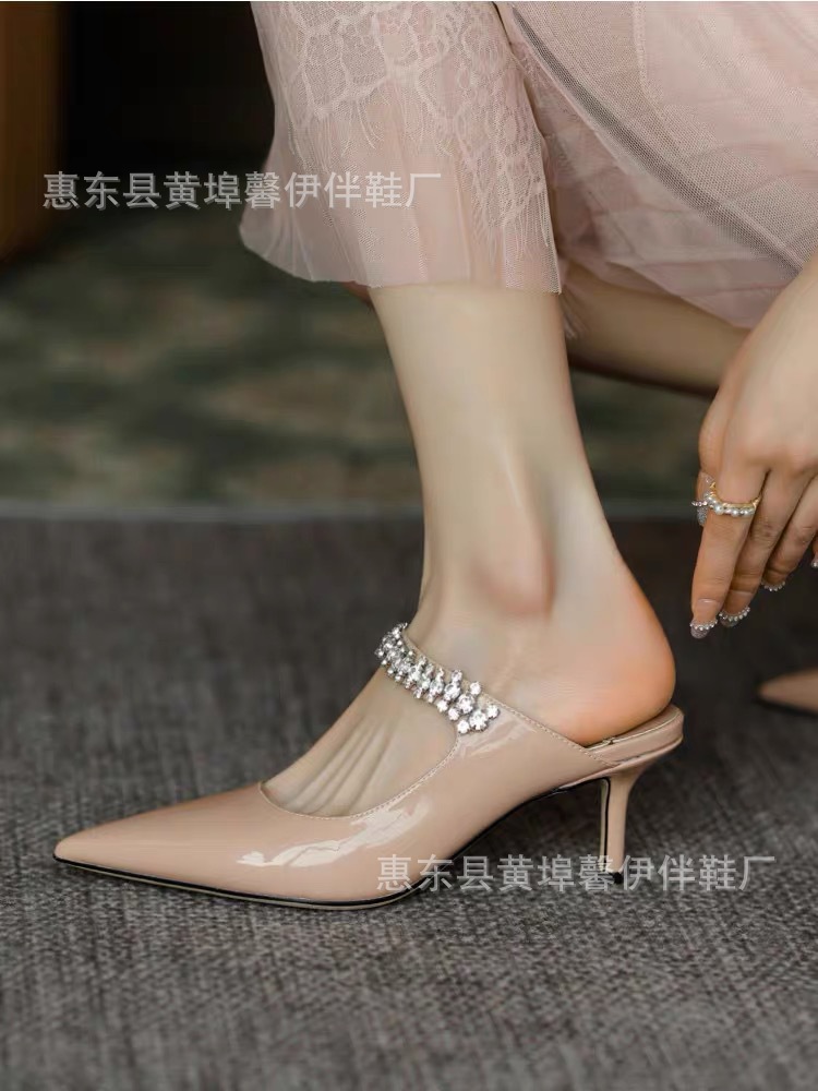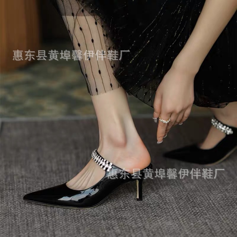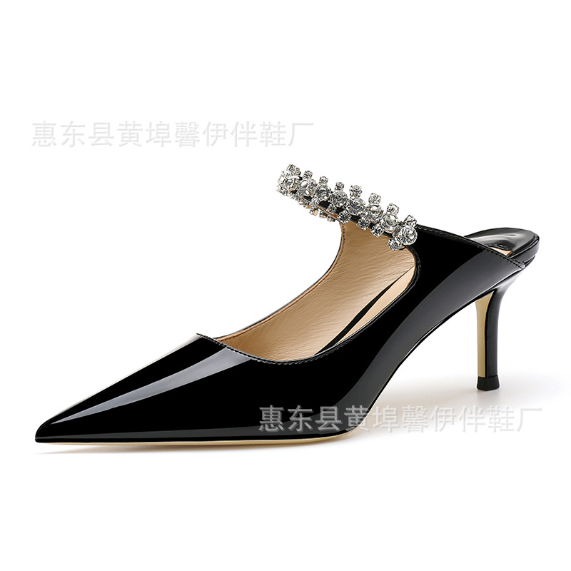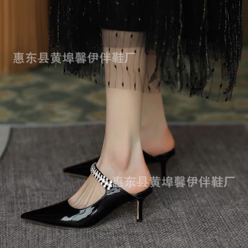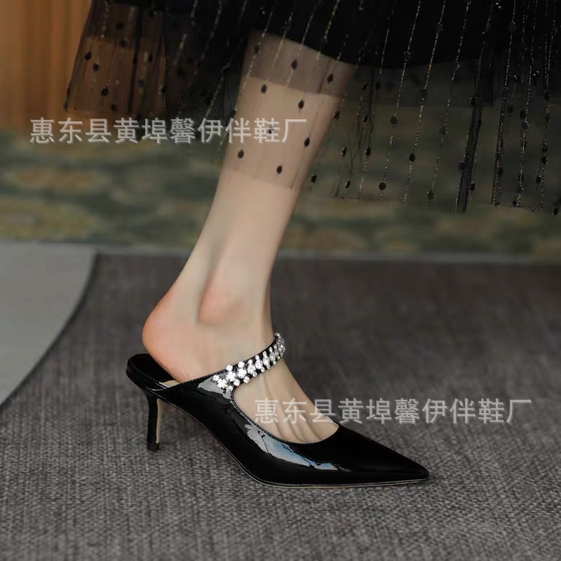 2025 봄과 여름 특허 가죽 뾰족한 발가락 Baotou 하이힐 라인스톤 슬라이드, 여성용 스틸레토 힐 뮬러 샌들 및 슬리퍼스토어 가기