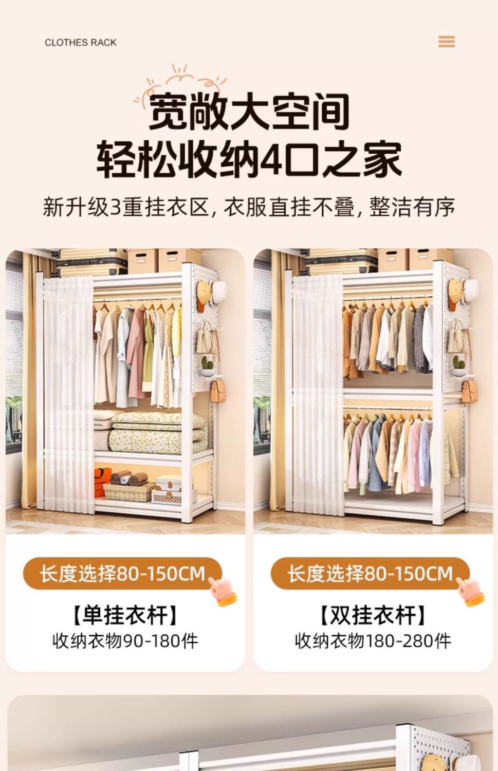 • 싱글랙 3단 - 길이 150*높이 198cm [이중옷장레일]