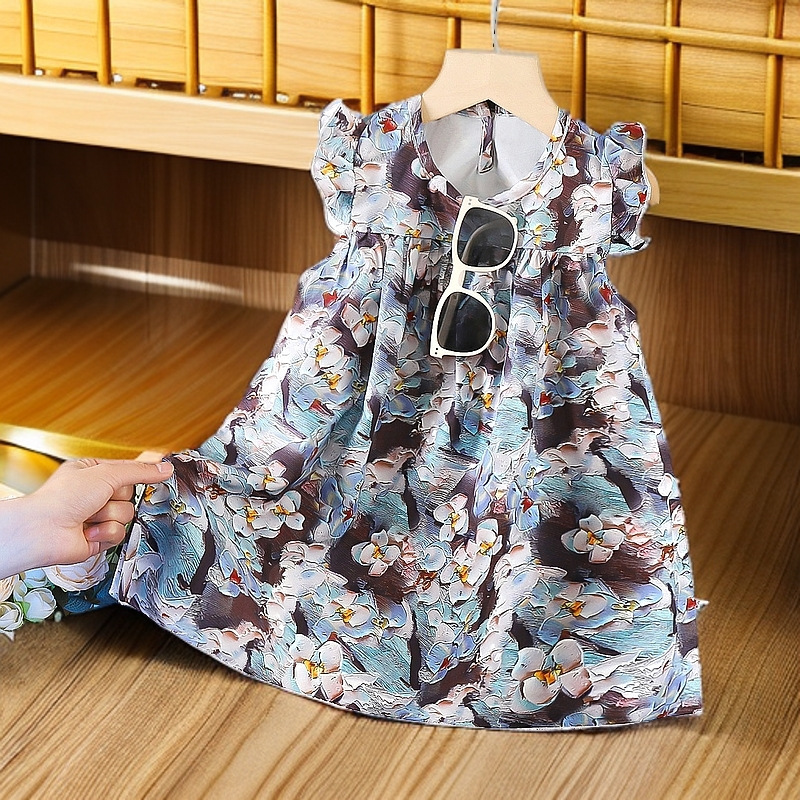 새로운 여자 꽃 패턴 비행 어깨 소매 인형 셔츠 스커트 탑 원피스 한국 아동복 2025 머리카락의 세대