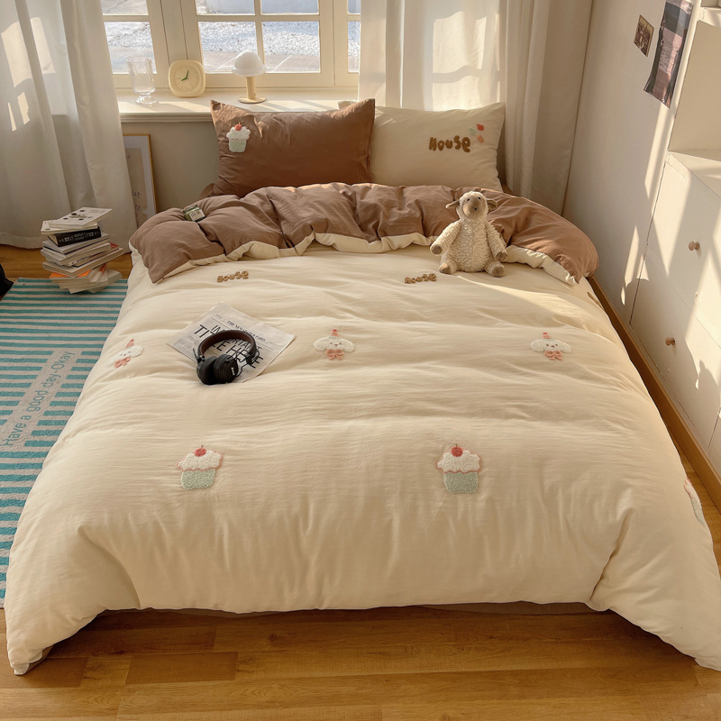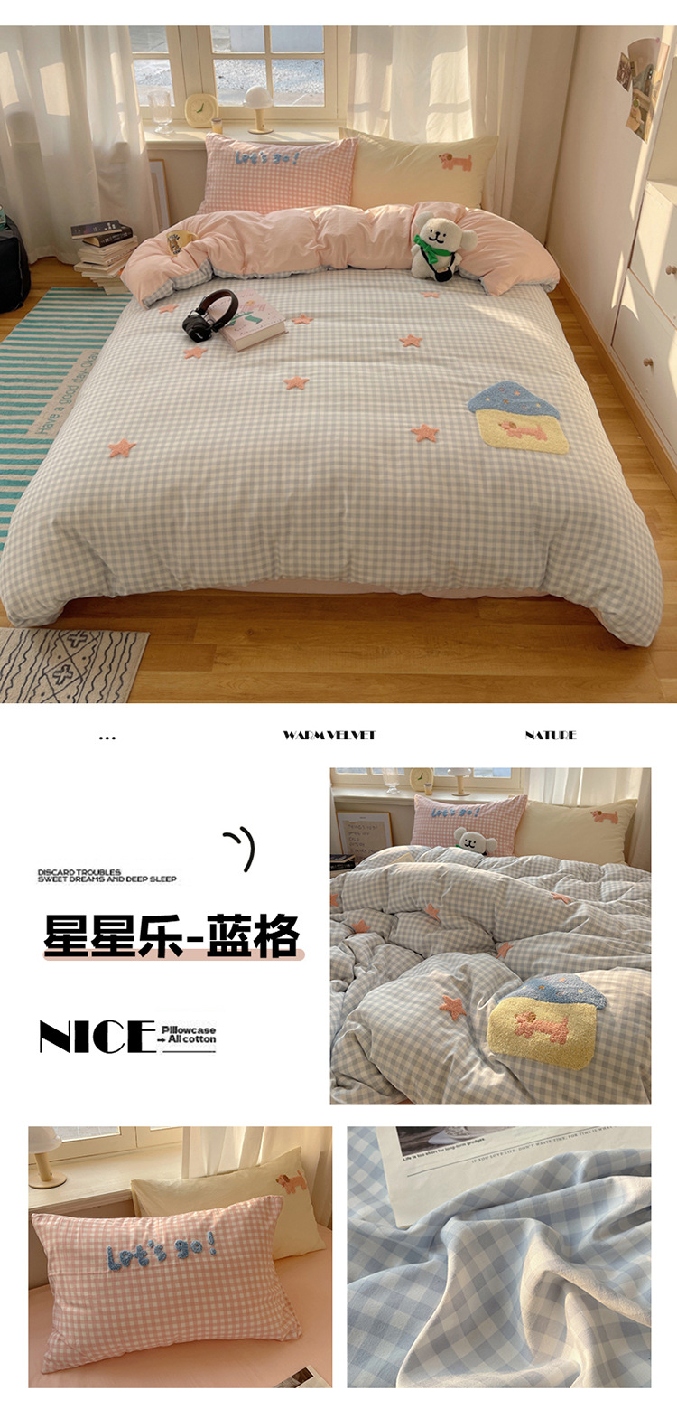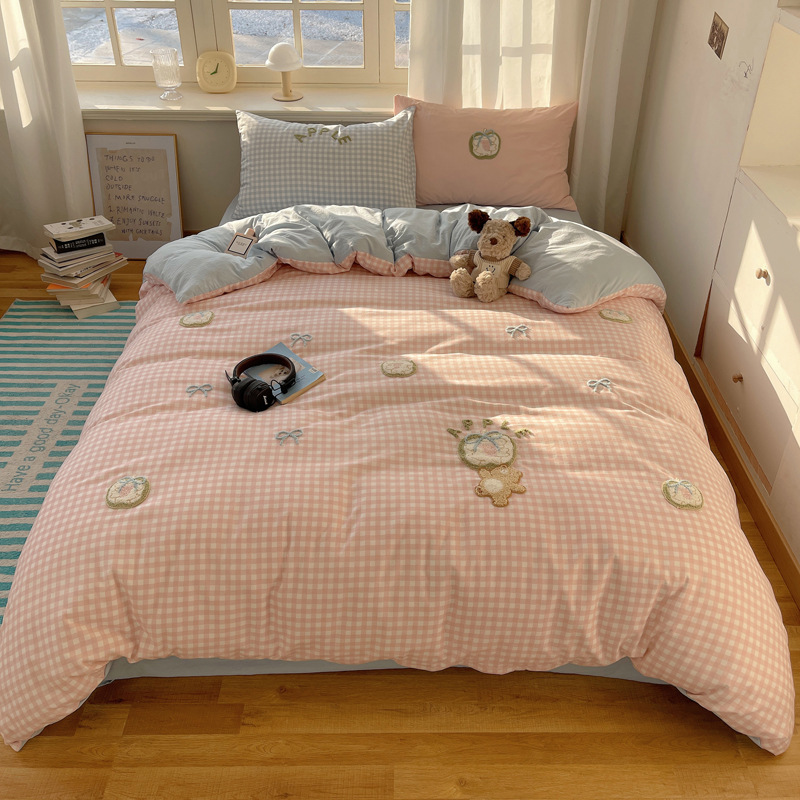 2025 새로운 귀여운 소녀 씻은 면화 타월 수 놓은 누드 수면면 솔리드 컬러 체크 더블 4 피스 세트