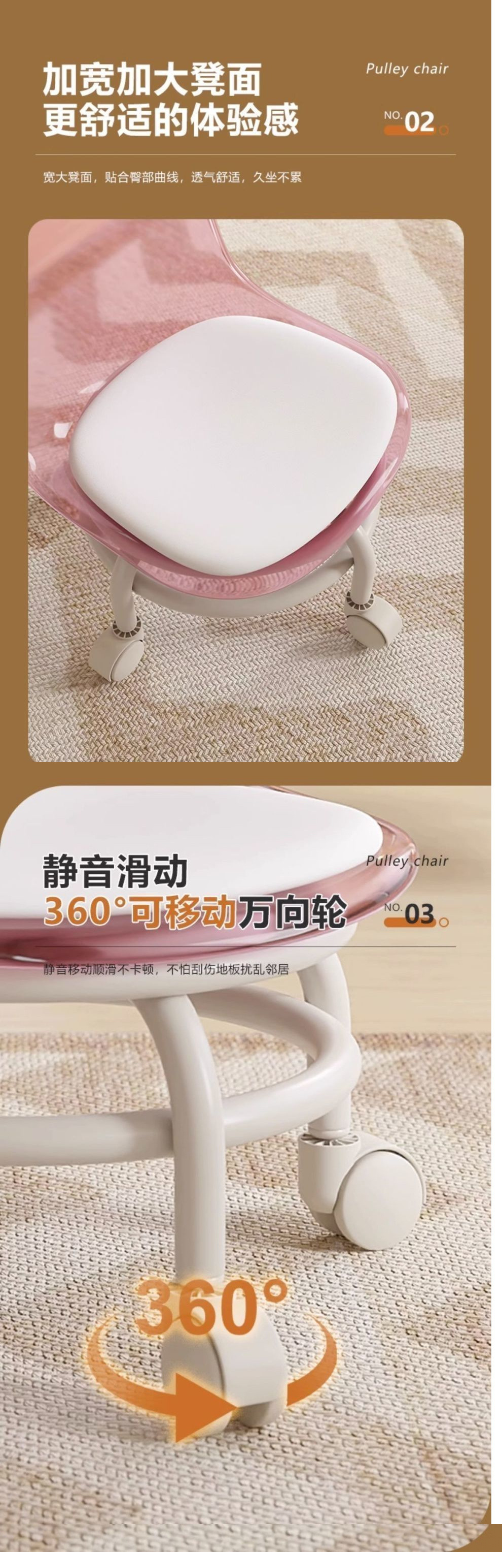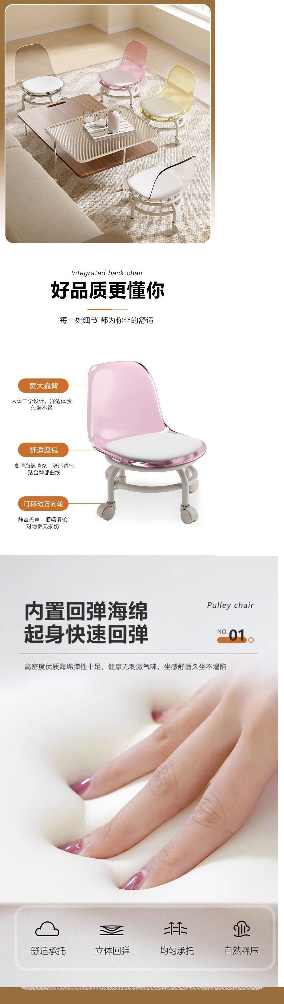 아크릴 의자 사일런트 유니버설 휠 풀리 작은 의자 가구 낮은 의자 아름다운 바느질 움직일 수 있는 등받이 의자 회전스토어 가기