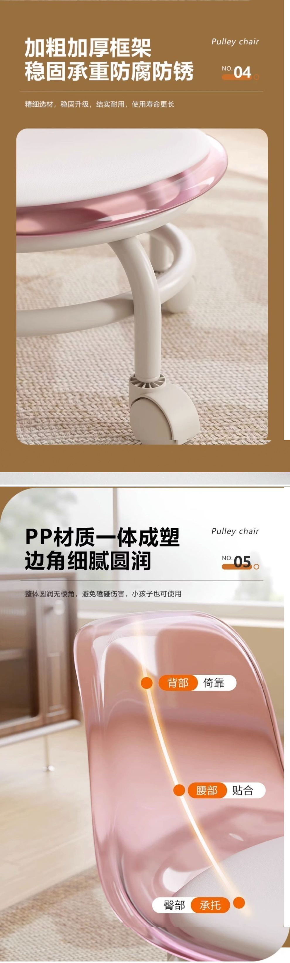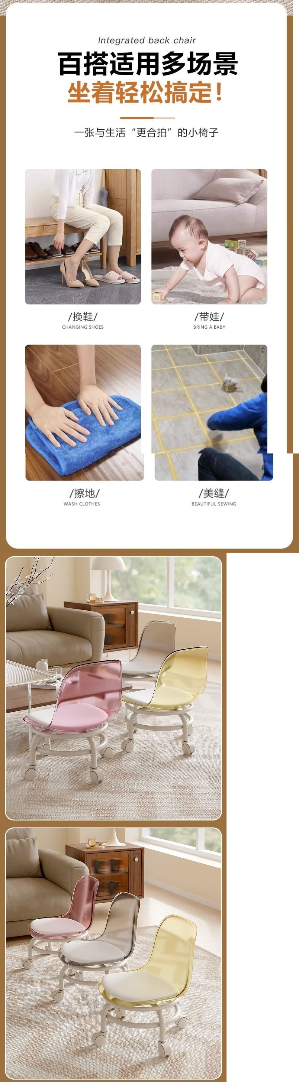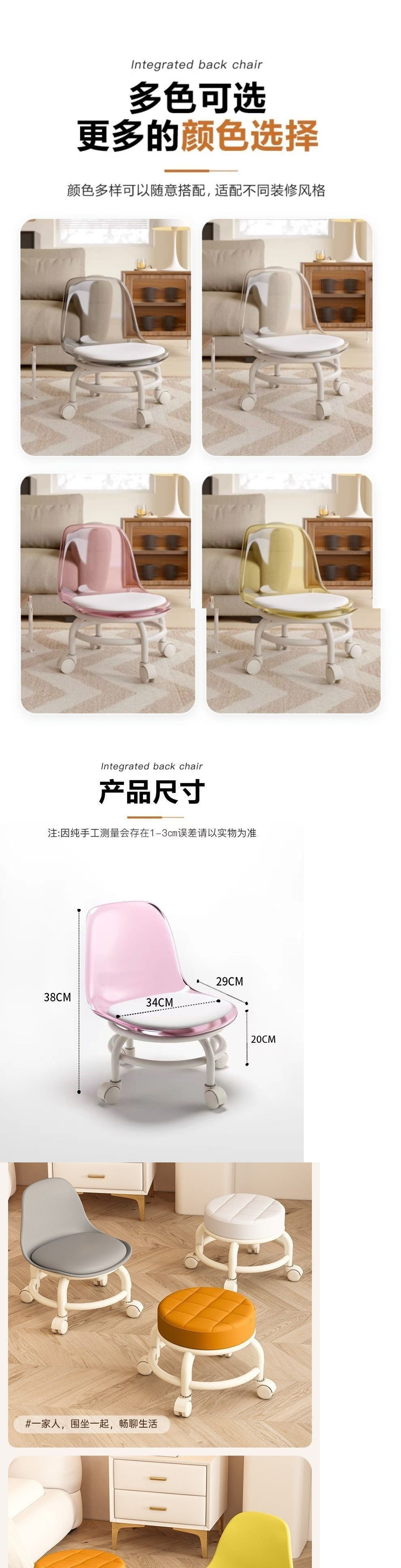 아크릴 의자 사일런트 유니버설 휠 풀리 작은 의자 가구 낮은 의자 아름다운 바느질 움직일 수 있는 등받이 의자 회전