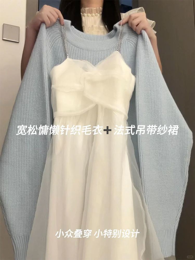 달콤하고 부드러운 스타일 흰색 첫사랑 슬립 스커트 세트 여성의 가을과 겨울 게으른 느슨한 크루 넥 긴팔 풀오버 스웨터
