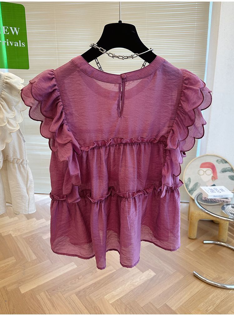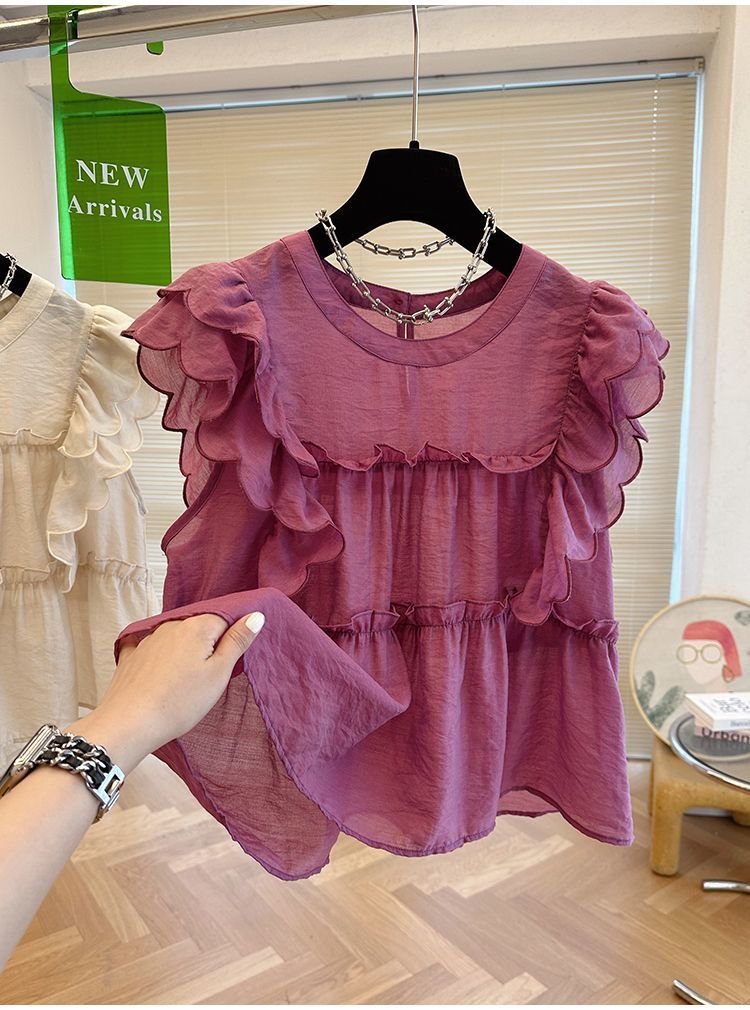 프렌치 스타일의 러플 소매와 라운드 넥 여성용 여름 셔츠, 달콤한 인형 스타일의 루즈핏, 독특하고 세련된 민소매 탑