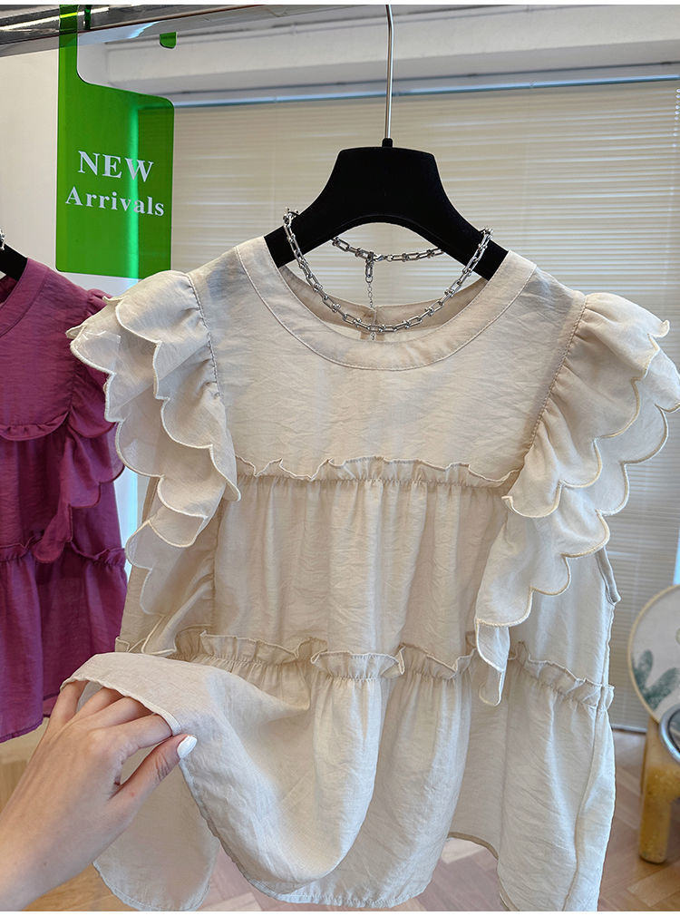 프렌치 스타일의 러플 소매와 라운드 넥 여성용 여름 셔츠, 달콤한 인형 스타일의 루즈핏, 독특하고 세련된 민소매 탑스토어 가기