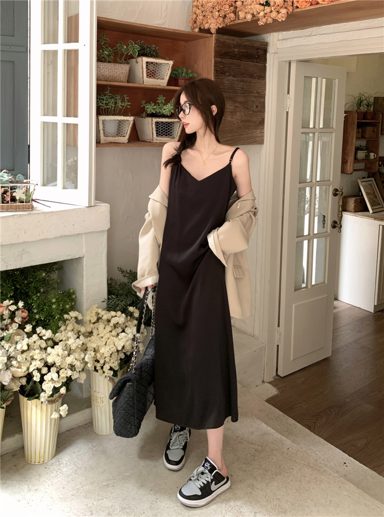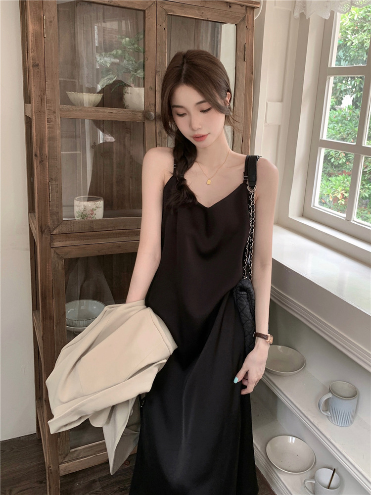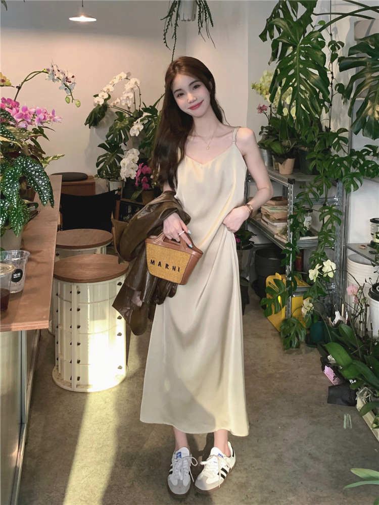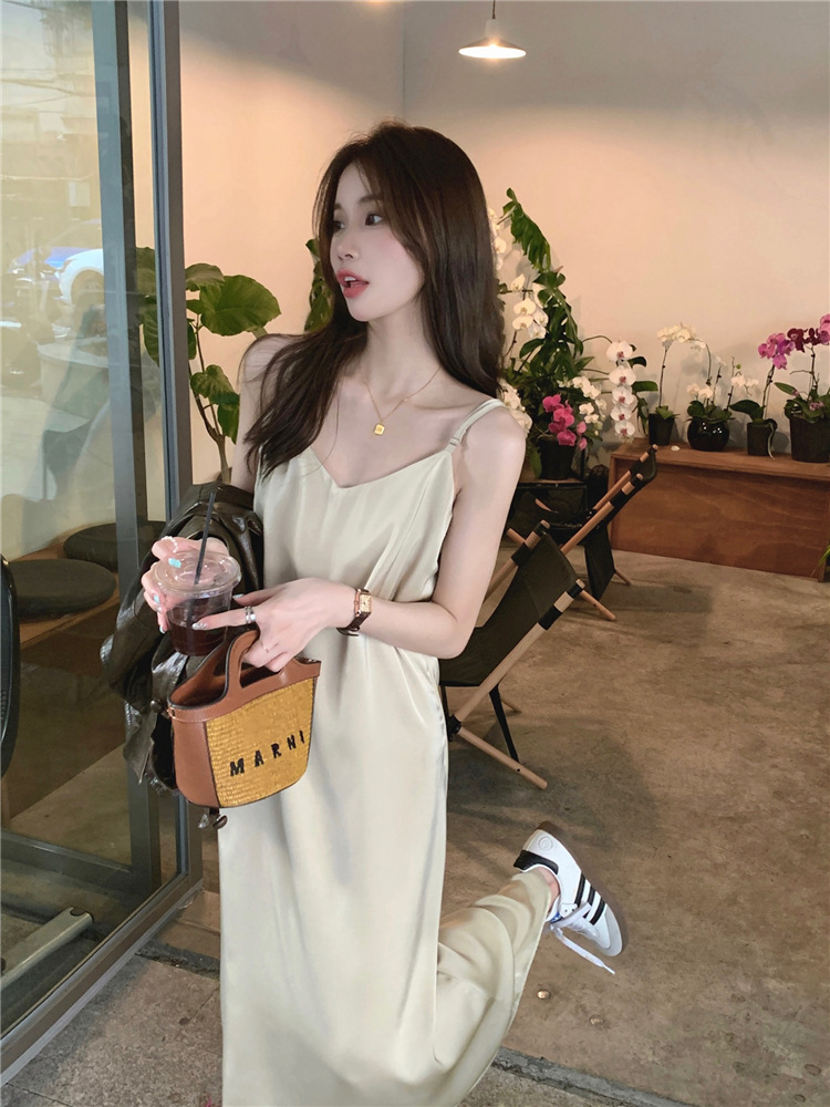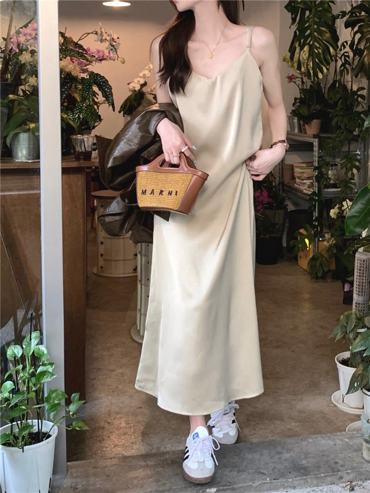 리얼 샷 프렌치 스타일 올 매치 V 넥 모방 아세트산 슬링 원피스 간단한 느슨한 우아한 펜던트 슬림 핏 긴 원피스