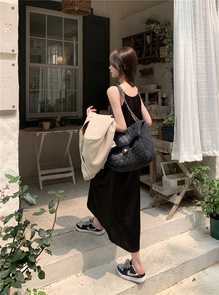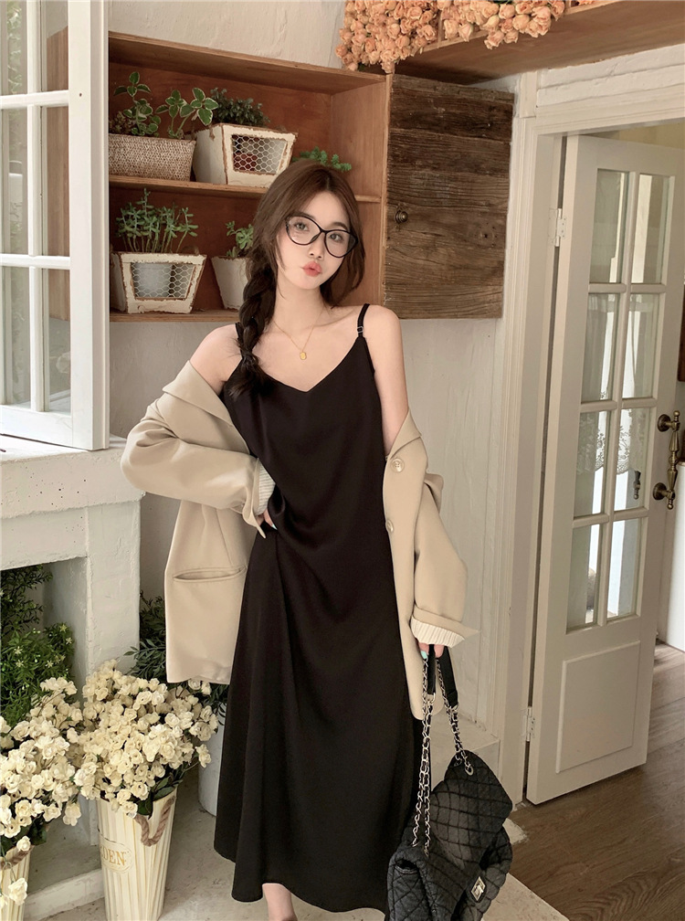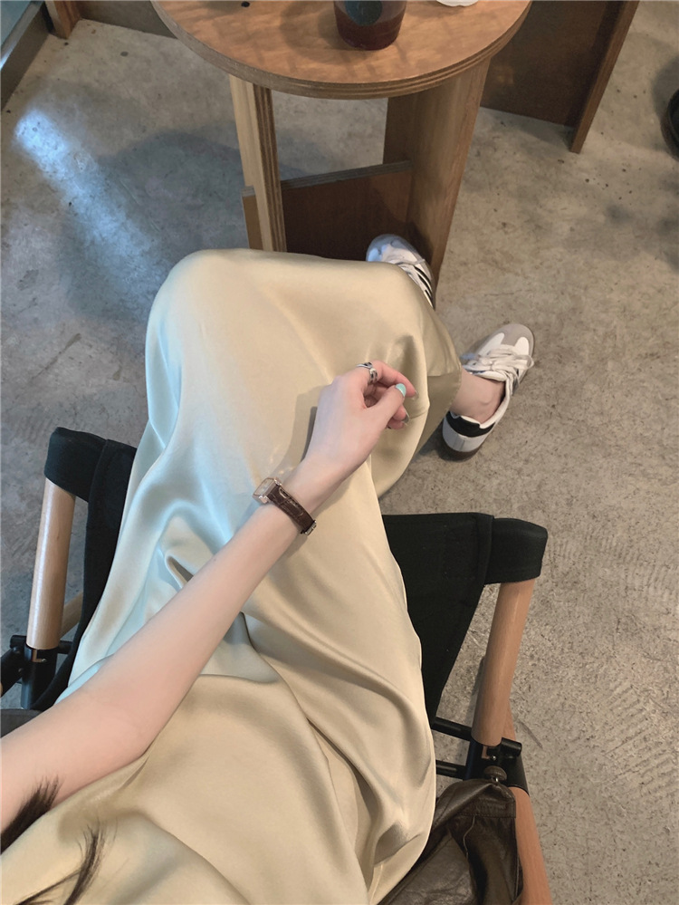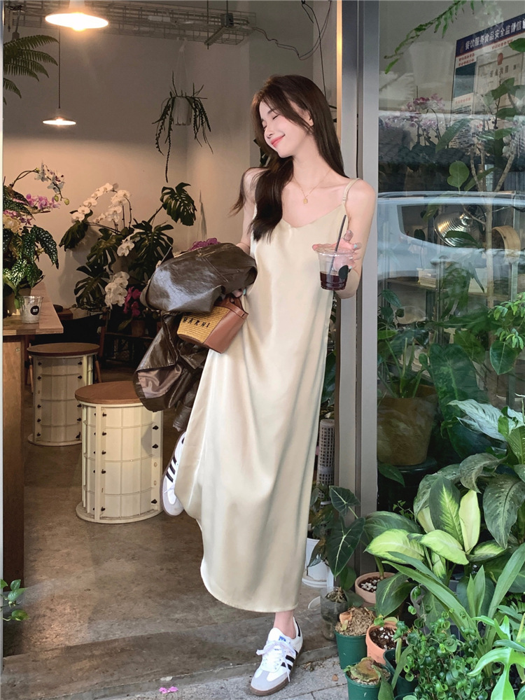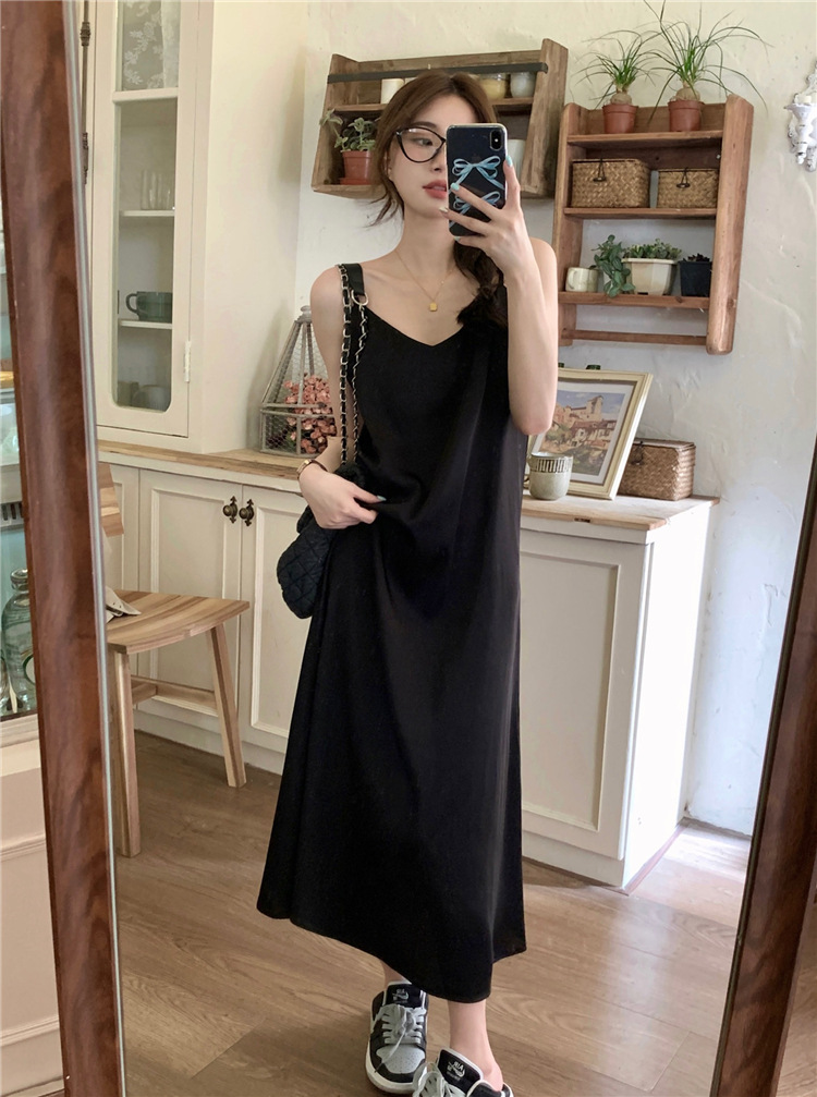 리얼 샷 프렌치 스타일 올 매치 V 넥 모방 아세트산 슬링 원피스 간단한 느슨한 우아한 펜던트 슬림 핏 긴 원피스