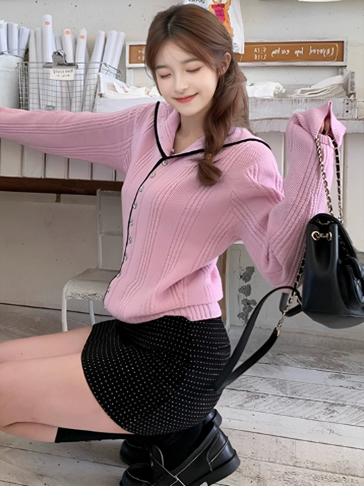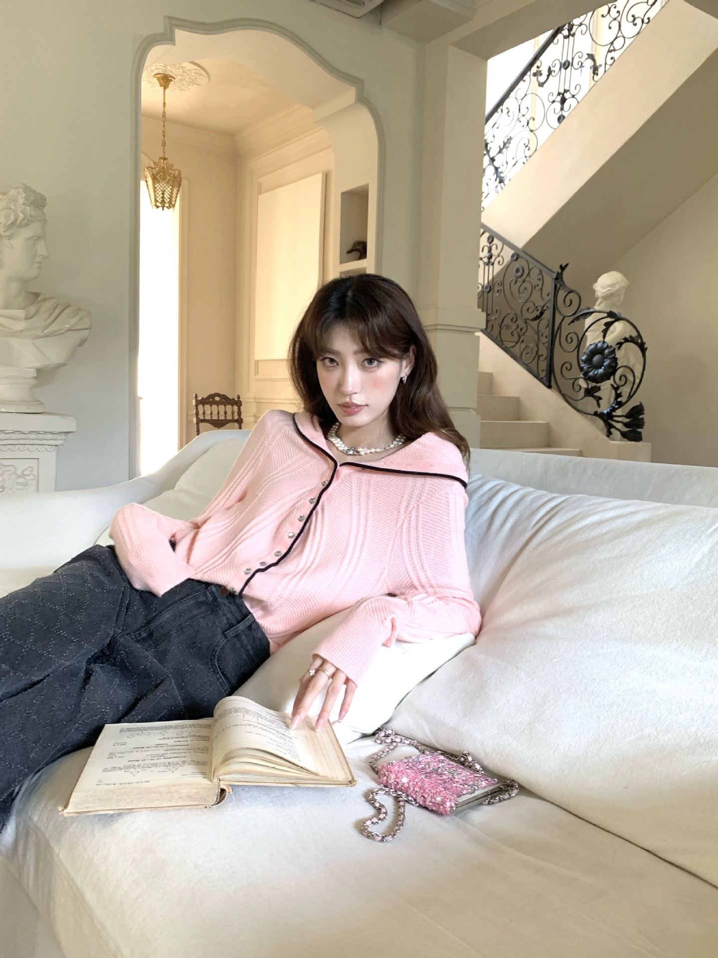 백투 스쿨 한국 여성 대비 게으른 해군 칼라 니트 스웨터 카디건 슬림 우아한 탑스토어 가기